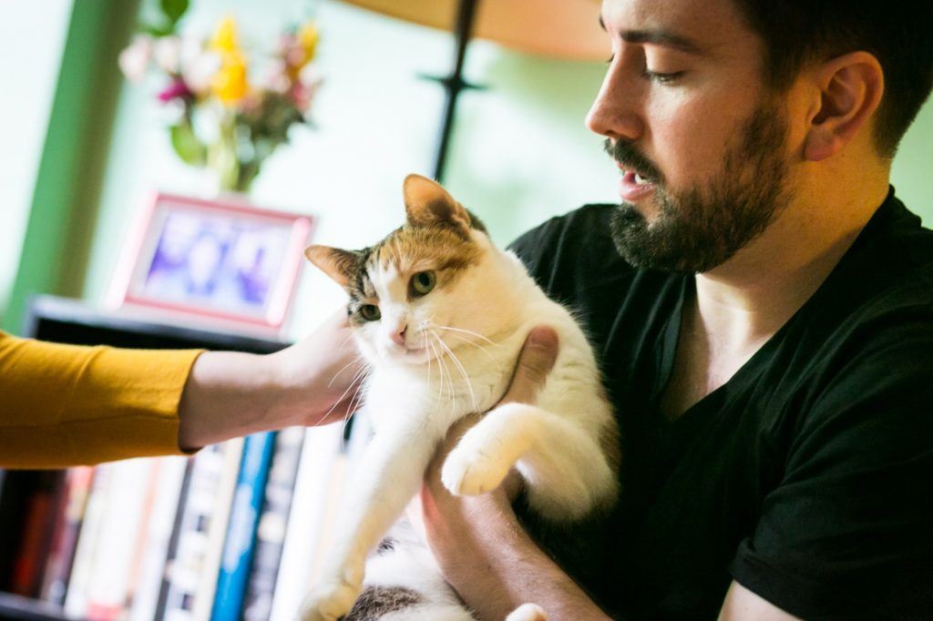 The couple passed this ‘test’ with flying colors! We started the engagement session as all great sessions do — by including the family furbaby in the photo shoot. Sneakers is Emily and Ben’s seven-year-old cat. And while Sneakers was not pleased at having her weekend disturbed by my camera, she did sit still long enough for a few photos. It helps that I brought along some salmon-flavored cat treats to bribe her into sitting pretty.