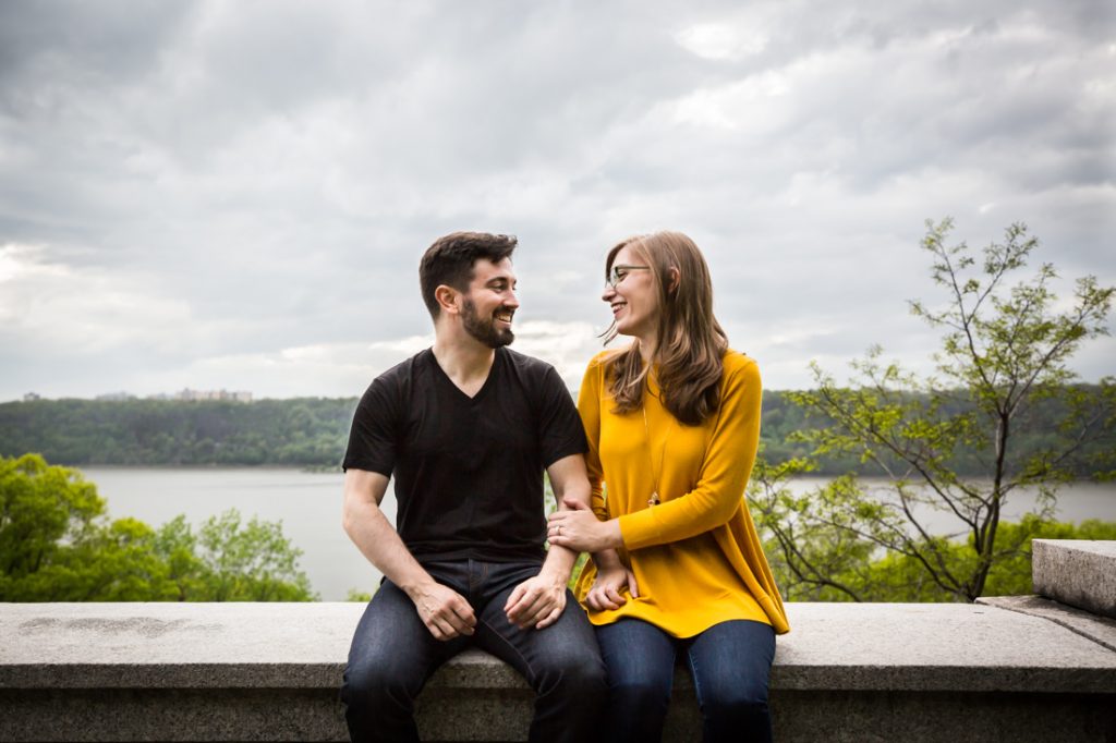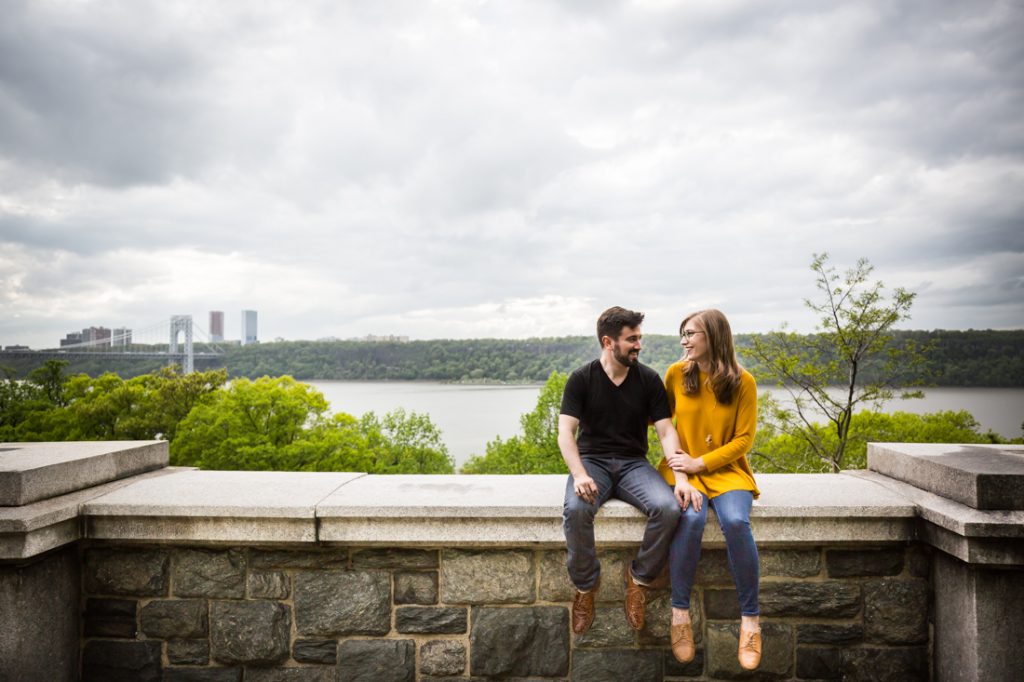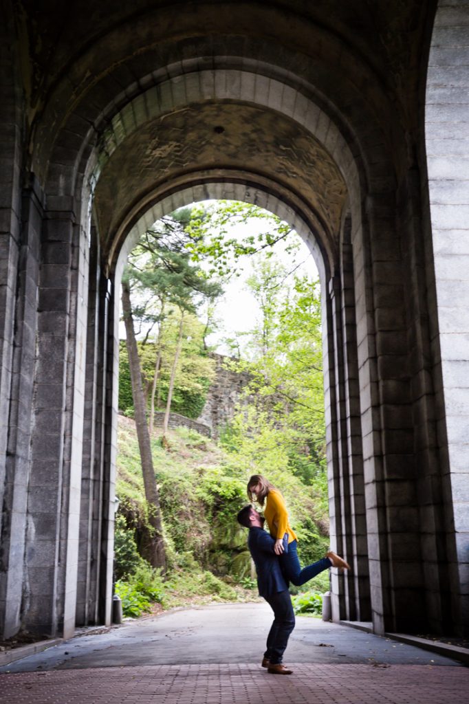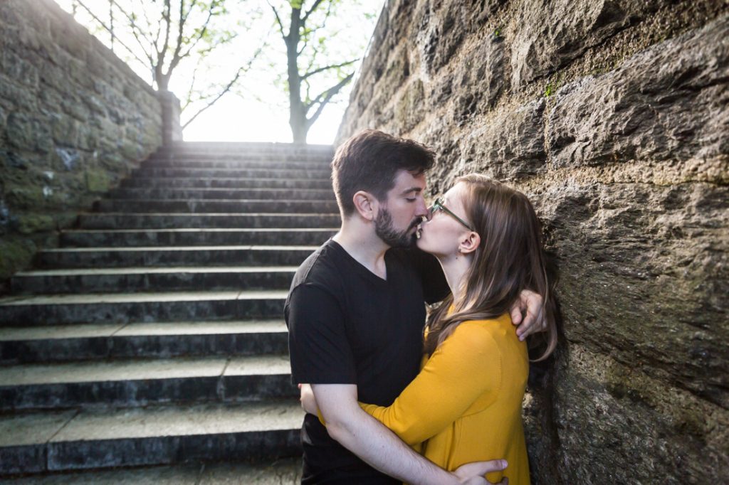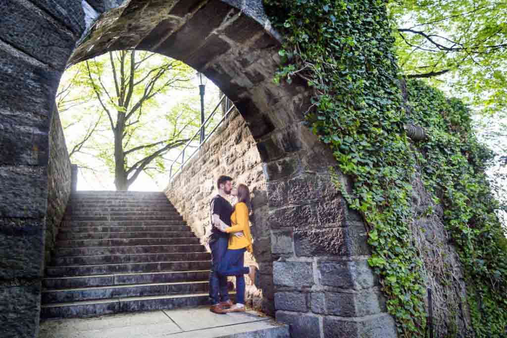 With a few photos under our belt, we next headed to Fort Tryon Park. This is the couple’s neighborhood park and home to the Cloisters Museum. Sadly, the Cloisters was still keeping winter hours during our session, and closed at 4:15 p.m. The park was a beautiful enough setting for our shoot, however, and the green trees were a welcome sign that spring is finally here.