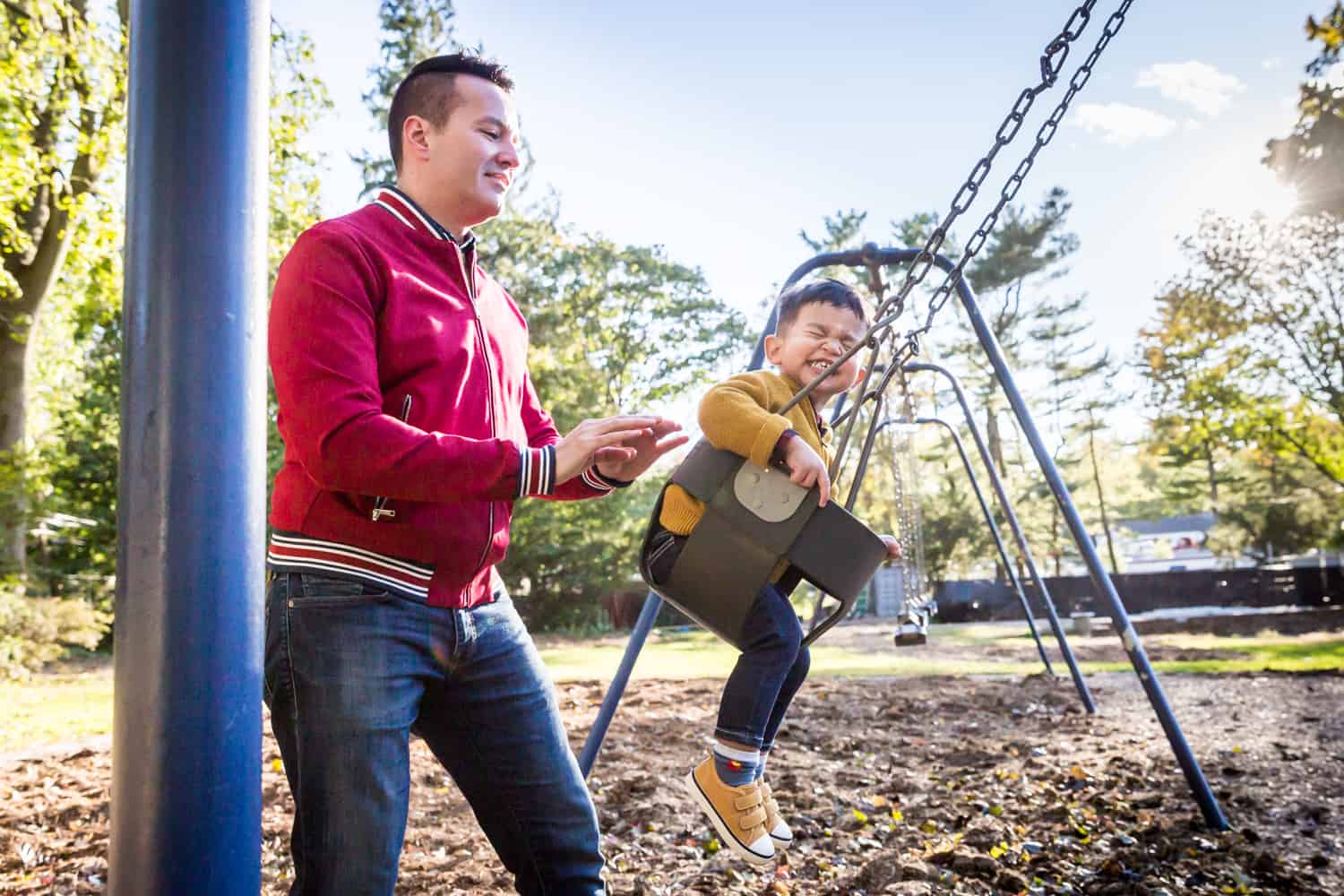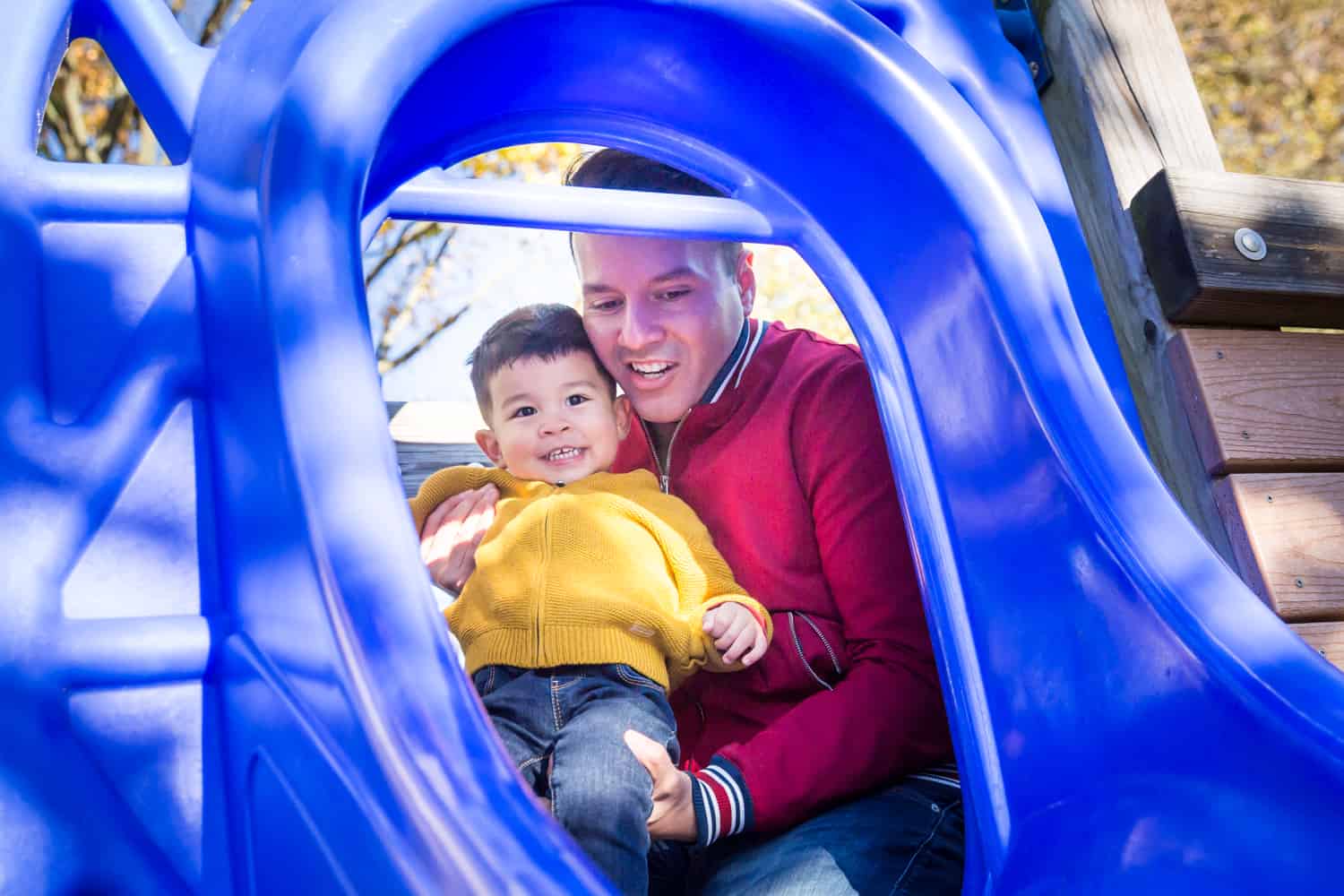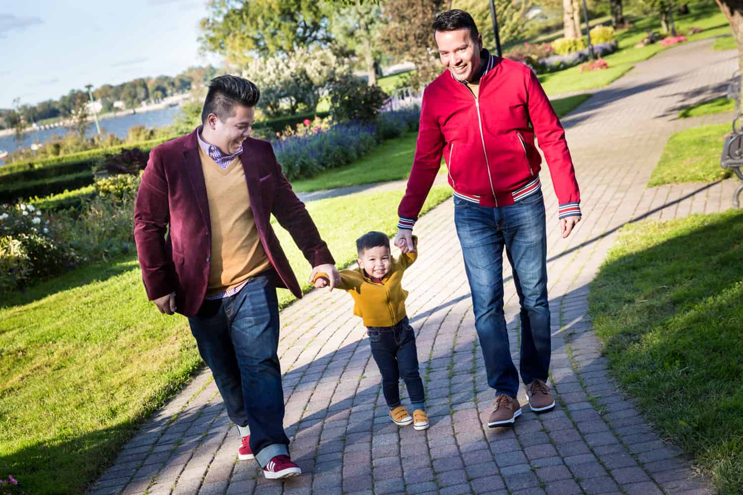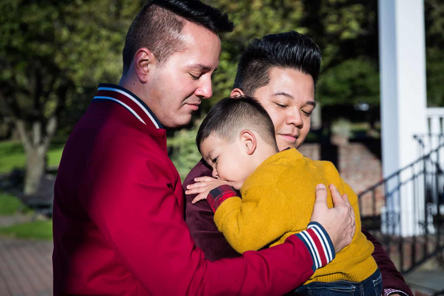 My Great Neck family portrait session with Aldrin and Mike definitely did not disappoint. Sebi is a delightful little kid and full of energy. The original plan was to head out to Steppingstone Park. This is a precious waterfront park that has a good playground. Unfortunately, while the sun was bright and shining, the wind was howling furiously making everyone – especially Sebi – chilled to the bone. We spent some time at the playground, but after a bit Sebi had enough of the cold and wanted to head back home. Luckily, Aldrin and Mike had a great standby plan to use the open patio in their apartment complex as a photo backdrop. Problem solved!