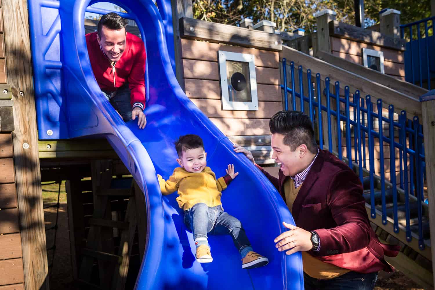 Always plan two or three activities for each photo shoot, especially if there are young children involved. For Aldrin and Mike’s family portrait session, the park offered a multitude of activities, including running and jumping with Sebi, and of course, the playground. For most families, I recommend not hitting the playground until the very end of a session simply because your children will only be interested in playtime rather than portrait time. For the patio part of Aldrin and Mike’s family portrait session, these dads were again ready with books and toys to entertain little Sebi. For your own session, you could play games together – be it a sport or board game – or do an art project or cook together. In general, anything you like doing together as a family will look good on camera (except, of course, staring at your respective cell phones).