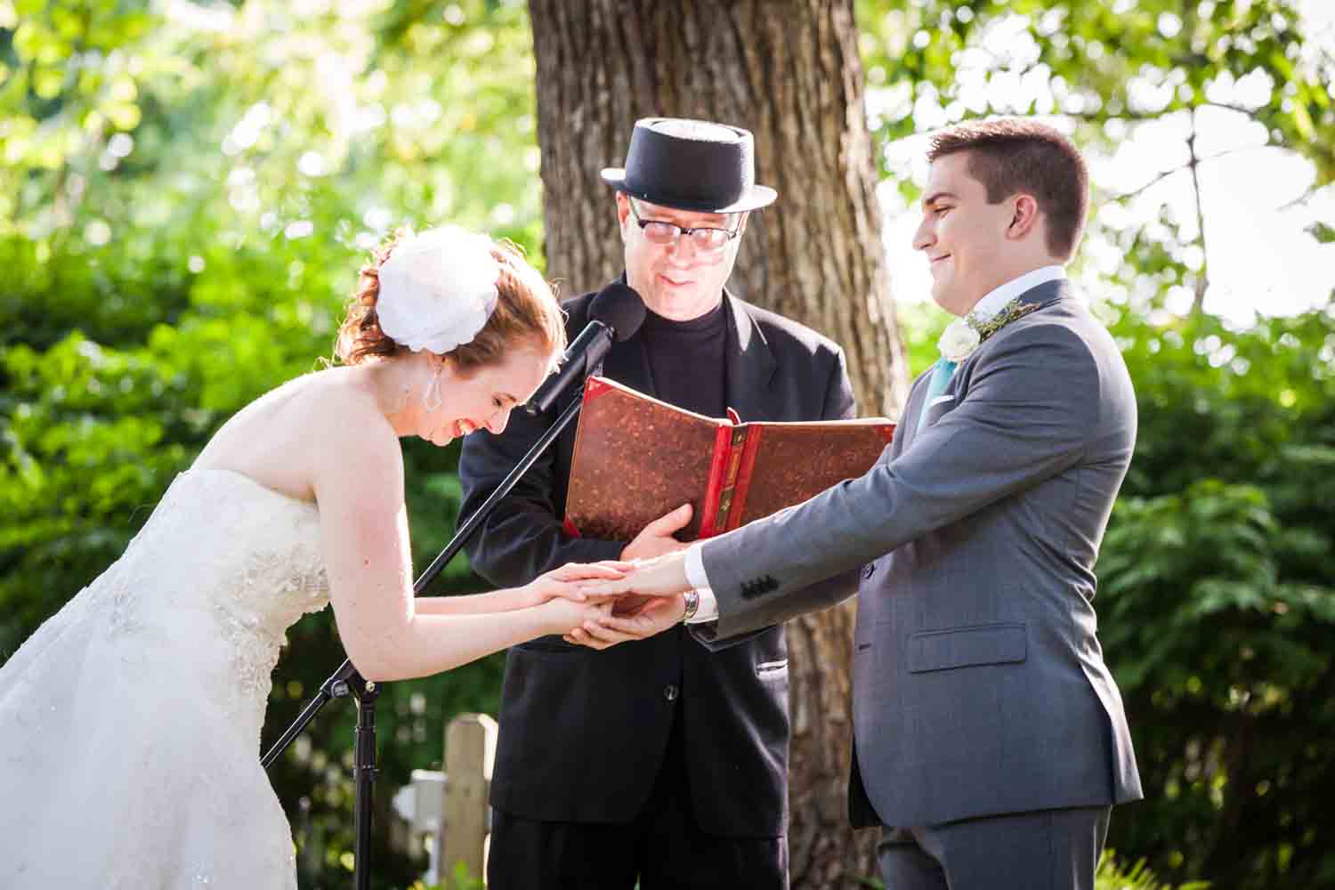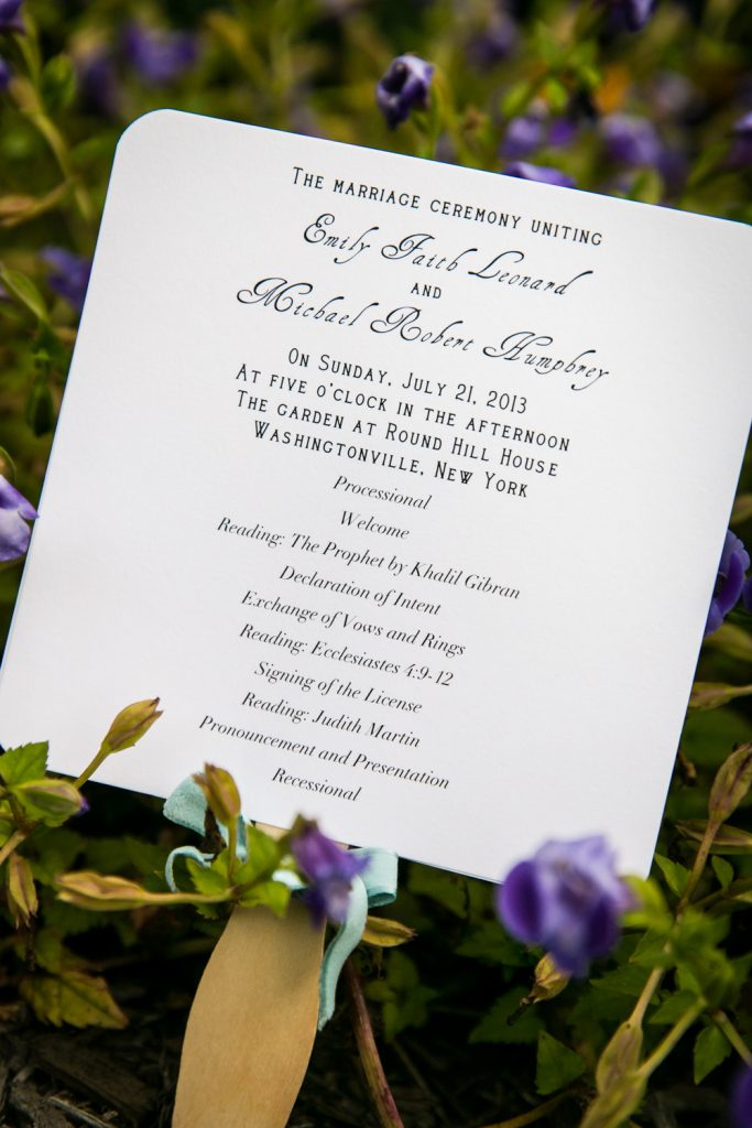 Emily and Mike were blessed with beautiful weather for their big day. The ceremony was held outside with cocktails on the front veranda. To keep guests cool and comfortable, the wedding program was printed on fans which were handed to each guests. The evening ended with a treat for guests: a gelato station where guests could pick their favorite flavors and toppings.