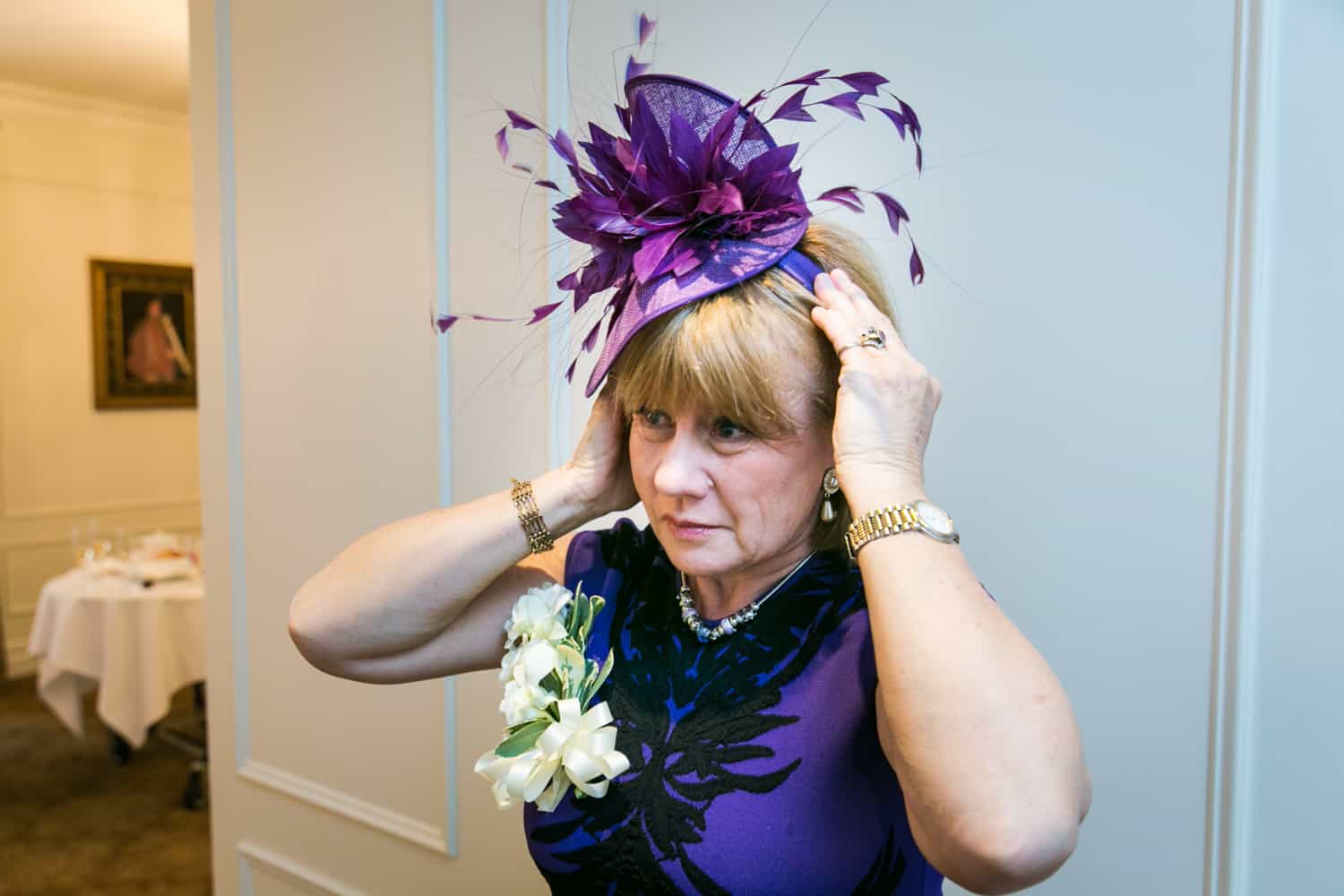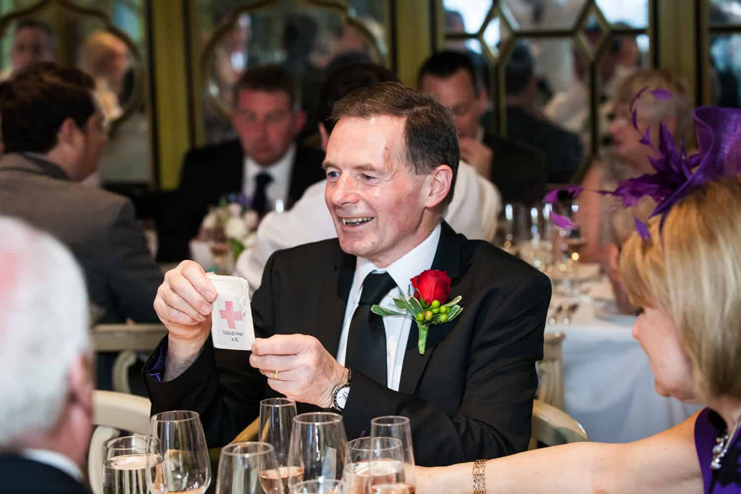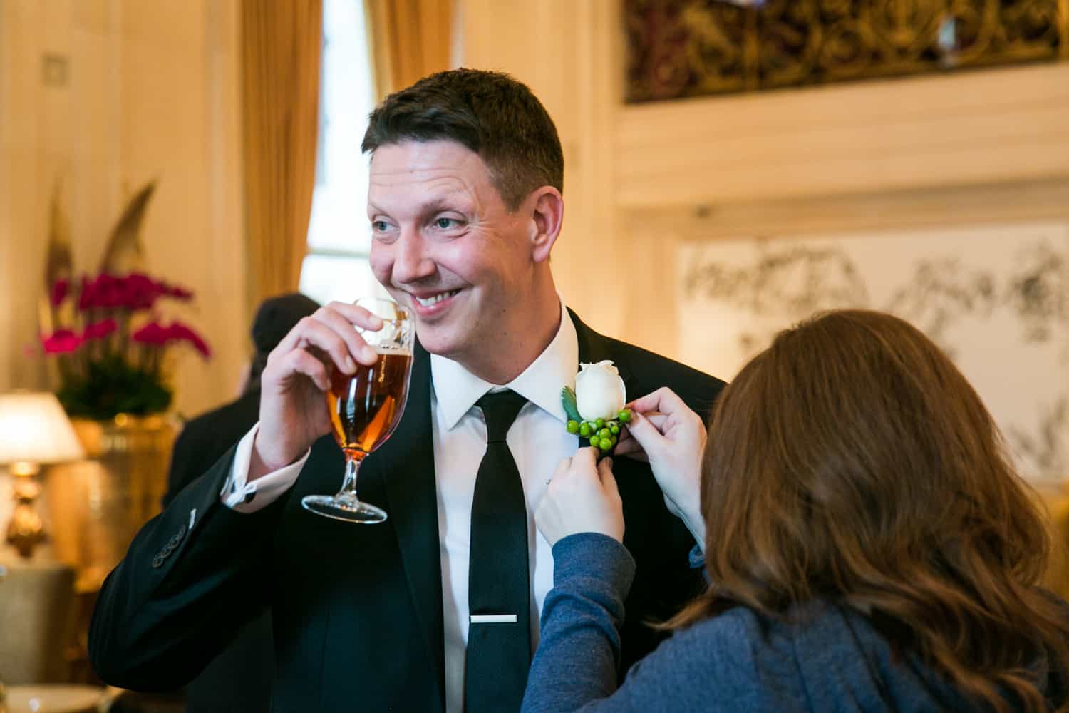 A little rain couldn’t dampen the mood, and after the ceremony the party moved to BG Restaurant for the Bergdorf Goodman wedding luncheon. Carol and her mother simply adore Bergdorf Goodman, so why not have the celebration there? Lunch was great: the meal started with deviled eggs and finished with tiny sweets. The wedding party had the entire private room in Bergdorf Goodman’s upstairs restaurant all to themselves. During the luncheon, the guests received mini hangover kits with candy and aspirin, which would definitely come in handy for the two after parties.
