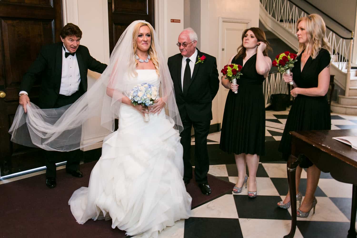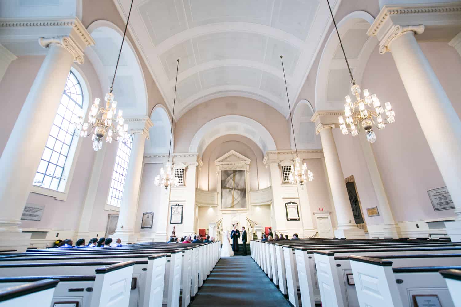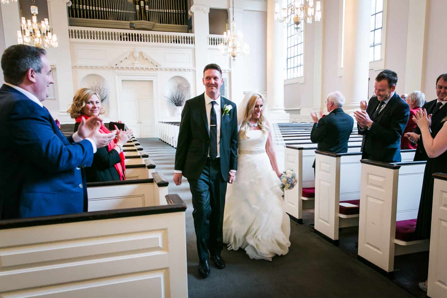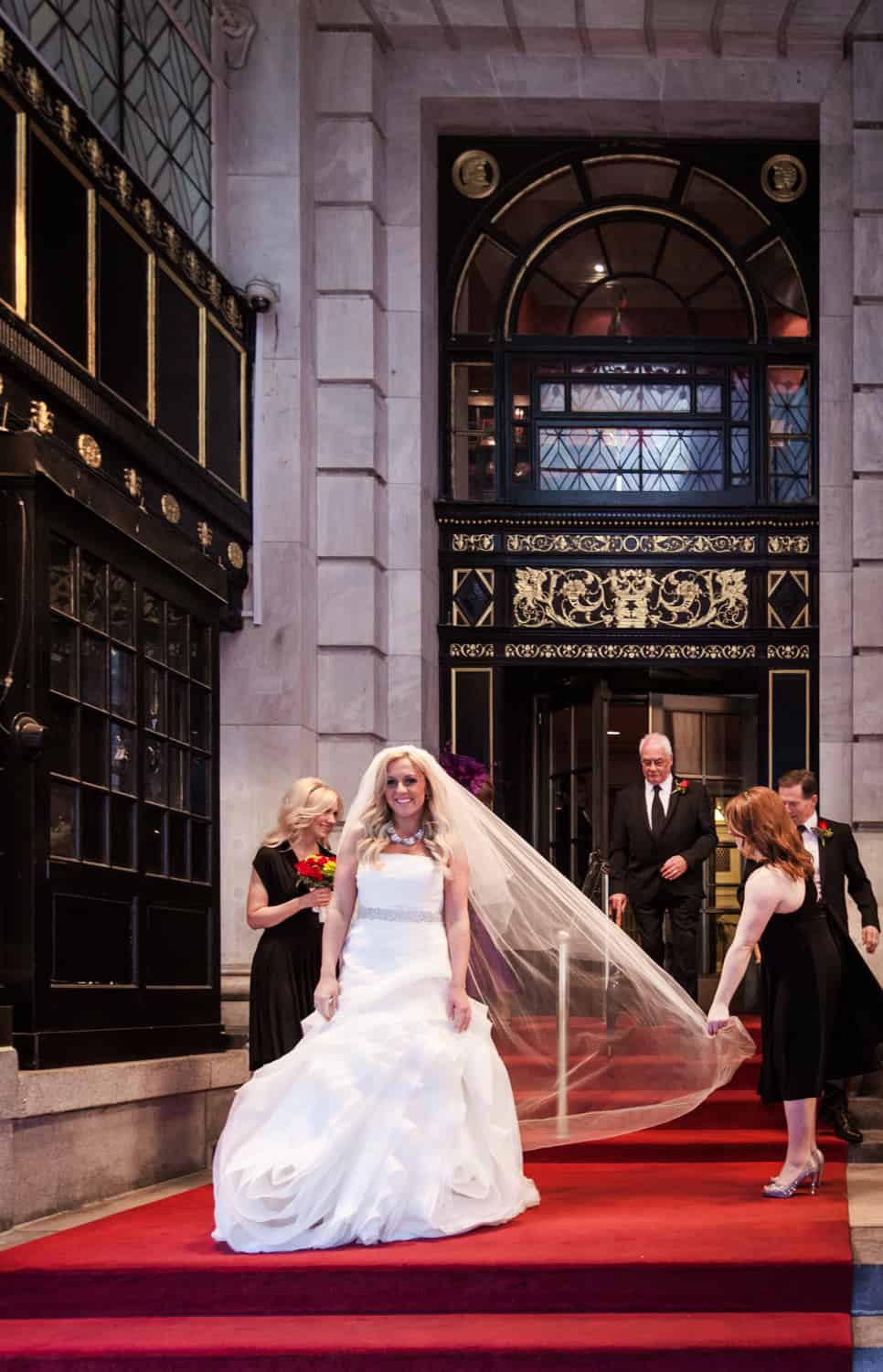 Carol and Chris’s wedding day began in classic New York fashion at the Plaza Hotel where the couple got ready. After zipping into her dress, Carol attached her veil and we headed uptown. The ceremony was held at All Souls Unitarian Church on the upper east side, and was simply beautiful. With only 22 guests, the wedding party had the sanctuary all to themselves. But why hire the church choir when you can get David Letterman’s Late Show Gospel Choir? The choir was captivating, and their voices filled the space. It was a bit like having a theater performance during the ceremony.