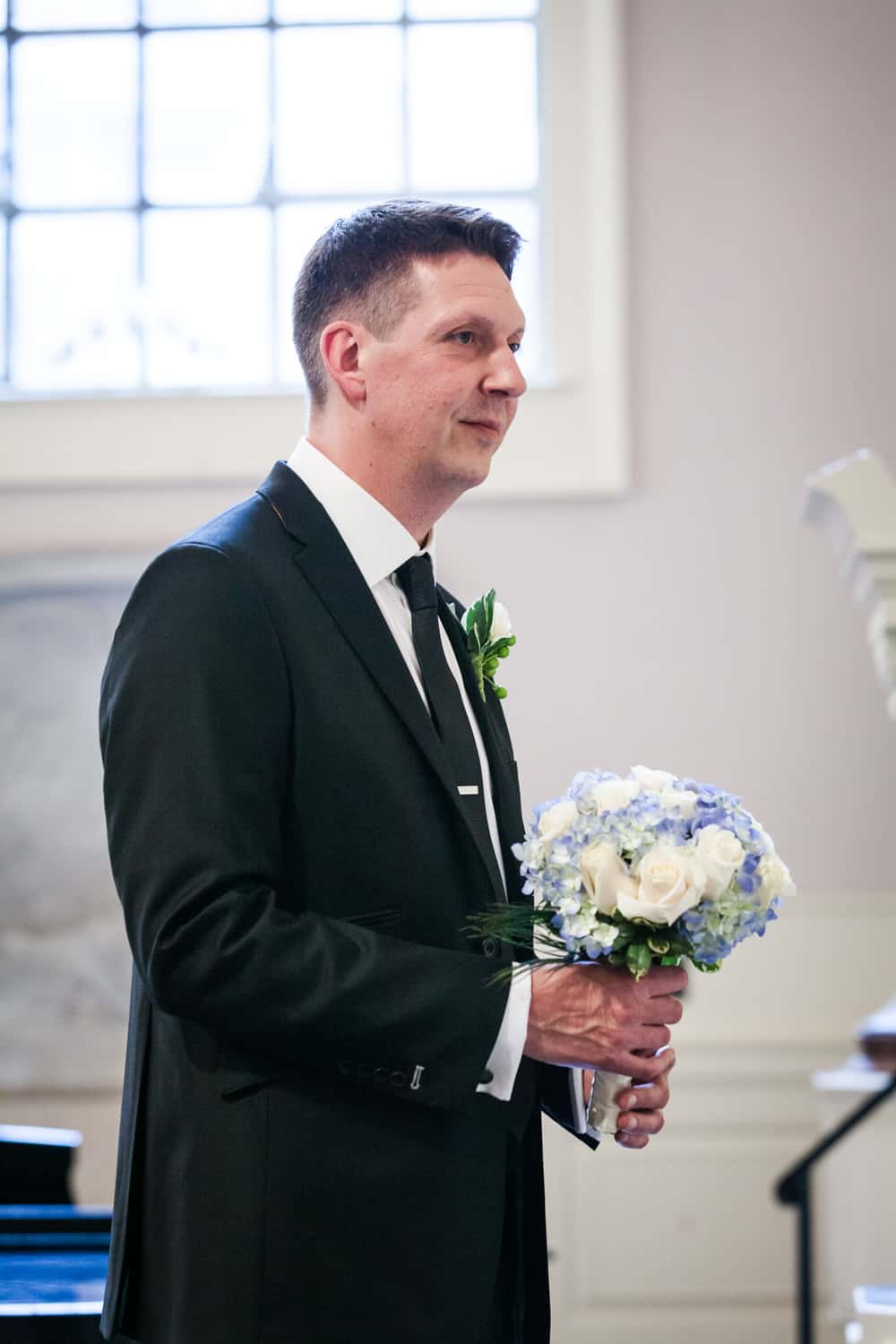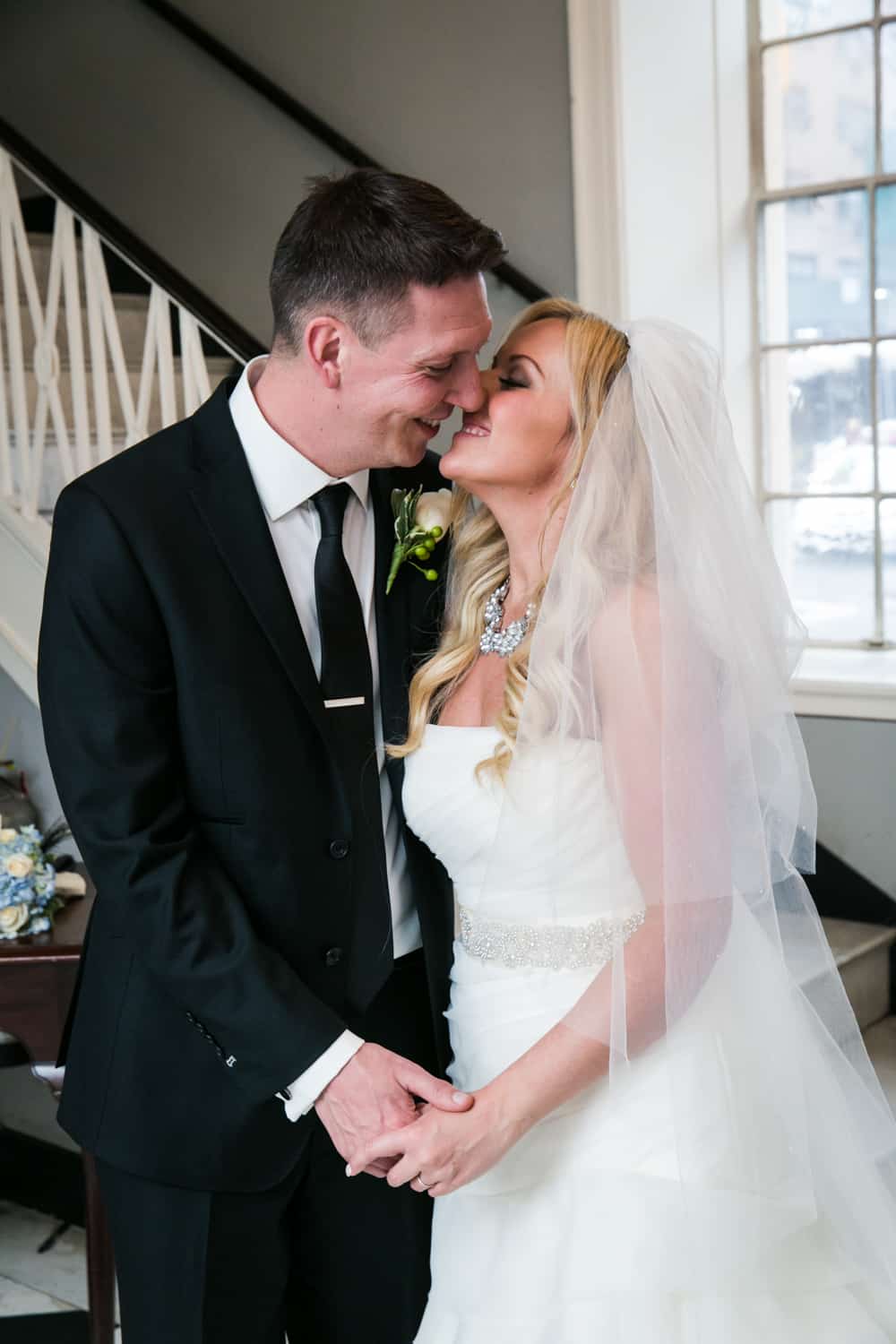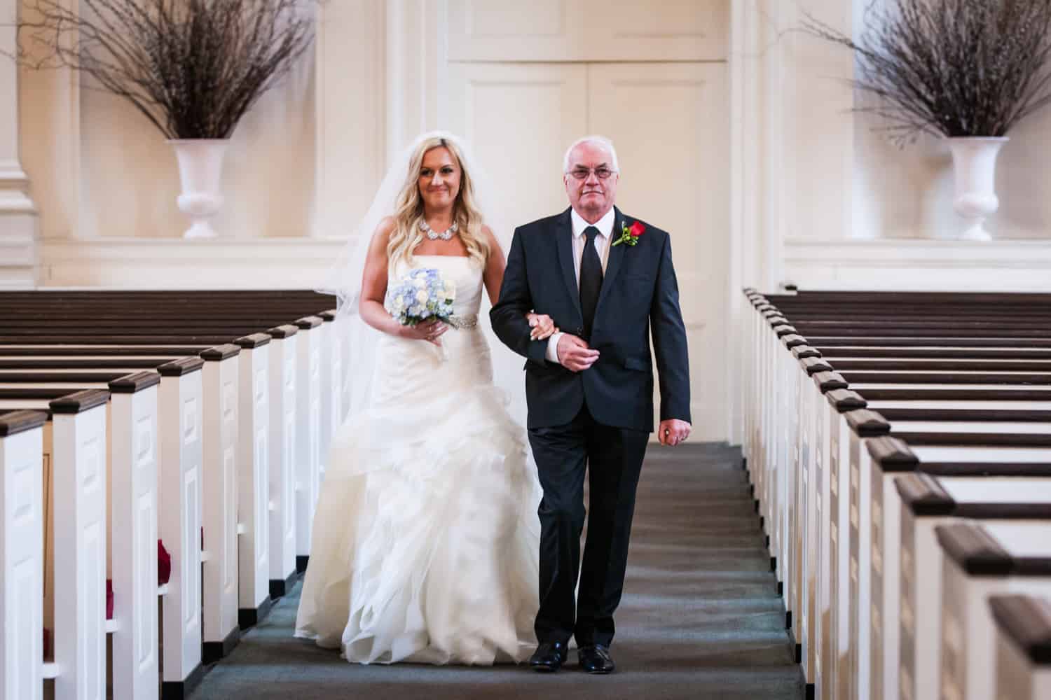 Carol and Chris’s wedding day began in classic New York fashion at the Plaza Hotel where the couple got ready. After zipping into her dress, Carol attached her veil and we headed uptown. The ceremony was held at All Souls Unitarian Church on the upper east side, and was simply beautiful. With only 22 guests, the wedding party had the sanctuary all to themselves. But why hire the church choir when you can get David Letterman’s Late Show Gospel Choir? The choir was captivating, and their voices filled the space. It was a bit like having a theater performance during the ceremony.