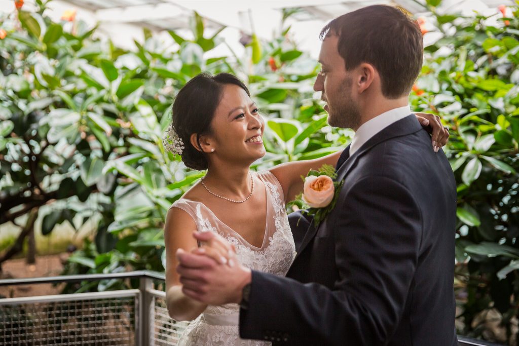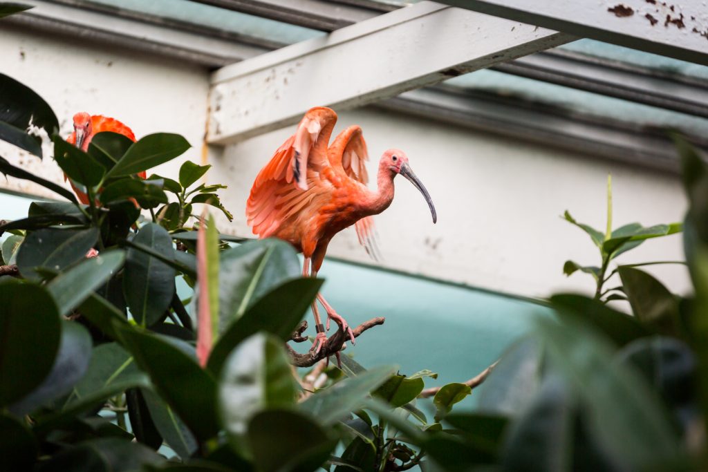 With first look photos (and nerves) out of the way, it was time to venture into the heart of the zoo for the bride and groom portraits. I planned their shot list to tackle their favorite animals first and work our way back towards the ceremony spot. Accordingly, we began with the Aquatic Bird House. This was my first time in this exhibit, and it proved to be a great spot for photos. My recommendation is that you start all the way at the back of the building with the open-air penguin exhibit, then work your way back to the front door. Along the way you can capture several different types of colorful birds, including a large area in front of the pink ibis exhibit just made for a dancing bride and groom.