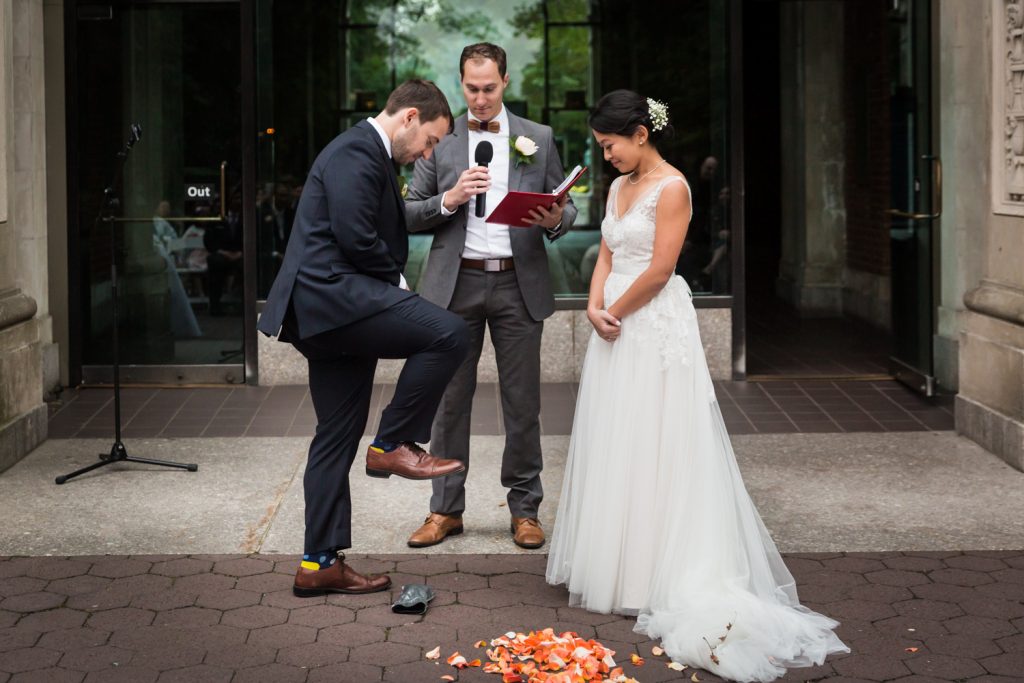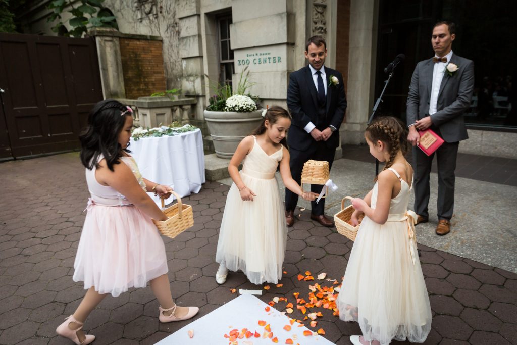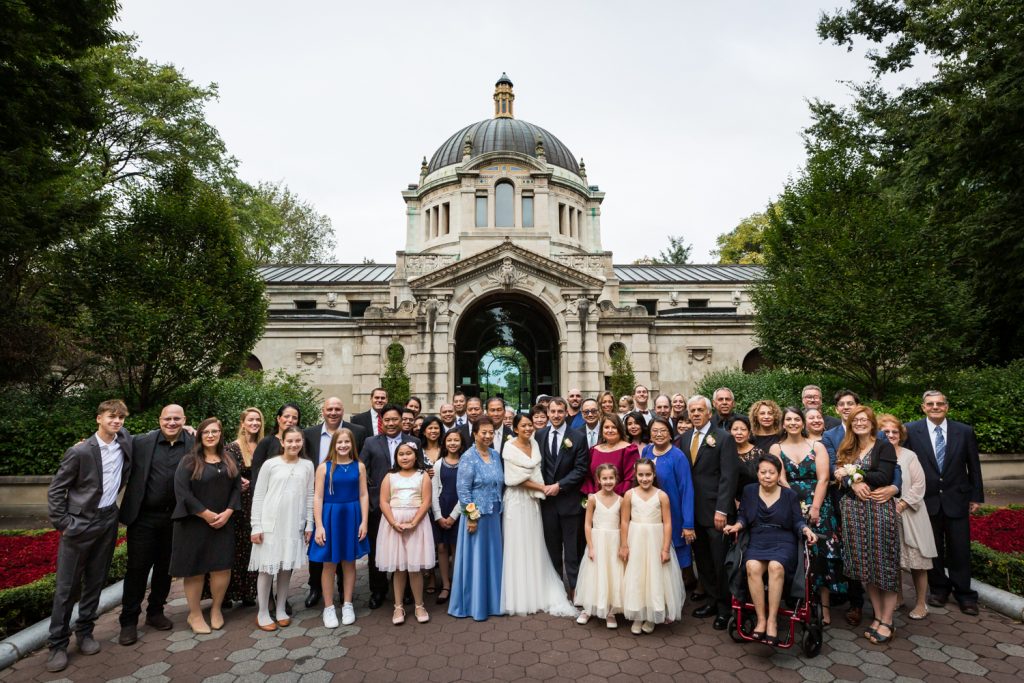 We ended our bride and groom photo session with classic shots in front of the Southern Boulevard gates and on the main staircase. It wouldn’t be a Bronx Zoo wedding if these photos weren’t included. Furthermore, we did all of our family photos behind the Zoo Administration Building. This spot is a favorite of mine for family portraits because it can handle groups of any size and because it means the guests don’t have to walk far to the ceremony spot. Other favorite family portrait locations include Astor Court shooting towards the Zoo Administration Building, and the Rhino Walk hidden behind and to the left of the Zoo Administration Building.