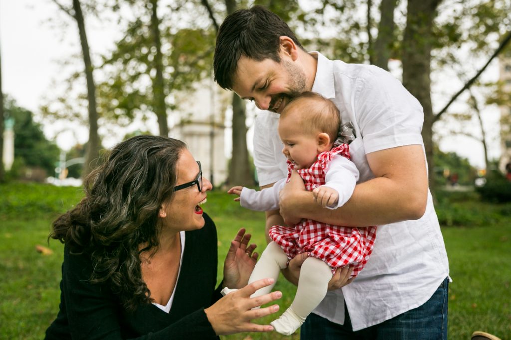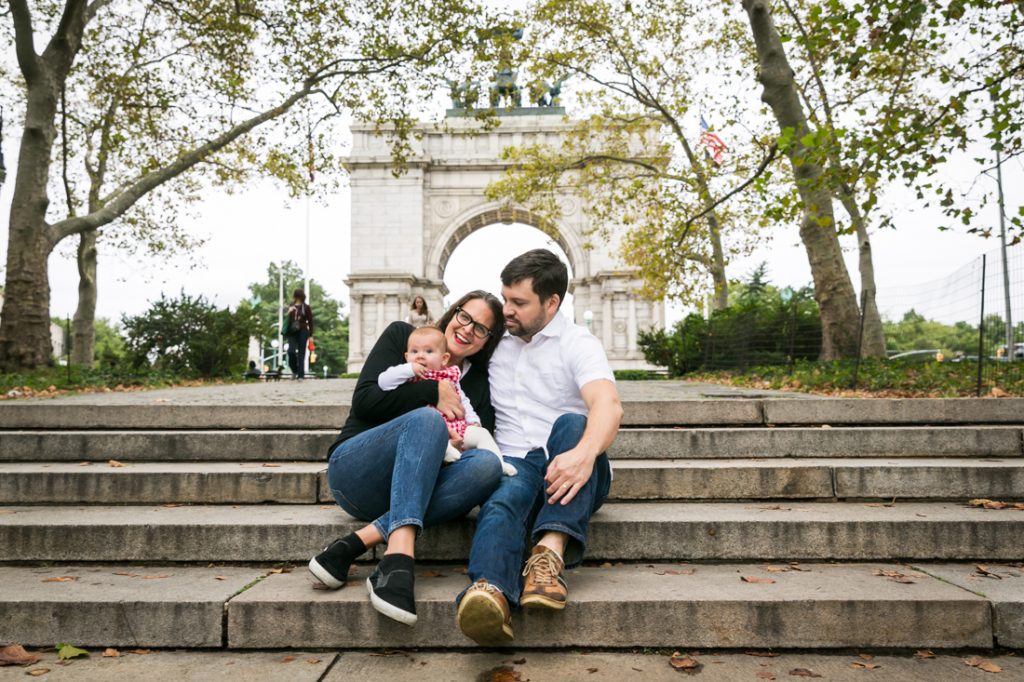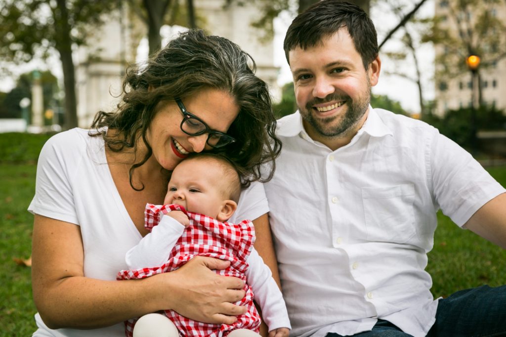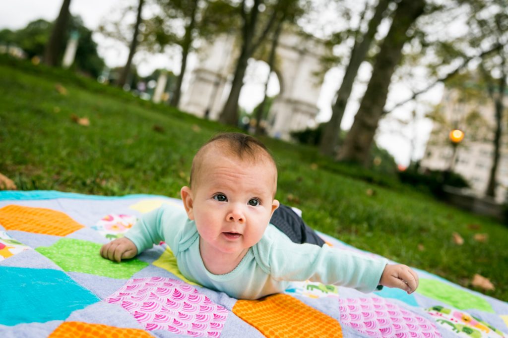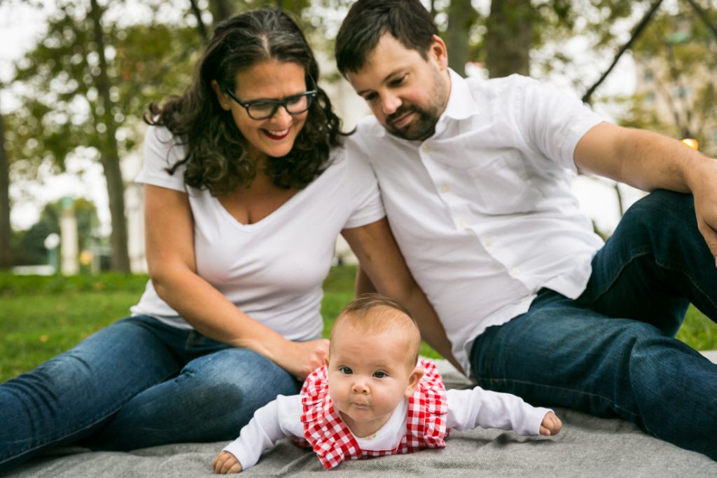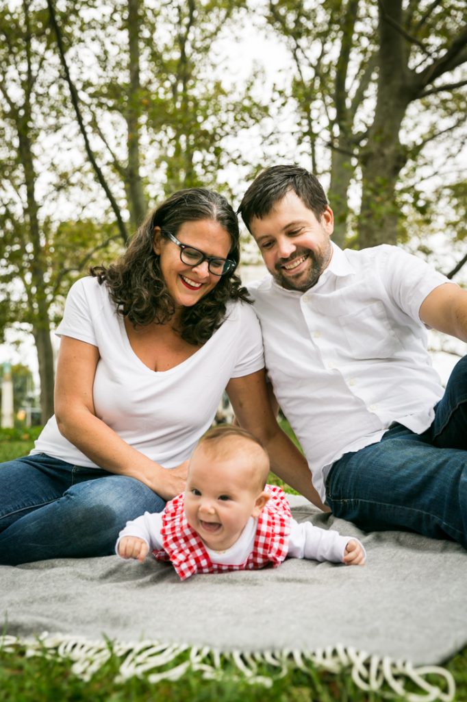 For Miriam and Jon, their priority was photos that concentrated on little Ella alone. So I made sure to start the shoot with Ella owning the stage on her quilt. The shots focused on her on her back, tummy, playing with a toy, etc. before I included the rest of the family in the photos. For your shoot, envision the photo of your family you want to keep on your desk at work, and then make sure that this photo is taken while everyone is in a good mood. Once this photo is banked, everything else is icing on the cake. And for this shoot, the rest of the photos were a nod to Miriam and Jon’s fantastic engagement shoot at — you guessed it — Grand Army Plaza! It was four years ago that Miriam contacted me to shoot an engagement portrait of Miriam and Jon, and now the circle is complete.