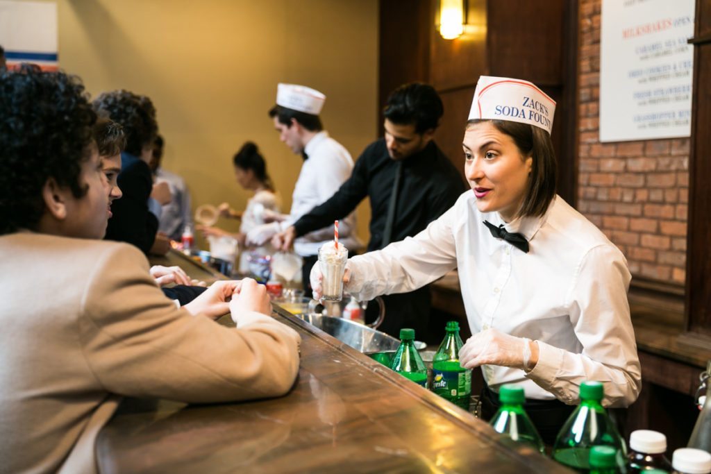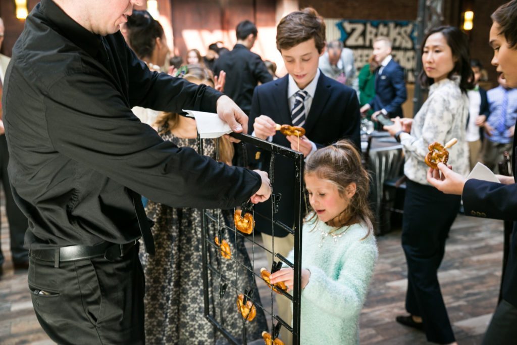 Now let’s get to the good stuff…the food! All of the food (created by caterer, Scoozie Events), from the appetizers to the dinner buffets, were foods found commonly in New York City, though taken to a gourmet level. There was even a ramen burger for the gluten free among us. Every morsel was served beautifully in an innovative way. My favorite of the appetizers was a rack of pretzels and cheese (note the individual cheese dispensers).
