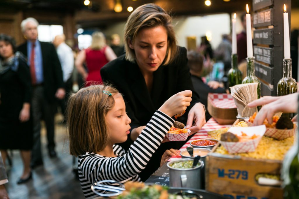 For dinner, there were three food stations — a hot dog stand, an Italian pasta station, and a taco/burger station — set up in three different parts of the room to avoid overcrowding. Each dish was served in unique trays or boxes that gave the food a precious quality.