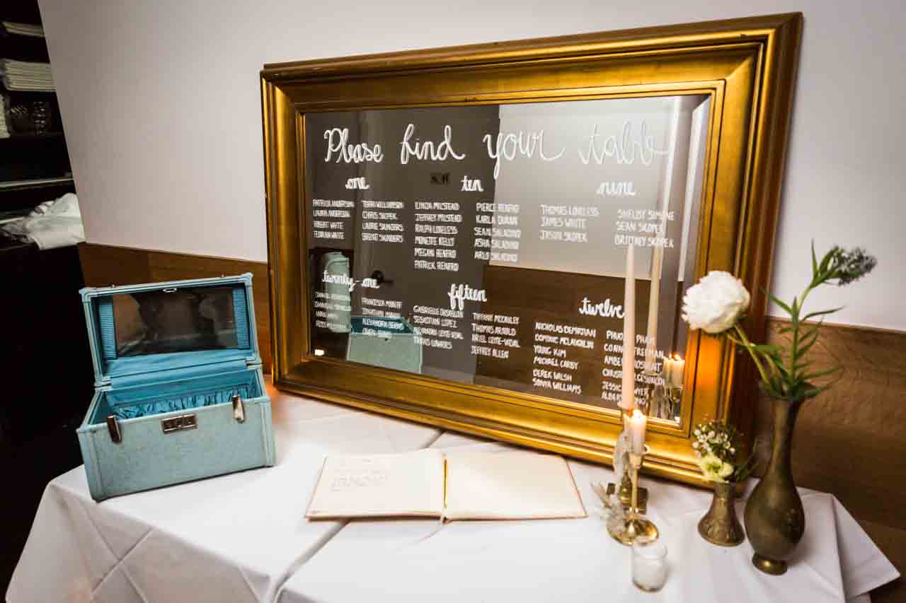 The reception was held at Bottino Restaurant, and I can’t say enough good things about the staff here. The food was excellent, and the staff went above and beyond accommodating guests. The restaurant has room for two dance floors: the patio, where the first dance was held, and the indoor dance space where we held the parent dances. For decorations, the couple kept things simple and made their own table numbers that told the timeline of their love story. The couple also made their own seating chart from a mirror.