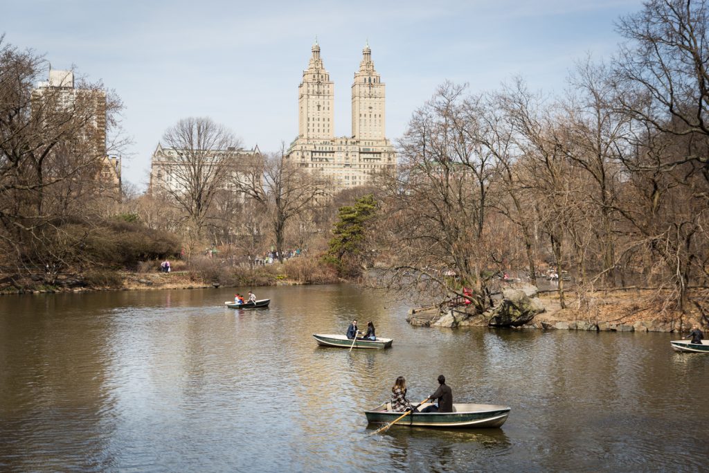 You will never row as far as you think you will. Matthew and Zing were both in fine shape, but neither of them could believe how difficult it was to row the damn boat. Both of them promised me they wanted photos farther in the lake past Bow Bridge, but these photos never came to fruition. I don’t blame them. Bear in mind that you have the dual issues of the sun beating down overhead plus nerves when you try to row a boat and ask your significant other to marry you. There are lovely photos to be had if you do manage to row past the Bow Bridge and get farther into the lake: namely, more photos of the Eldorado apartment building (the beautiful building with the two towers from the film Rosemary’s Baby) and additional photos of the park with the Central Park South skyline in the background. But don’t worry, you can take all of these photos on land if you are too tired to row (and you will be, trust me).