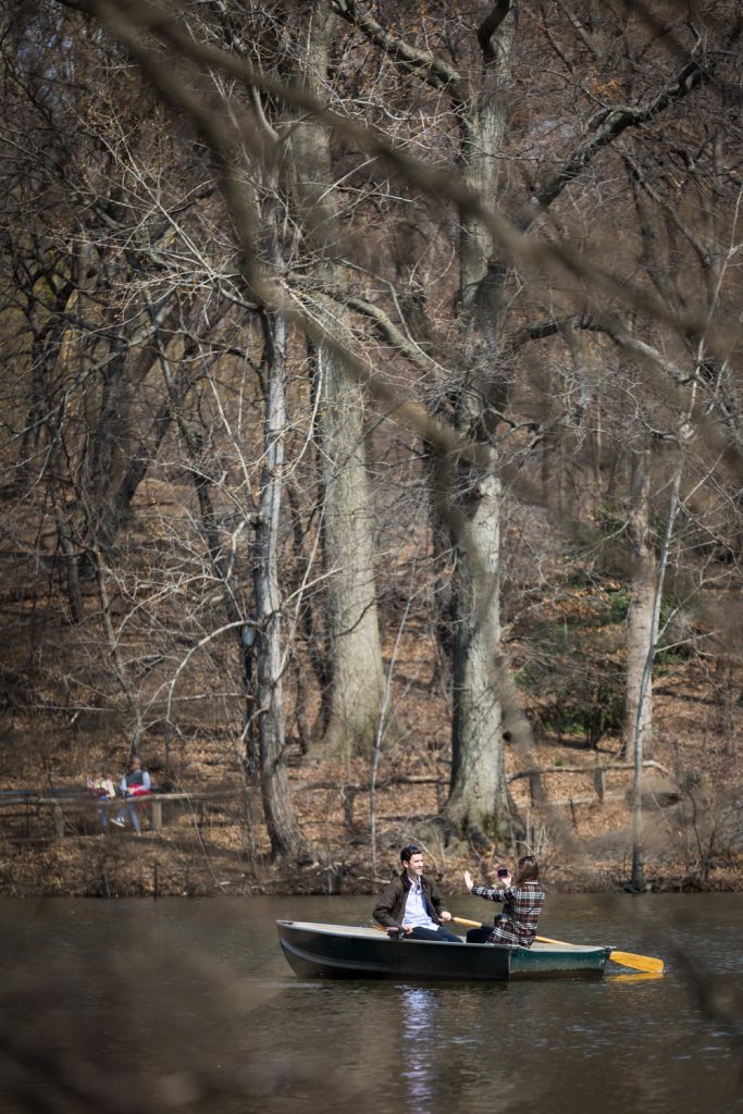 The best place to propose on Central Park Lake is at the Wood Chip Vantage Point. The Wood Chip Vantage Point (a.k.a. the landing to the right of Bow Bridge on the side of the Loeb Boathouse) is still the best place to propose in this photographer’s opinion. As a photographer, I need a spot that is a) out of the way of tourists, b) gets me close enough to the water to capture the moment, and c) still keeps me a bit hidden in the shrubbery until the big reveal. The Wood Chip Vantage Point is all that and a bag of chips. In summer, there are thick bushes to the left of the landing that keep me hidden until your boat swings around. Up until this moment I can capture you from Bow Bridge, but the true advantage of the landing is that it juts out into the lake so that it is almost like I am in the water with you. My camera stays dry, but I can still get up close and personal with my long lens. It’s a win-win for any proposal.