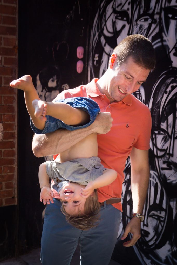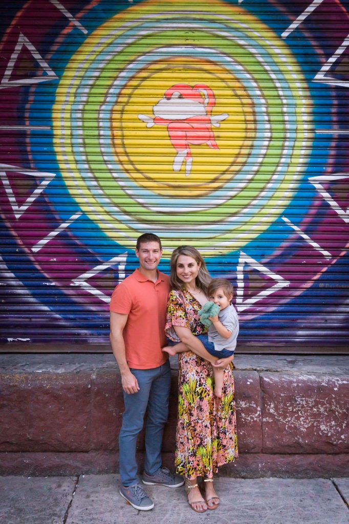 We ended our session with a walk down 27th Street. Ruben and Joanna were very fond of portraits with a graffiti background that I had taken on the streets of Soho for their wedding. So of course we tried to recreate this setting, now with their little son in tow! If you are looking to have the same artistic background in your own photos, stroll down 27th Street and check out the walls in front of the McKittrick Hotel and the Selina Chelsea Hotel, near the High Line.