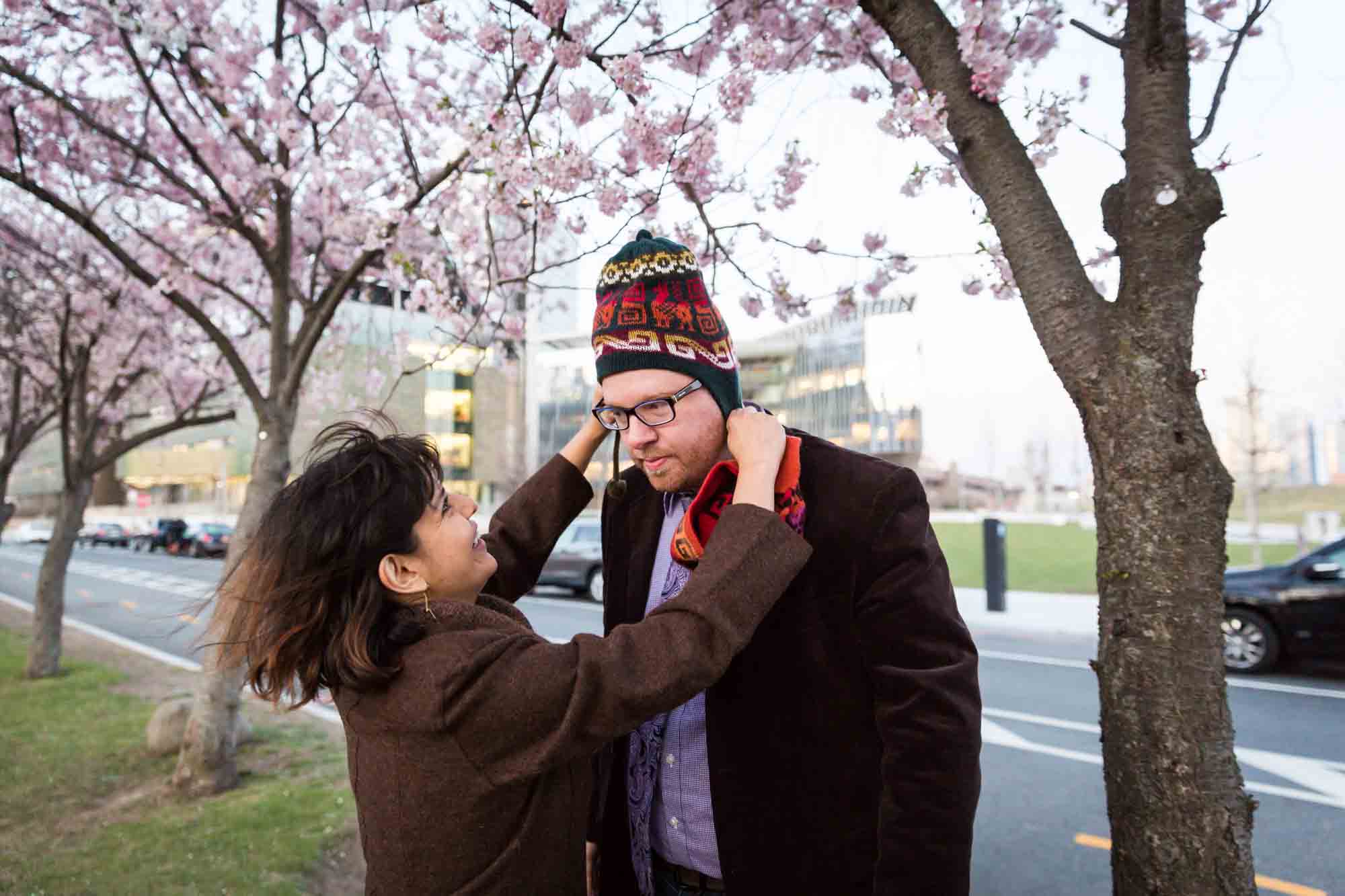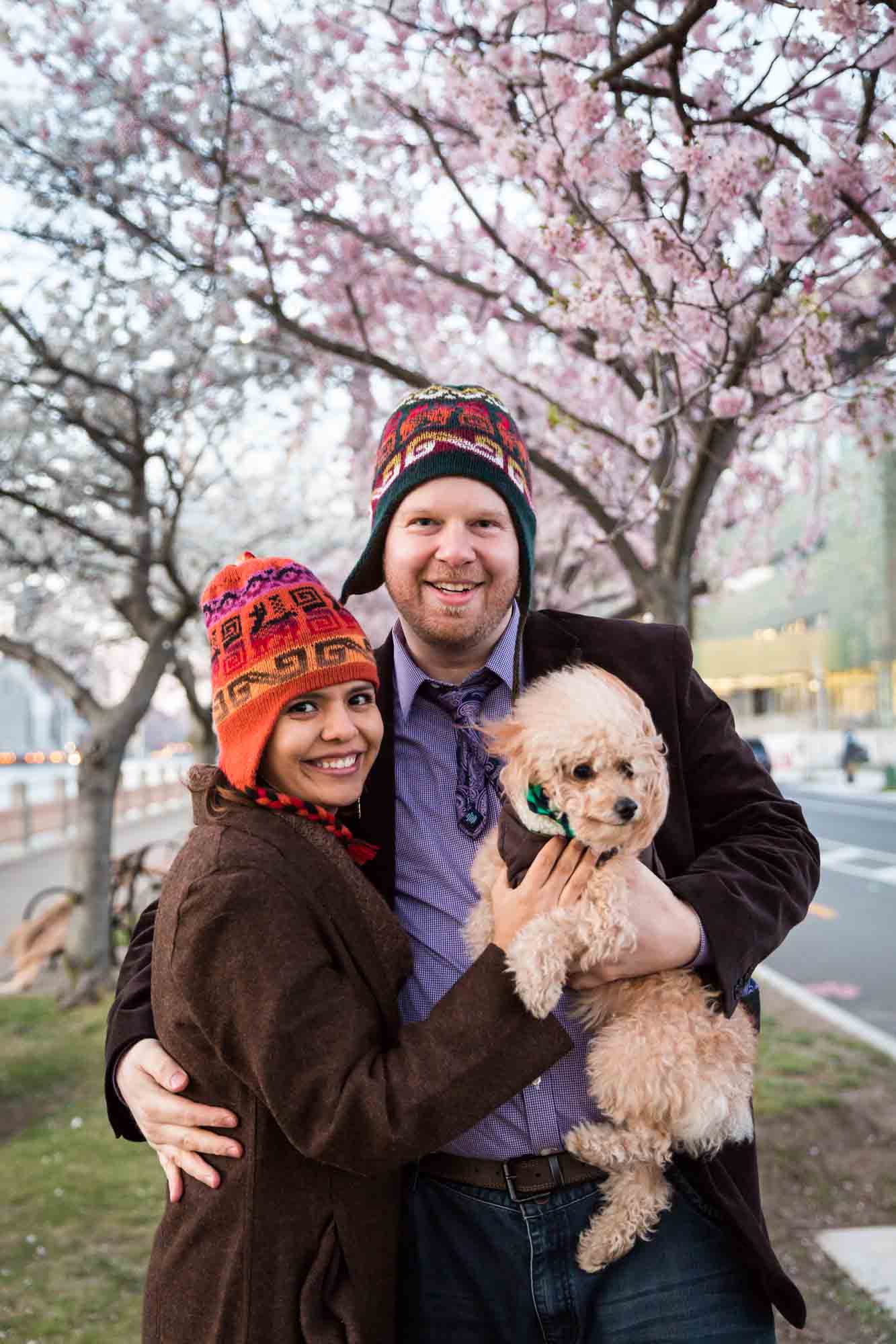 So get out there and get your best cherry blossom photos! The engagement photos accompanying this article are of Helen and Sam. These two wanted a photo session that truly told the story of their love. As such, we made sure to include a nod to Sam’s Irish heritage and Helen’s Peruvian roots (hence the flags and hats). And no portrait would be complete without including Ikhito, Helen and Sam’s precious little dog. Ikhito truly stole the show and is living proof that every photo is better with puppy.