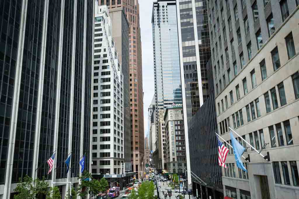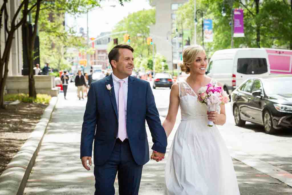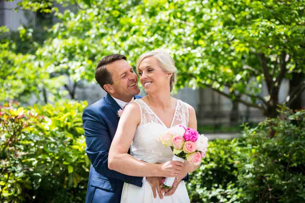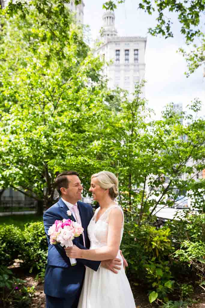 With time running short, we nailed the photo of the doors and then captured a touch of nature at the little wedding garden next door. While the trees and flowers are beautifully in bloom, be warned that there is construction around the City Clerk’s office. In particular, there is ugly construction all along Worth Street. Construction is a never-ending eyesore in the area, so I always check out the area prior to a wedding to make sure I am prepared with backup portrait locations.