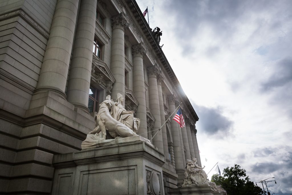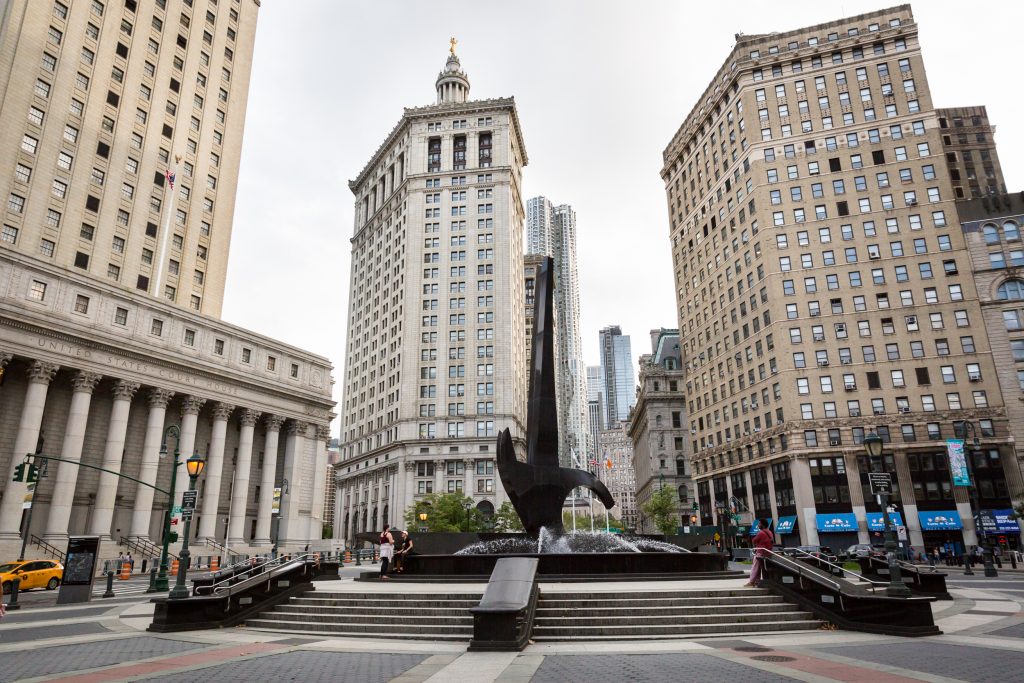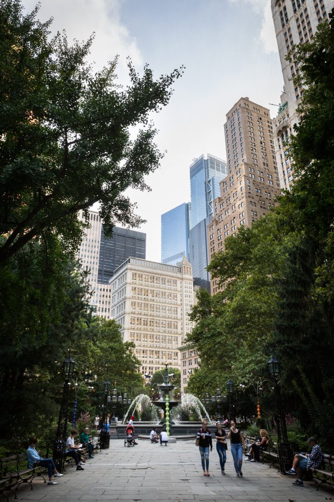 Foley Square is the little dot of a park located diagonally opposite from the Manhattan Marriage Bureau. There is an odd, dagger-shaped granite fountain in the center of the park, and you can get some fantastic views of the downtown skyscrapers. In short, it’s a great spot to get a taste of Manhattan. In addition to wide angle views which integrate the urban skyline, I have also used the buildings surrounding Foley Square for several photos. Most notably, the glass walls of the United States Court of International Trade are great for reflections.