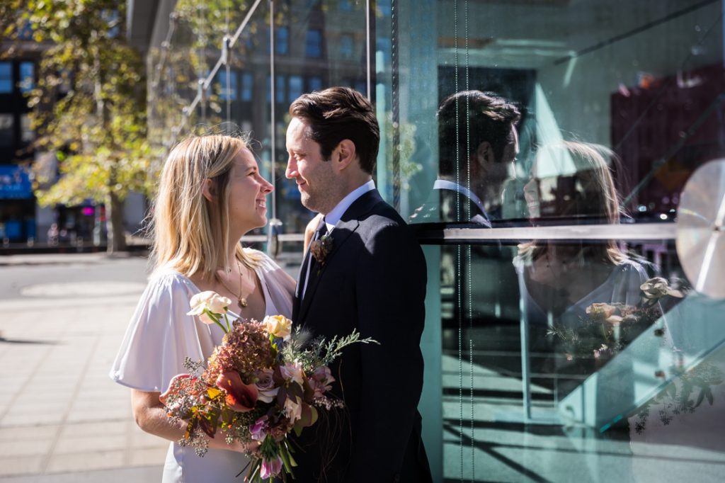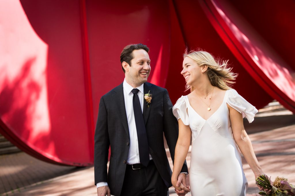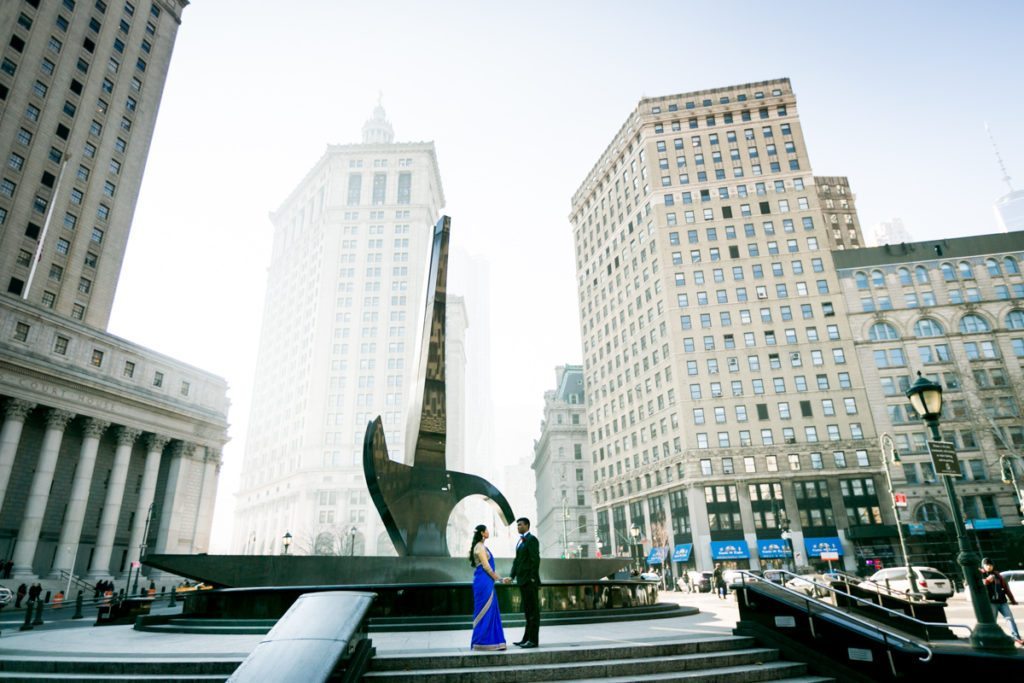 To the far south of the building is the old entrance to the Chambers Street subway station, and I love the antique feel of the signage. Directly behind the building is a gigantic, red sculpture that quite frankly needs a new paint job. The sculpture was a spectacular background for Jillian and Jay’s wedding portraits, as you can see here. You can also take some epic shots looking back at the building.