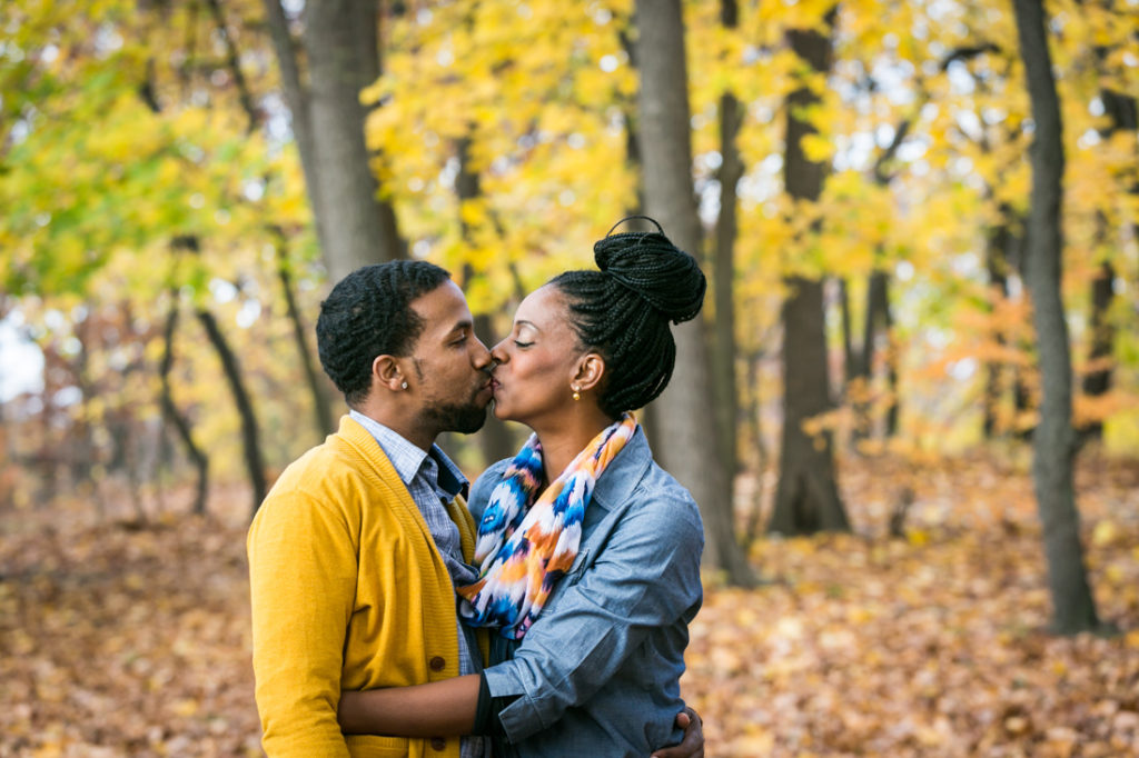 - Same color family, but not every family member the same. I’m all for having every family member in the same complimentary color scheme – everyone picks a different shade of blue, for instance – but no one should be matchy matchy. Your best bet is to coordinate your colors in small doses, rather than each family member wearing the same shade top to bottom. Use accessories to pick up color on each family member. As an excellent example, check out Melanie and Jalani’s fantastic color coordination: her leggings pick up yellow in his sweater, and his shirt reflects blue in her scarf. Even the leaves look great with this family.