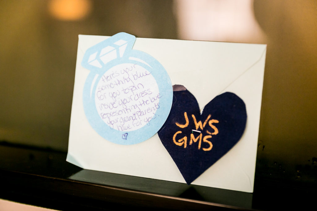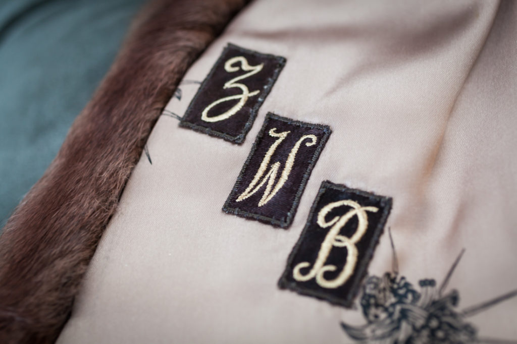 - Blue embroidered monogram or stitching on the underside of your dress or on a family handkerchief