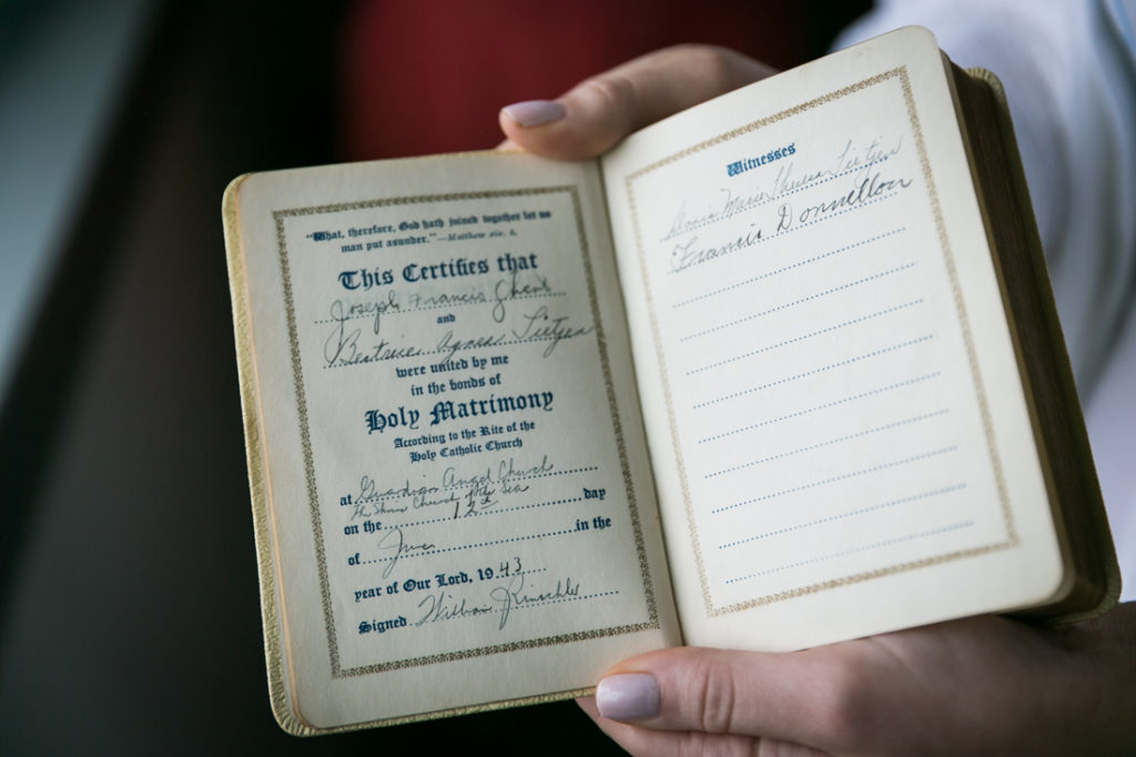 - Small bible or missal – One of my bride’s, Francesca, carried down the aisle the missal which once belonged to her grandmother. You could also use the family bible at the ceremony.
