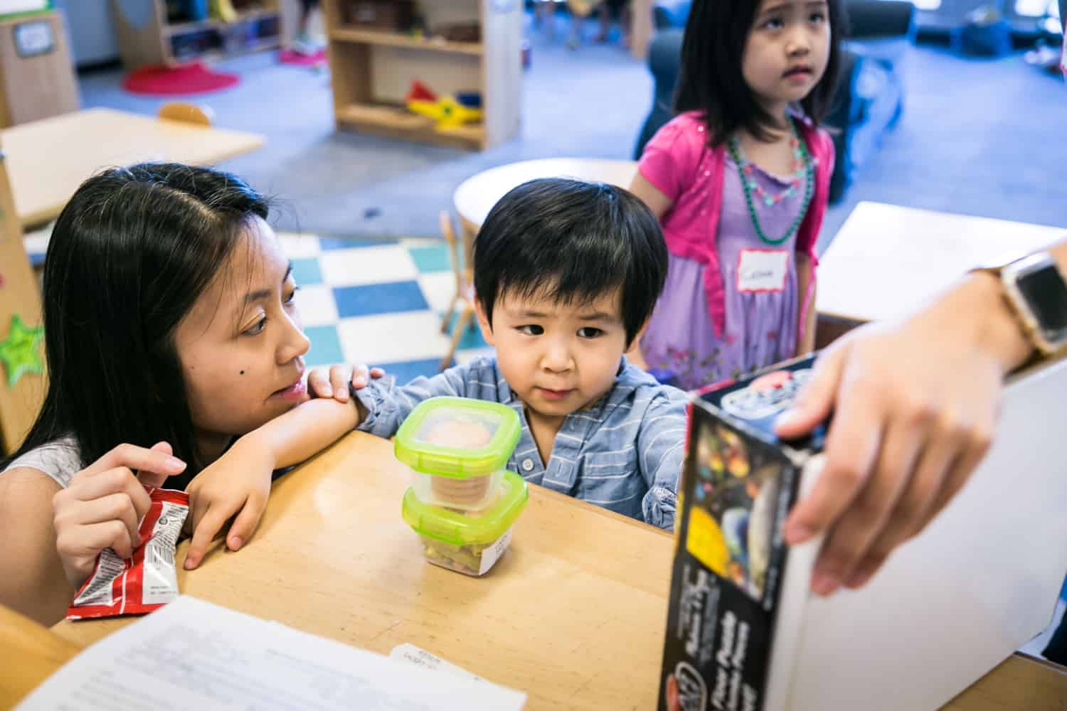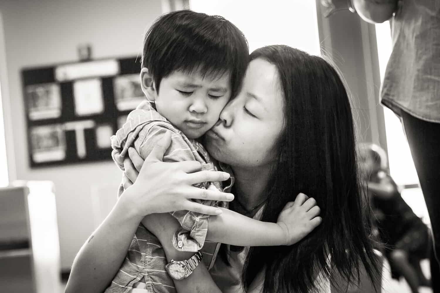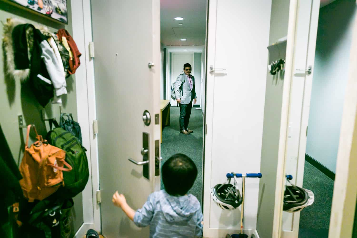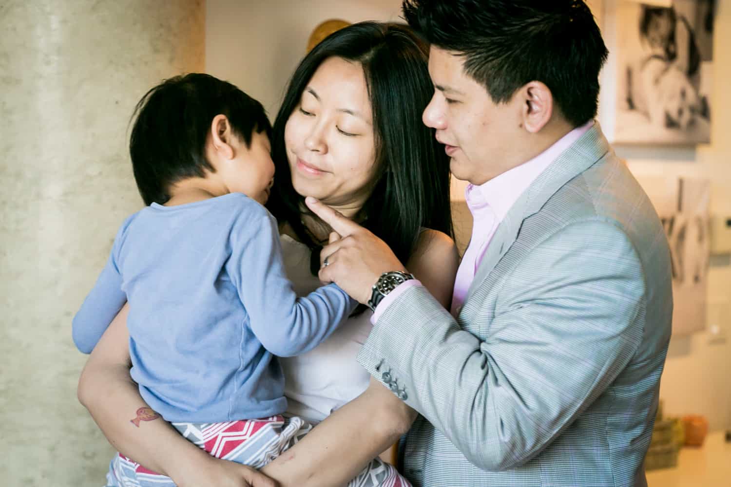 One of my clients, Sara, did just this with her son Luca’s last trip to daycare. You may remember Luca from his second birthday celebration and how much he enjoyed cupcakes. Sadly, Sara and her husband moved to the west coast last year. Sara loved New York City, and one of the special moments for her had been taking her son on the subway to daycare. Sara treated the session as just a typical day. I started the day at their apartment and captured Luca as he got ready for his day. Never one to rush into the day, Luca began by engaging his parents with his toys, eating a few snacks, and an outfit change. Let’s just say it takes a village to put on pants with Luca. Dad had to rush off to work, and there was an extended set of goodbyes before Luca had to make his final exit.