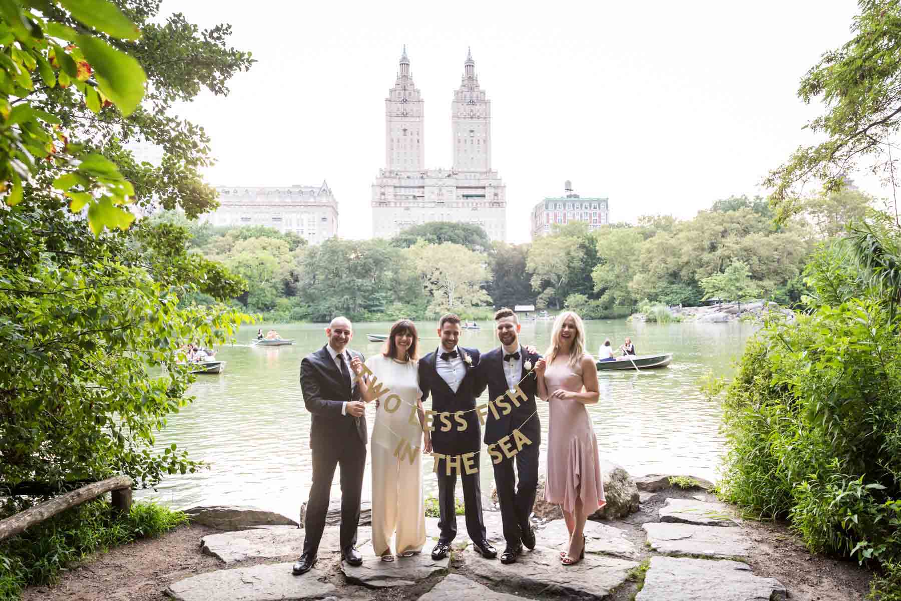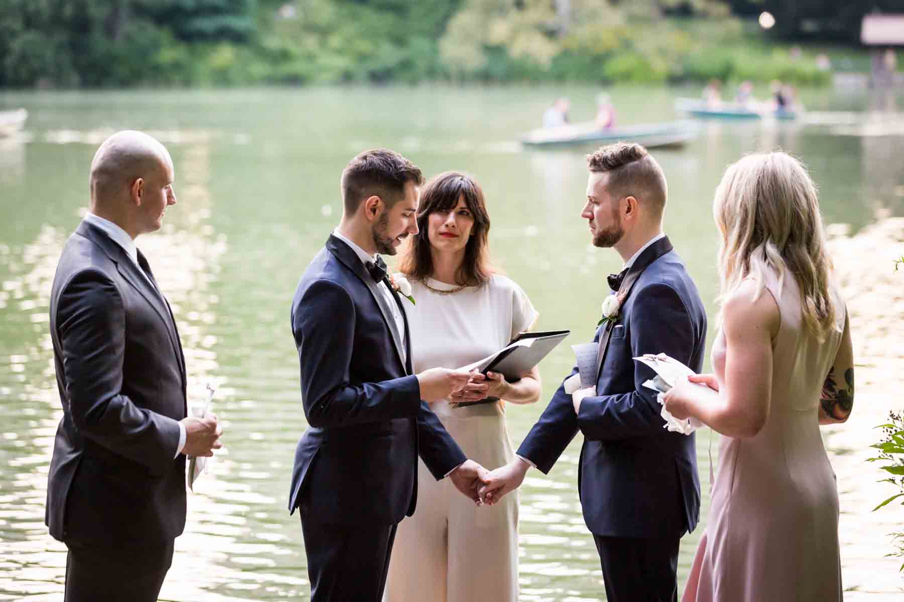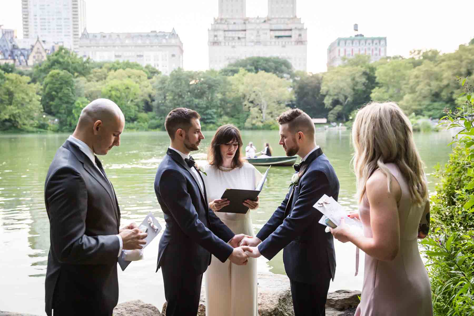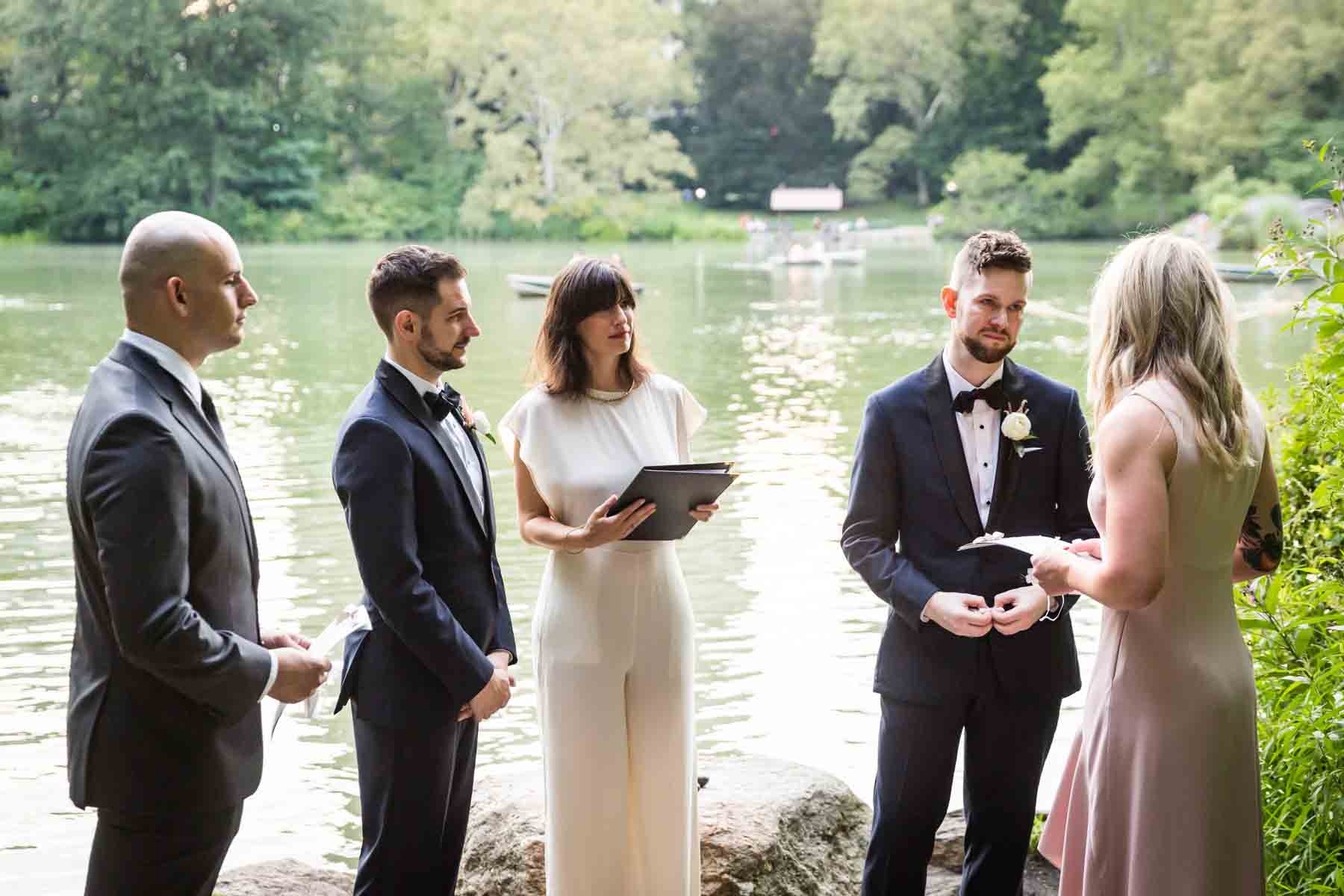 Crowds are a HUGE factor. Please note that last restriction about the public having access to the park. You technically can’t tell anyone to move even if you are getting married. When we arrived at Bow Bridge beach, there was a couple talking on the bench. I politely let them know that a wedding was about to begin, and the couple left. However, during the ceremony a very annoying European tourist decided to make himself a part of the ceremony and nearly walked between the two grooms during their vows. We also had a group of kids shout out loudly, ‘Congratulations!’ during the ceremony. Why, people? Why???? Mind you, this was on a Monday evening so the crowd level was quite light but we still had people making themselves a part of the event. As such, you really need to consider the day, time, location, and your level of comfort with Joe Q. Public when you select your Central Park wedding location. For Matthew and Travis’s wedding we were pretty much hidden and still had interruptions. Central Park is in the middle of New York City, and the city will be loud and proud – even while you are saying your vows. If you want complete privacy for your nuptials, then Central Park should not be your choice of venue.