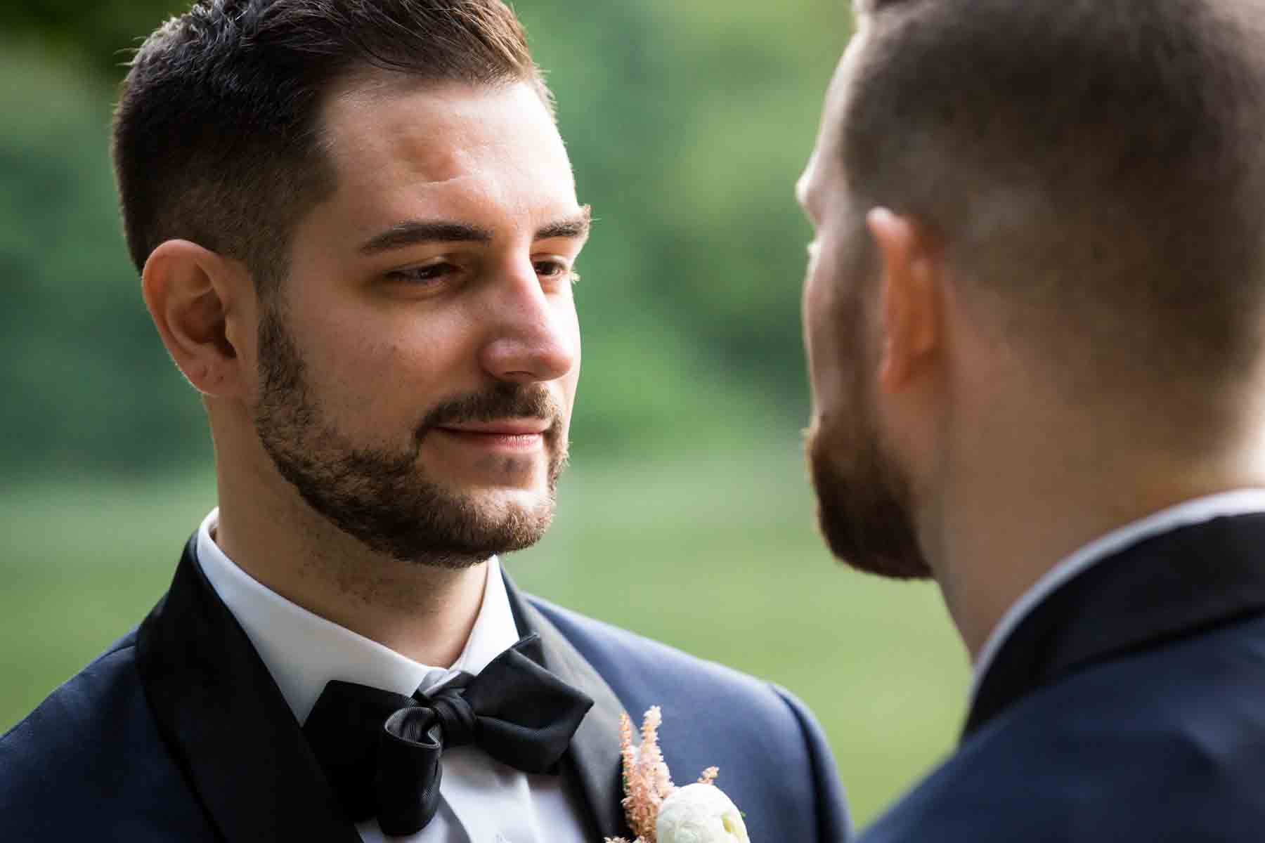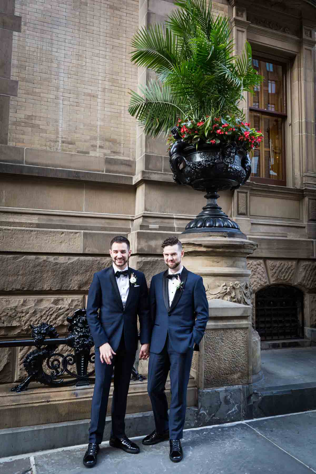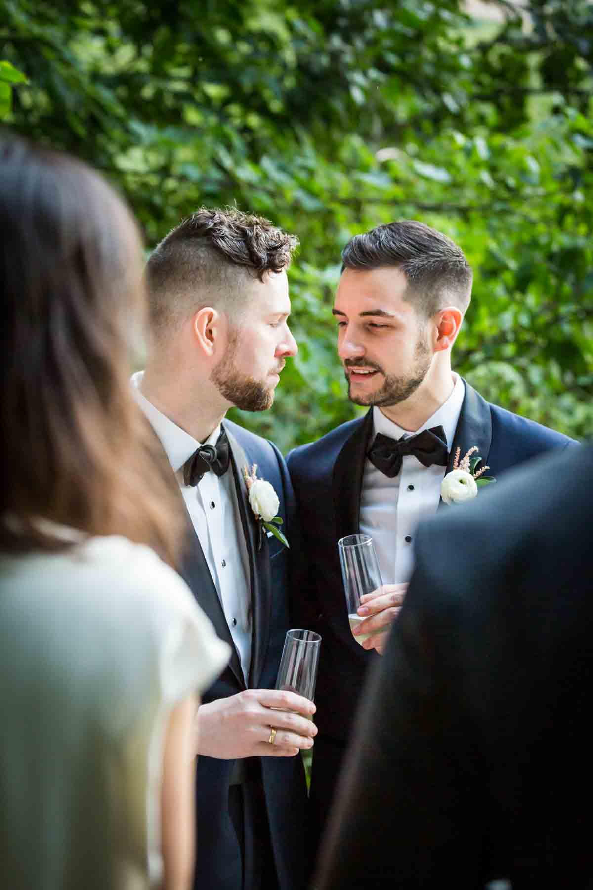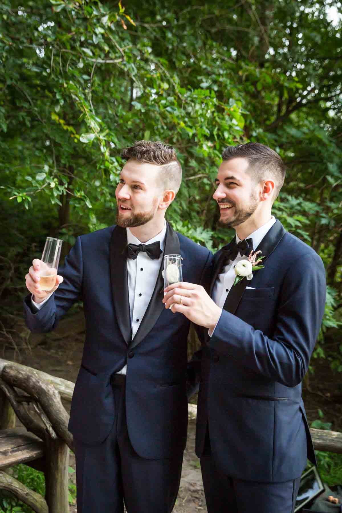 Crowds are a HUGE factor. Please note that last restriction about the public having access to the park. You technically can’t tell anyone to move even if you are getting married. When we arrived at Bow Bridge beach, there was a couple talking on the bench. I politely let them know that a wedding was about to begin, and the couple left. However, during the ceremony a very annoying European tourist decided to make himself a part of the ceremony and nearly walked between the two grooms during their vows. We also had a group of kids shout out loudly, ‘Congratulations!’ during the ceremony. Why, people? Why???? Mind you, this was on a Monday evening so the crowd level was quite light but we still had people making themselves a part of the event. As such, you really need to consider the day, time, location, and your level of comfort with Joe Q. Public when you select your Central Park wedding location. For Matthew and Travis’s wedding we were pretty much hidden and still had interruptions. Central Park is in the middle of New York City, and the city will be loud and proud – even while you are saying your vows. If you want complete privacy for your nuptials, then Central Park should not be your choice of venue.