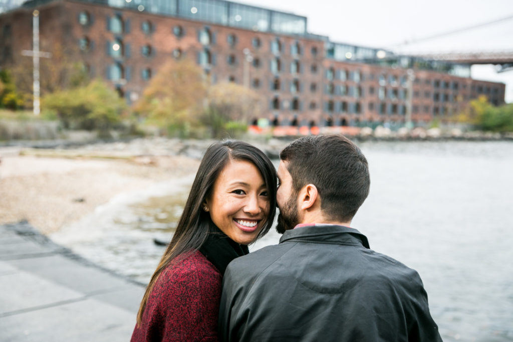I was happy to fulfill Alyssa and Greg’s request to photograph their engagement in Brooklyn. While I have taken photos in DUMBO a million times, we decided to give this shoot a more urban feel and thus focused on the areas under the Manhattan Bridge and around the small streets near the waterfront. Of course this also gave us the opportunity to take advantage of the colorful graffiti in the neighborhood. This look worked perfectly with the overcast skies, and is a completely different shoot from other engagement sessions of mine that focused on the nearby park.
