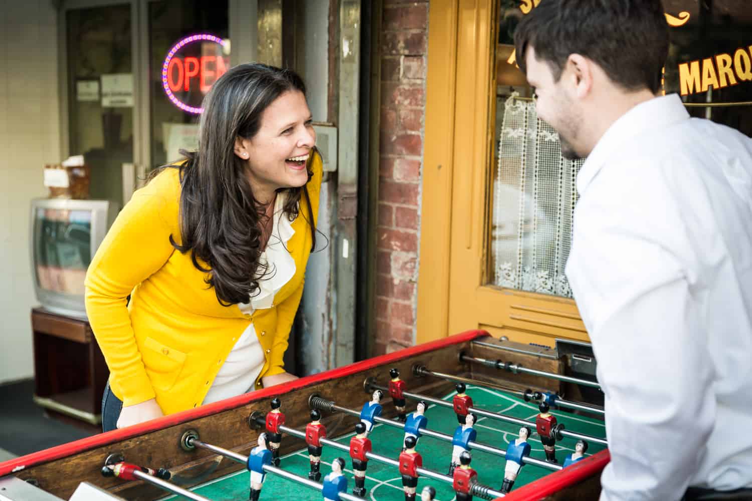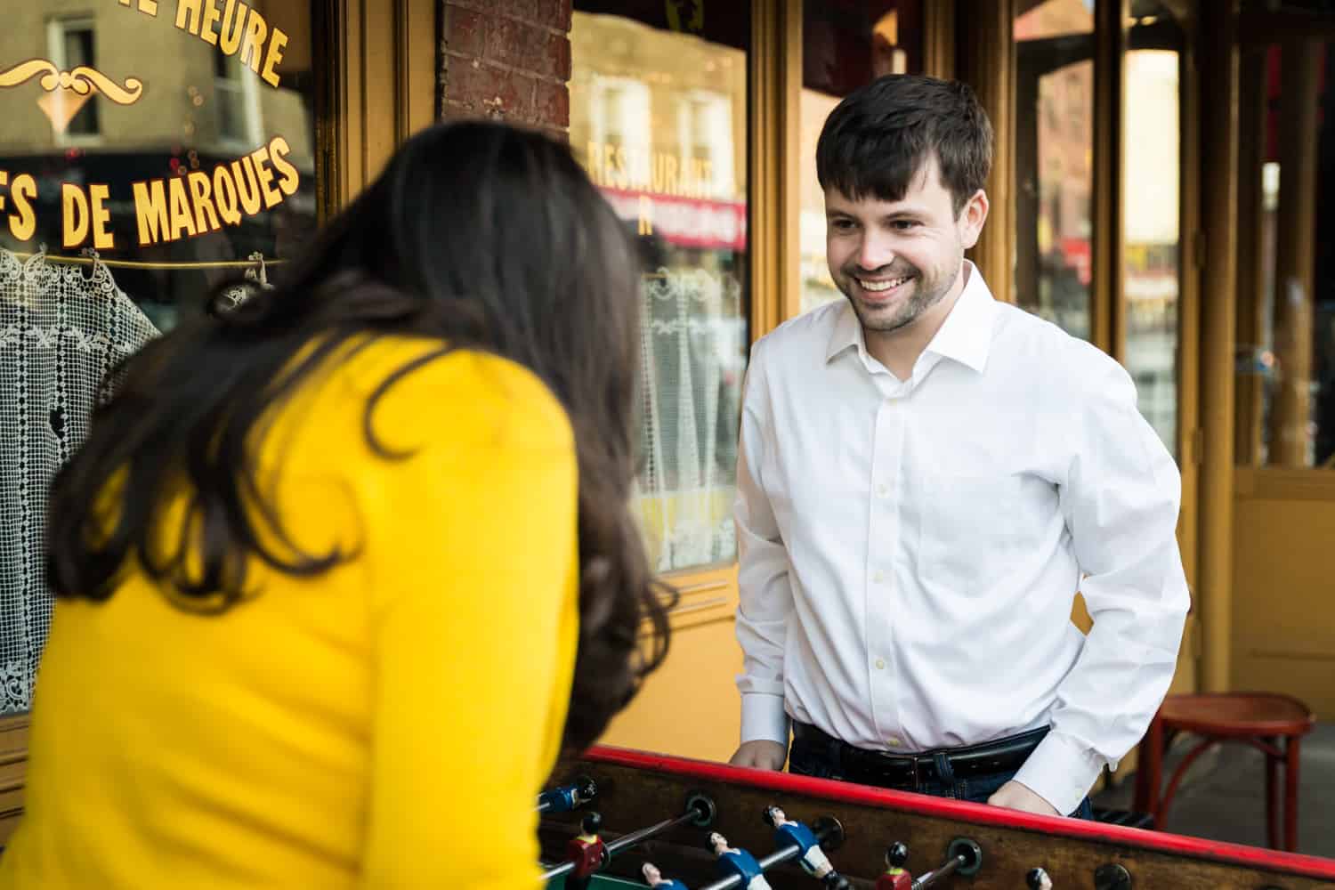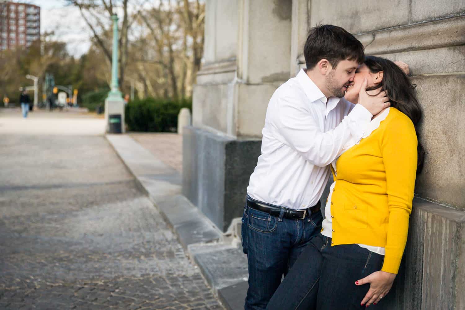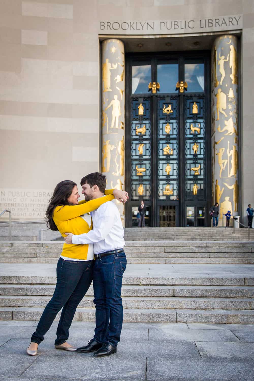 For this engagement shoot, we shot in several locations near and dear to Miriam and Jon. While we started at Grand Army Plaza, we ended up in a favorite bar of theirs on Smith Street called Bar Tabac that had a very photogenic outdoor foosball table. Along the way, we took photos at the entrance to the Brooklyn Library, and stepped foot in Prospect Park. The stone ‘gazebo’ just outside the park is a great place to sneak in some ‘secret’ photos away from the crowds outside.