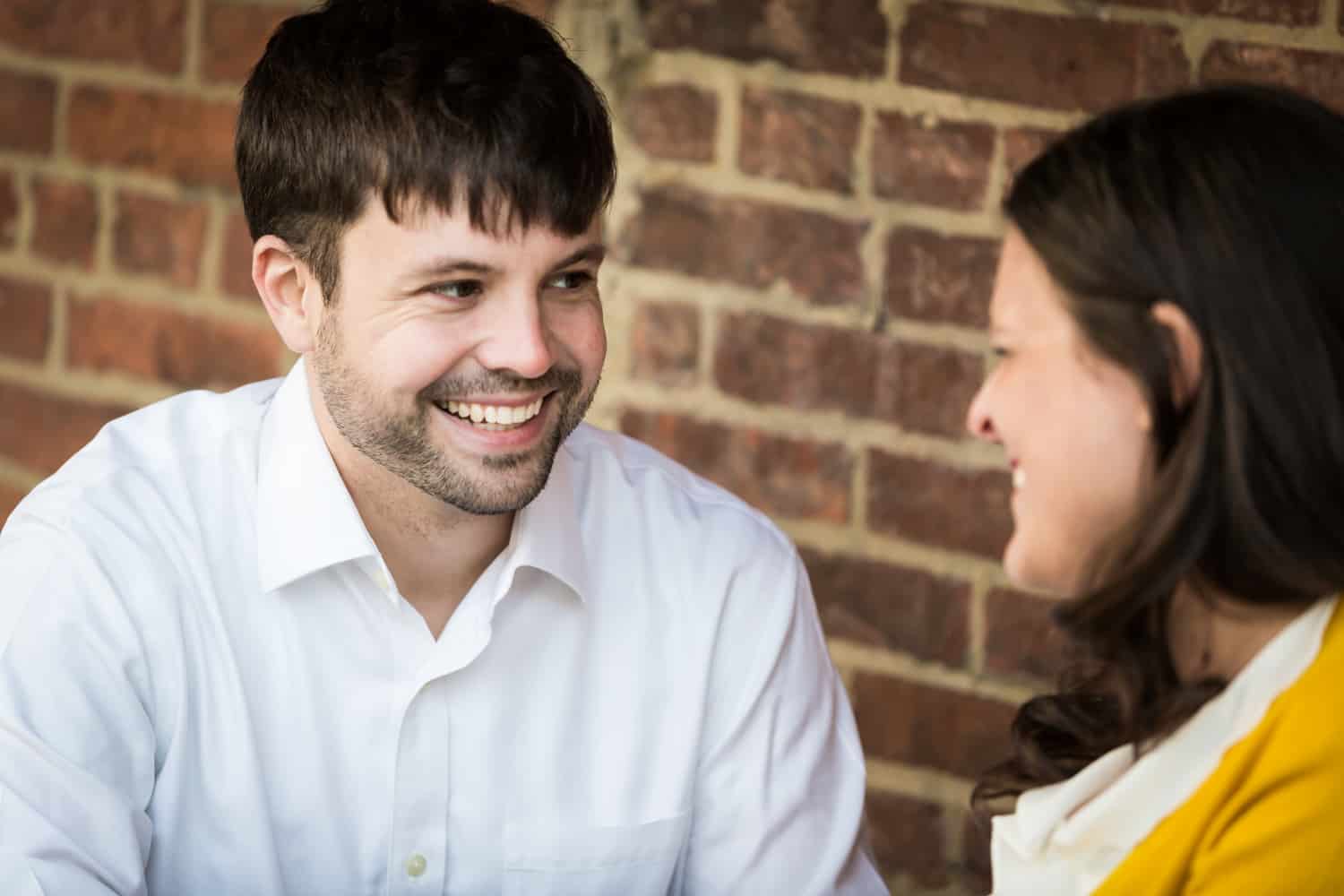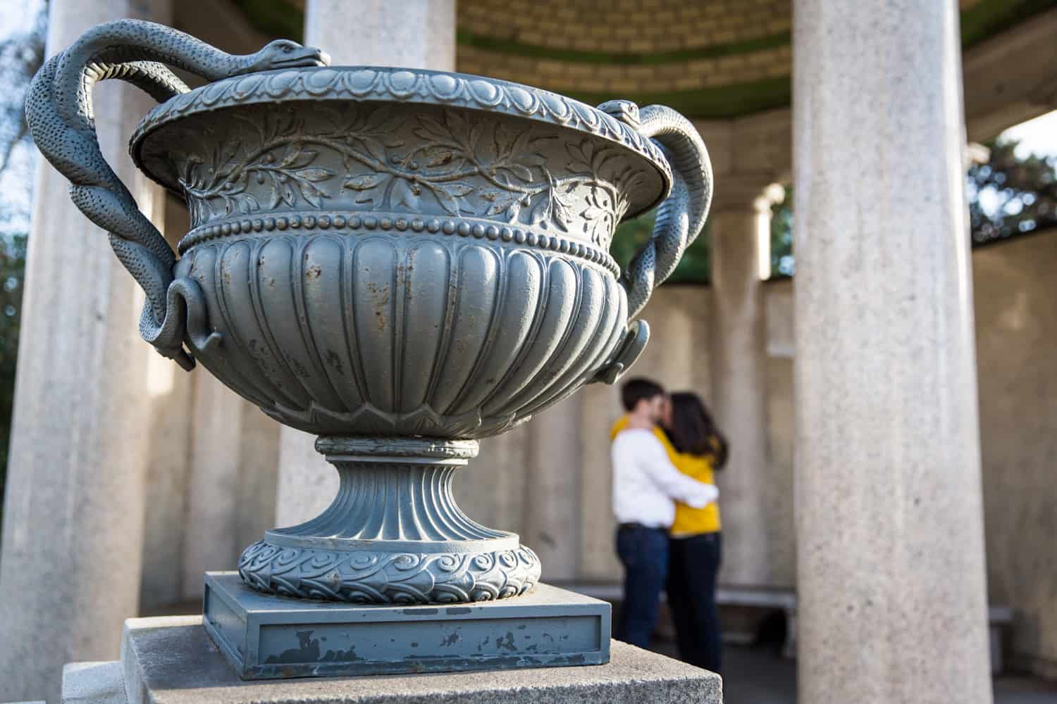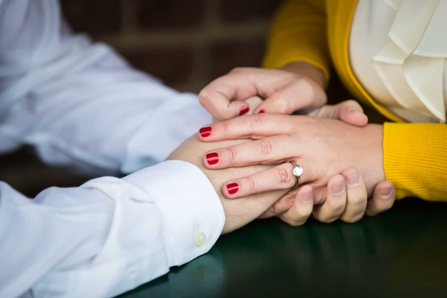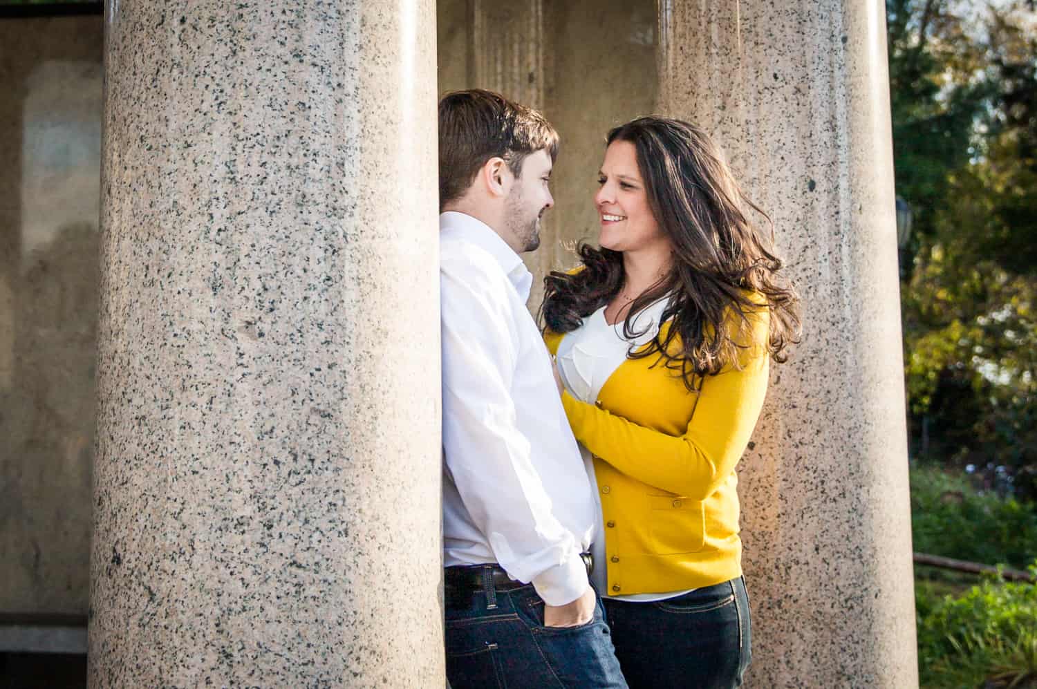 For this engagement shoot, we shot in several locations near and dear to Miriam and Jon. While we started at Grand Army Plaza, we ended up in a favorite bar of theirs on Smith Street called Bar Tabac that had a very photogenic outdoor foosball table. Along the way, we took photos at the entrance to the Brooklyn Library, and stepped foot in Prospect Park. The stone ‘gazebo’ just outside the park is a great place to sneak in some ‘secret’ photos away from the crowds outside.