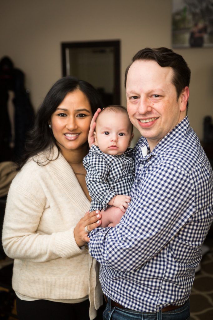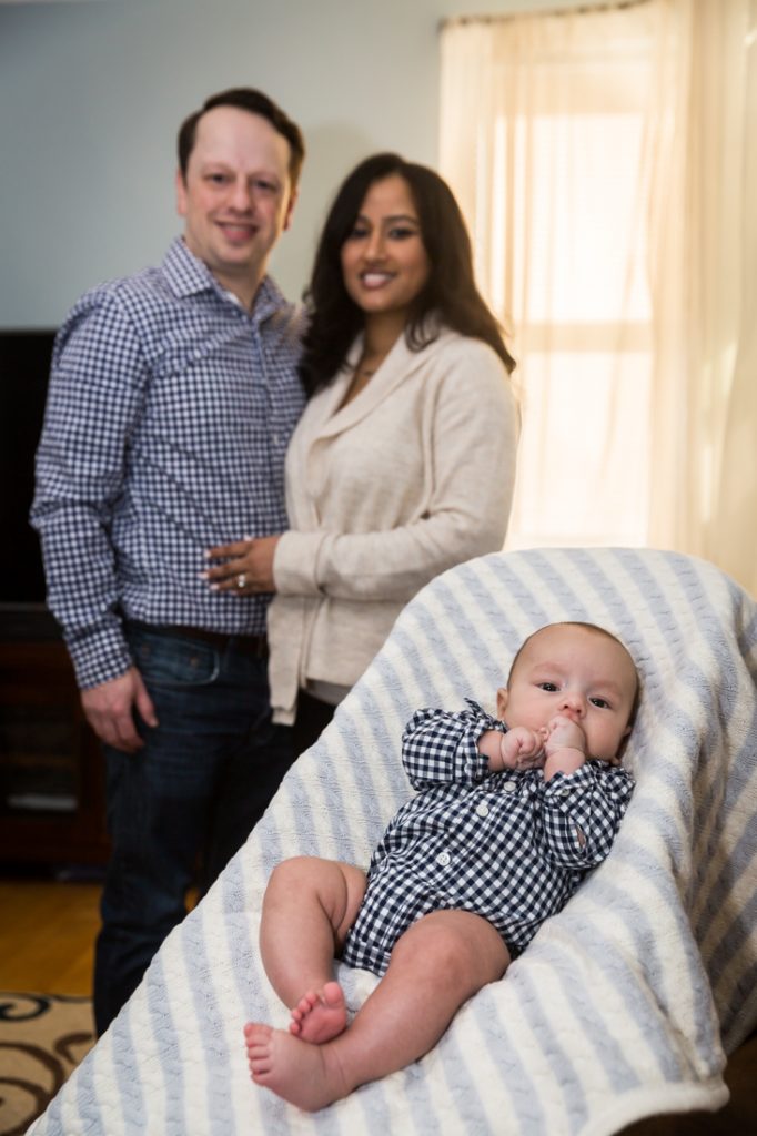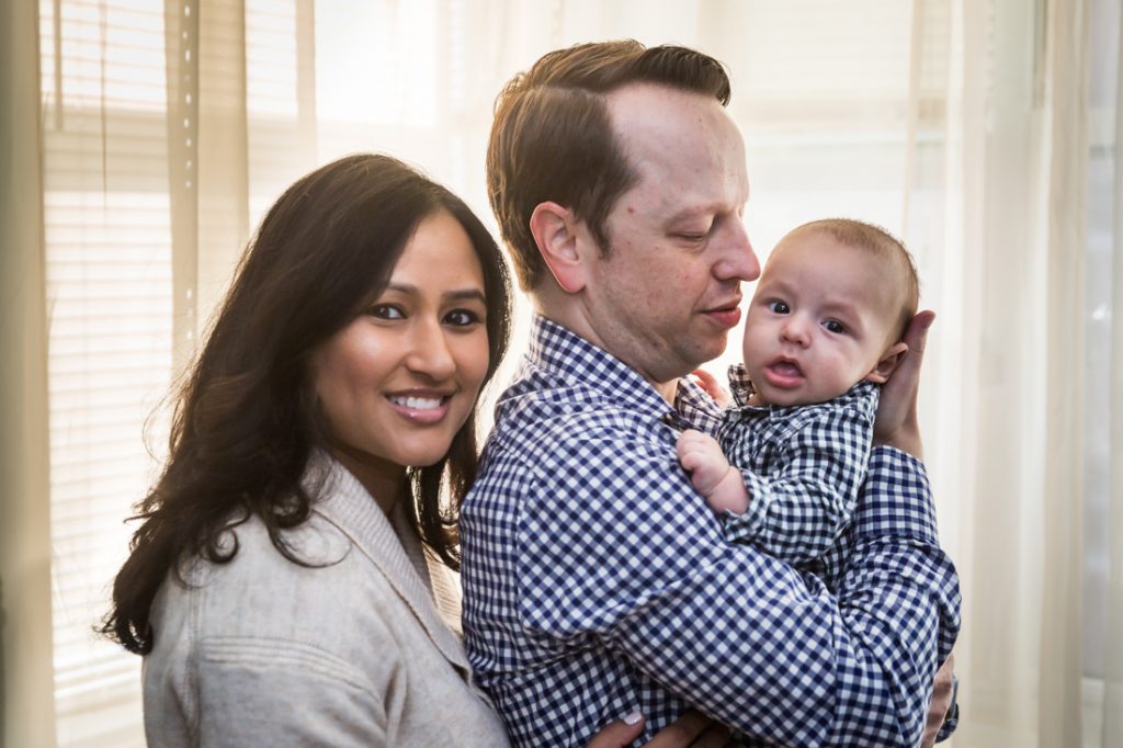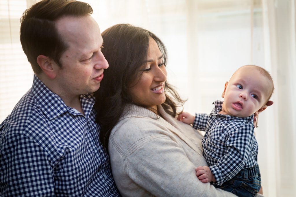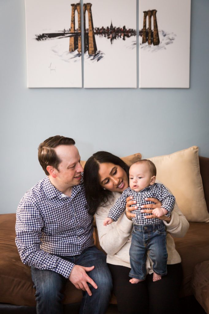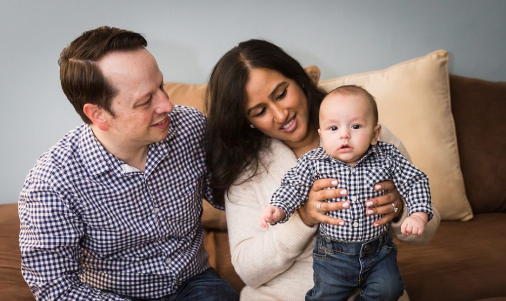 Plan for most of your family portrait to be indoors. Especially for little ones, I would plan for 30 minutes – tops – for any outdoor photos. With this in mind, have a warm indoor location at the ready. Your apartment doesn’t have to be spic and span for a photo shoot. You just need an empty couch and a window with light, as Nadira and Aaron’s portrait session can attest.