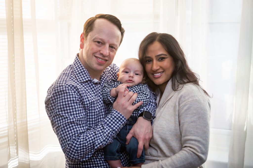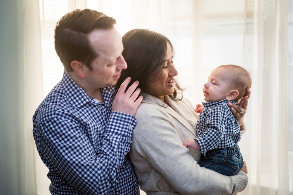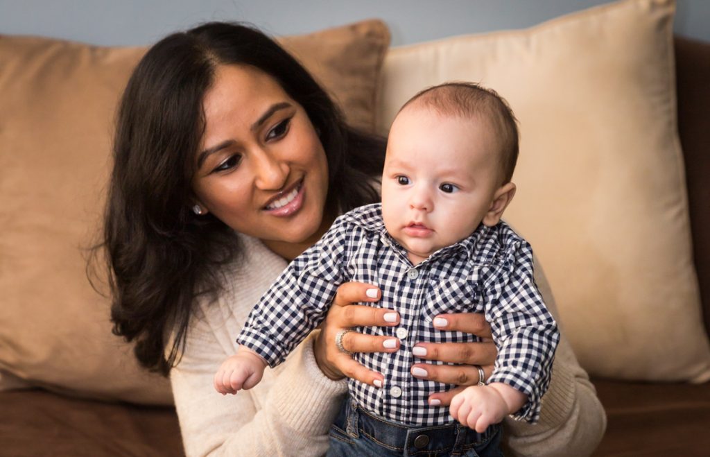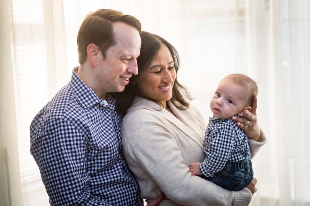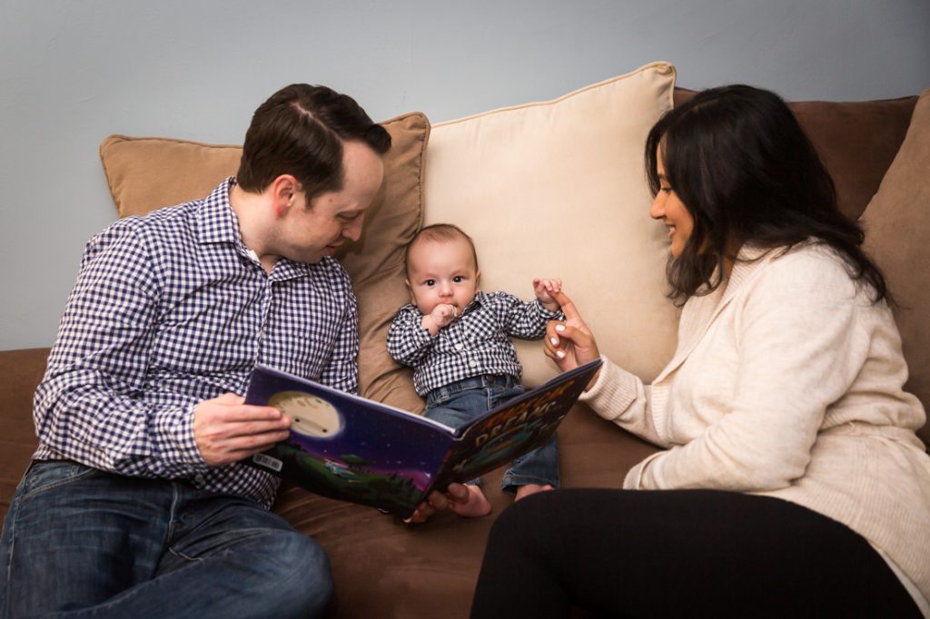 Plan for most of your family portrait to be indoors. Especially for little ones, I would plan for 30 minutes – tops – for any outdoor photos. With this in mind, have a warm indoor location at the ready. Your apartment doesn’t have to be spic and span for a photo shoot. You just need an empty couch and a window with light, as Nadira and Aaron’s portrait session can attest.