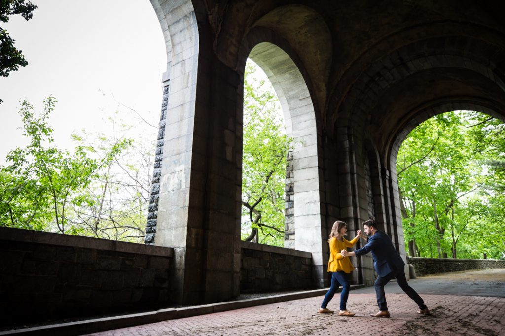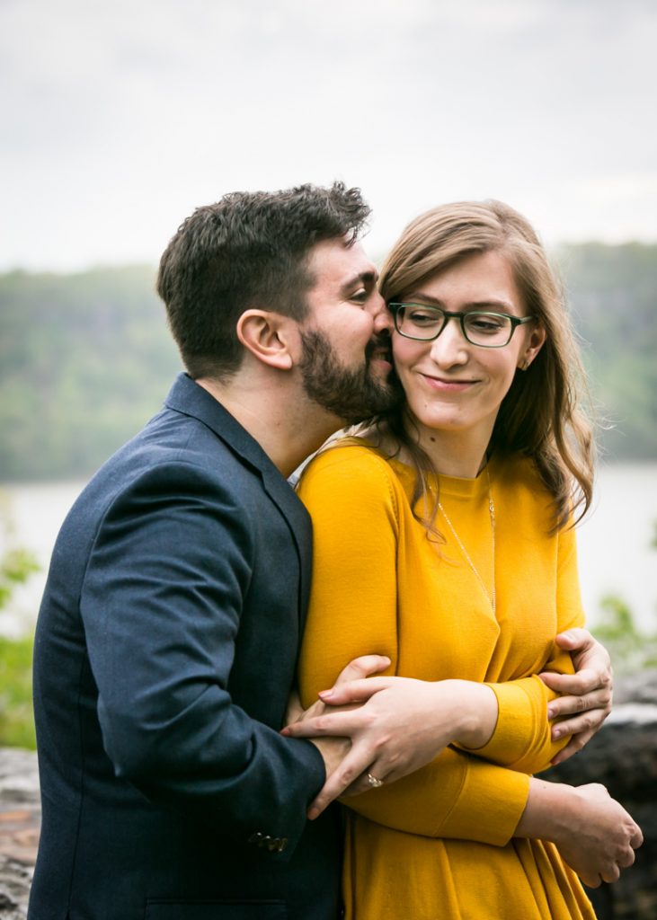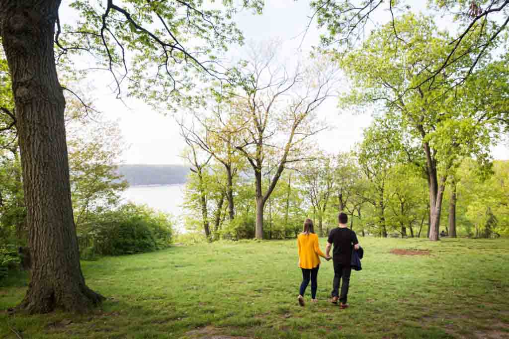 With a few photos under our belt, we next headed to Fort Tryon Park. This is the couple’s neighborhood park and home to the Cloisters Museum. Sadly, the Cloisters was still keeping winter hours during our session, and closed at 4:15 p.m. The park was a beautiful enough setting for our shoot, however, and the green trees were a welcome sign that spring is finally here.