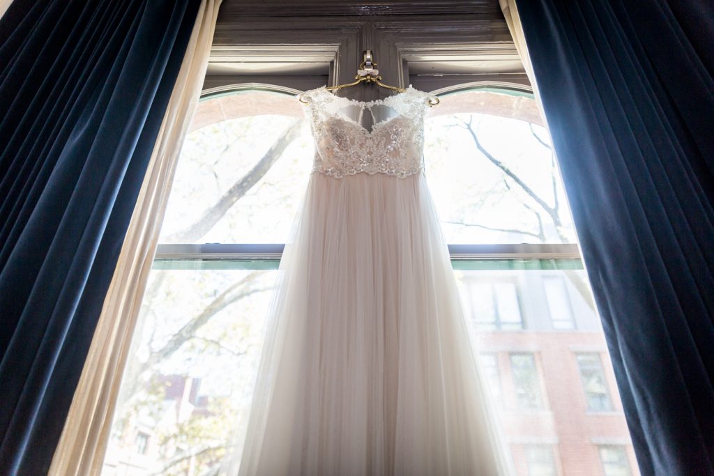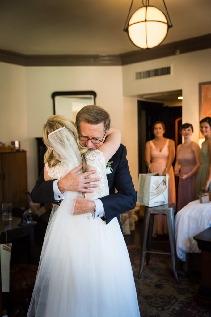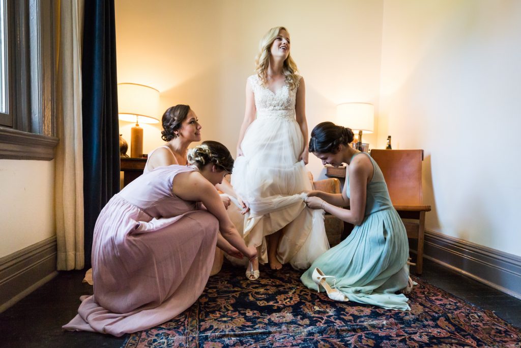 Let’s start our adventure at the High Line Hotel, where Stephanie and Shane got ready in separate rooms. This was my first time at the hotel and the urban hunting lodge elegance of the space was perfectly fitting for the forest theme of the couple’s wedding. Wisely, there was plenty of time packed into the schedule for all the special ‘getting ready’ moments to be caught on camera: Stephanie’s mother helping her put on her dress, her father seeing her in her wedding dress for the first time, and Stephanie and Shane opening gifts from one to another. Seeing Stephanie tear up as she read Shane’s letter left not a dry eye in the bridal suite.