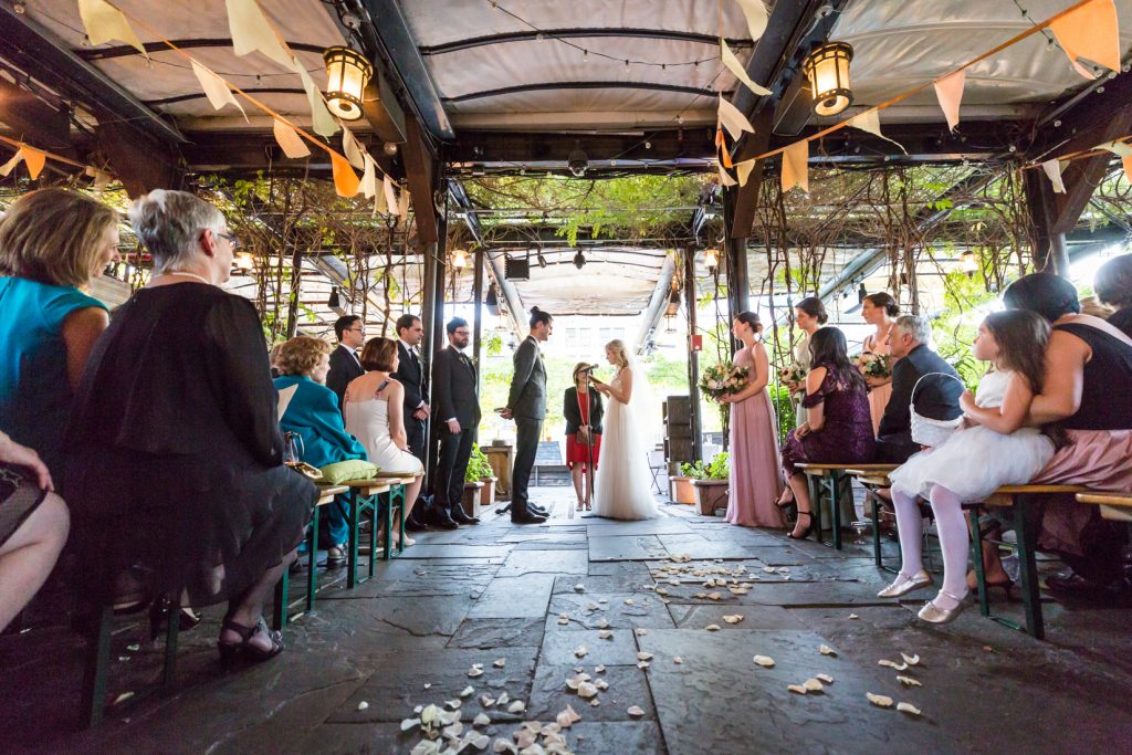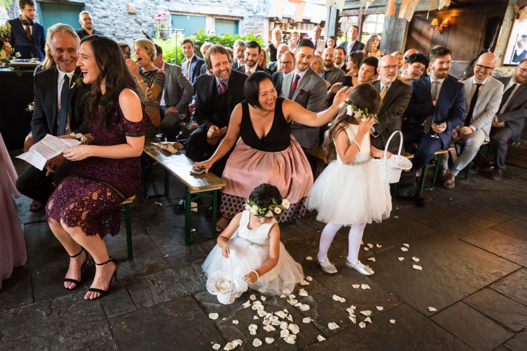 After the family portraits were taken on the roof, everyone walked over to Gallow Green where Stephanie and Shane signed their marriage license making them officially man and wife. The only thing left was the show! And with that, the ceremony began. The nuptials started on a hilarious note with the two precious little flower girls, Willow and Ela, walking down the aisle. They both walked marvelously, but didn’t actually disperse any of the petals. All was well until one the bridesmaids helpfully dumped out all of the rose petals. Then chaos ensued. Willow unsuccessfully tried to put her petals back in the basket, and then burst into tears. Ela, meanwhile, was having a hard time with her flower crown falling into her eyes.