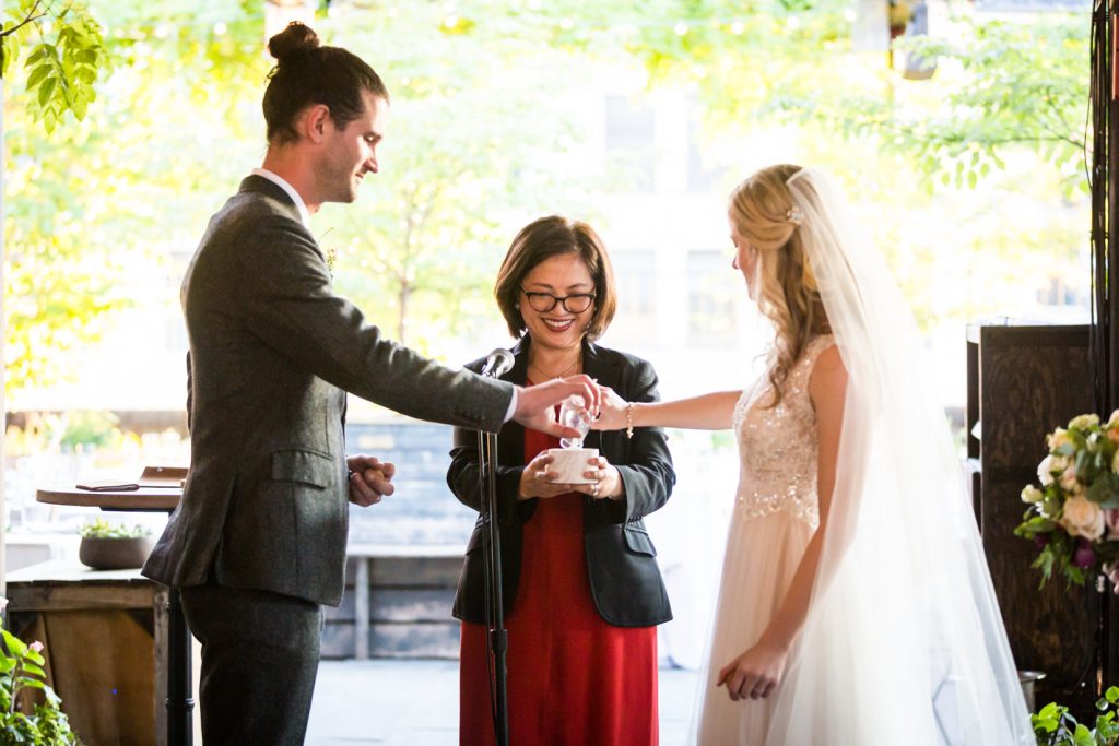 The mood changed when Stephanie walked down the aisle and locked eyes with Shane. As the sun set over the rooftop deck, the couple said their vows. They included a salt pouring ceremony where they both poured salt into a container to symbolize the coming together of two into one.