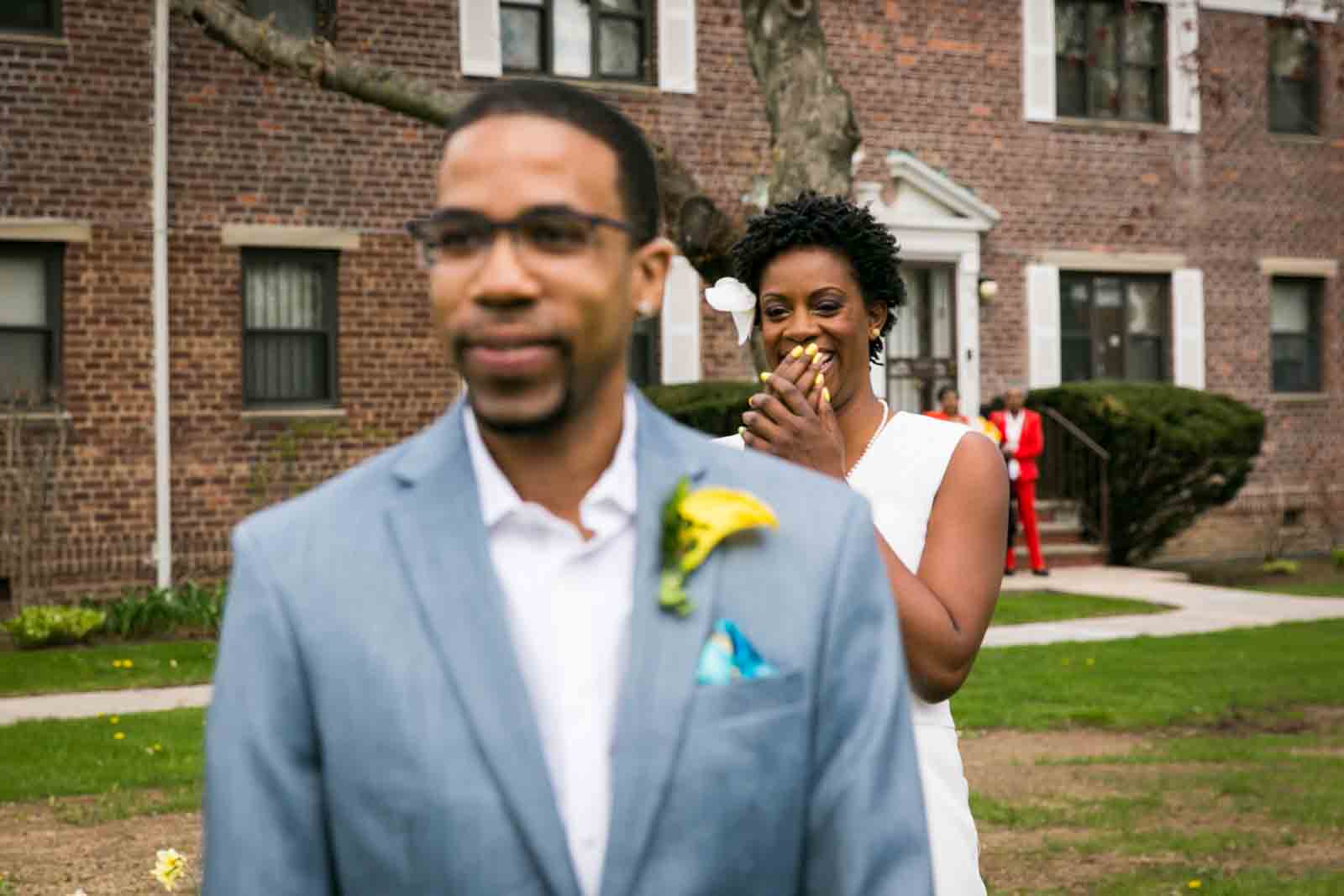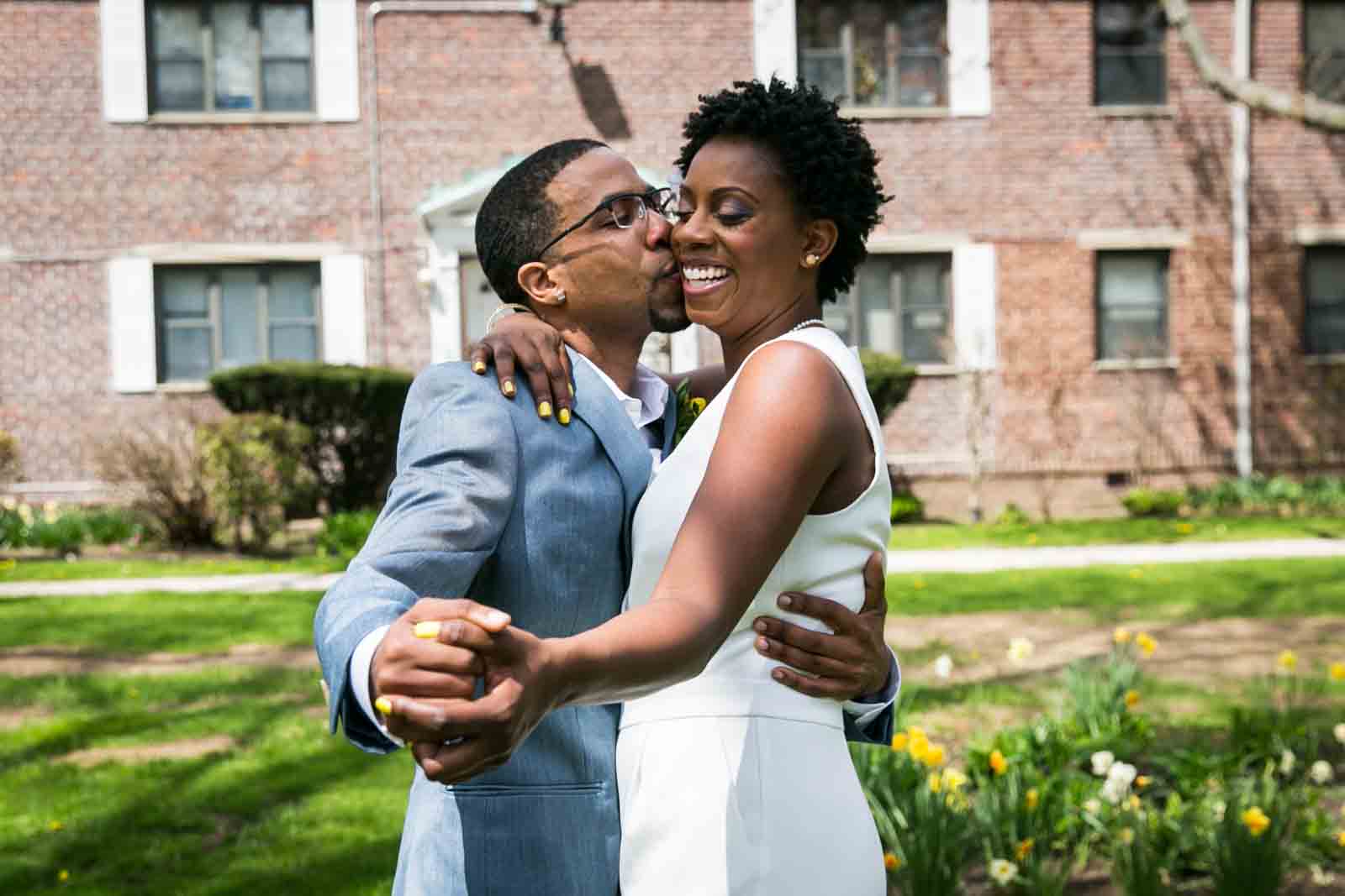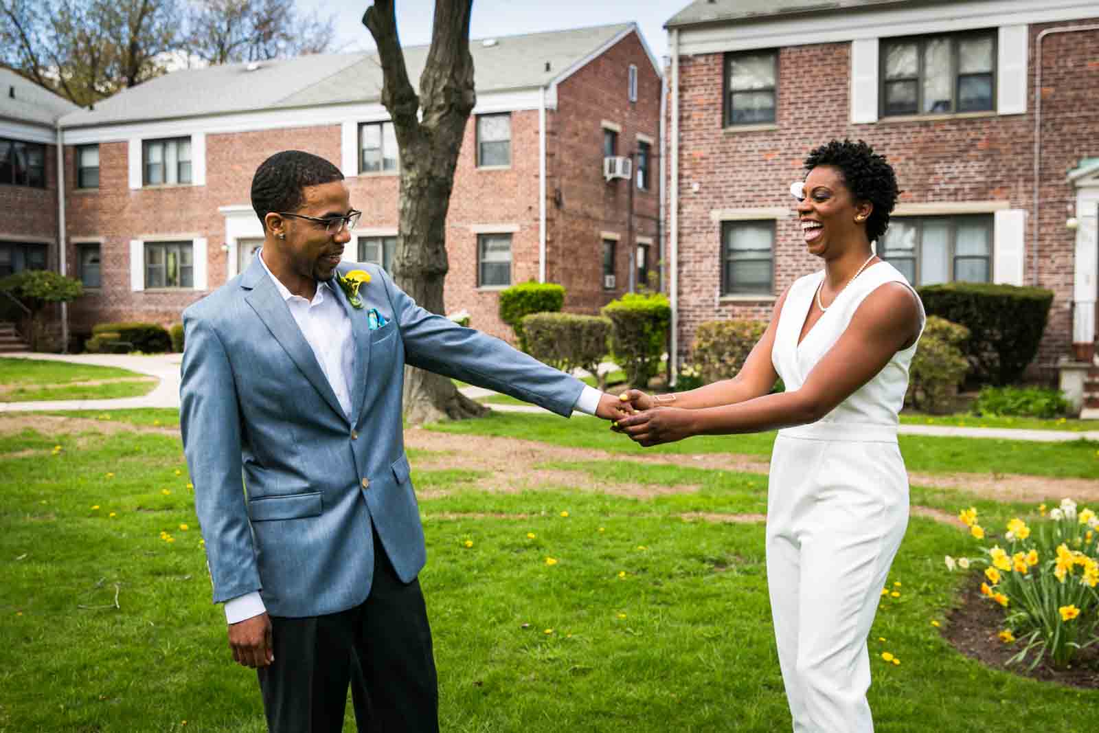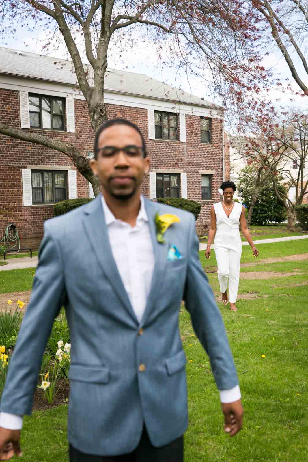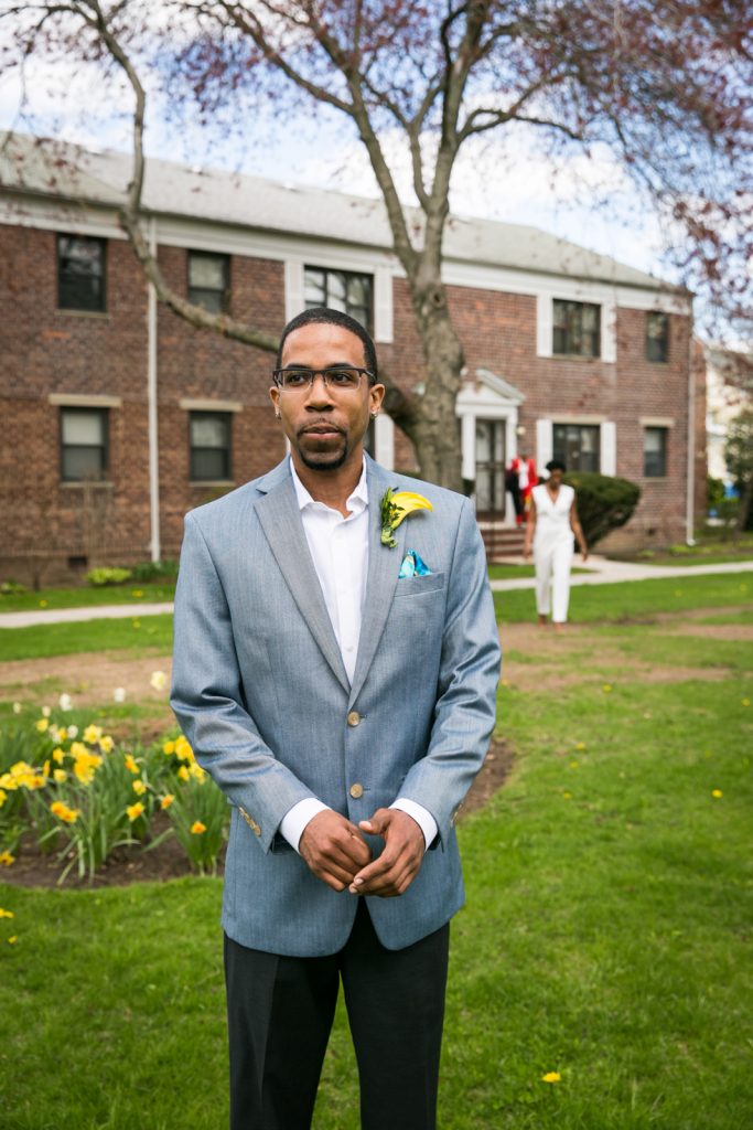 Enjoy the photos of Melanie and Jalani that are accompanying this article. I was thrilled to photograph these two in 2013, and they truly had the perfect first look in the front yard of their Jamaica, Queens apartment complex. By the way, Melanie’s chic jumpsuit was just profiled in an article in the New York Post. It’s a great piece on non-traditional wedding outfits – read all about it here.