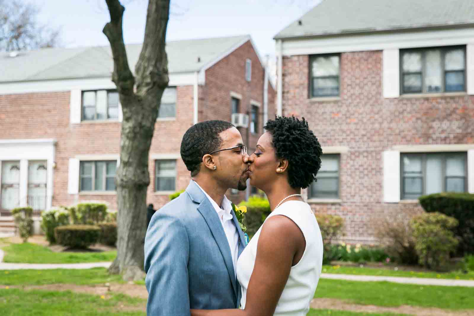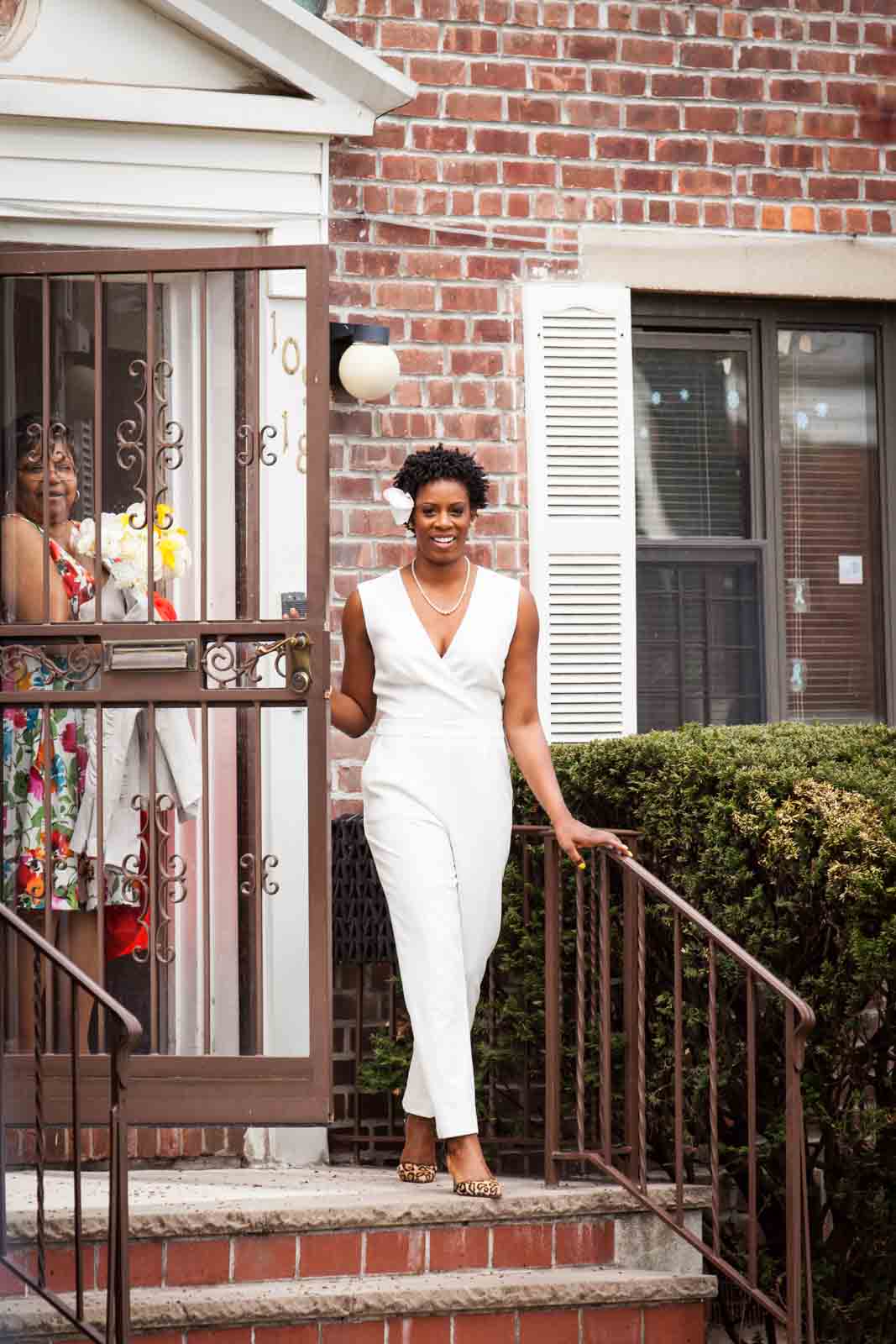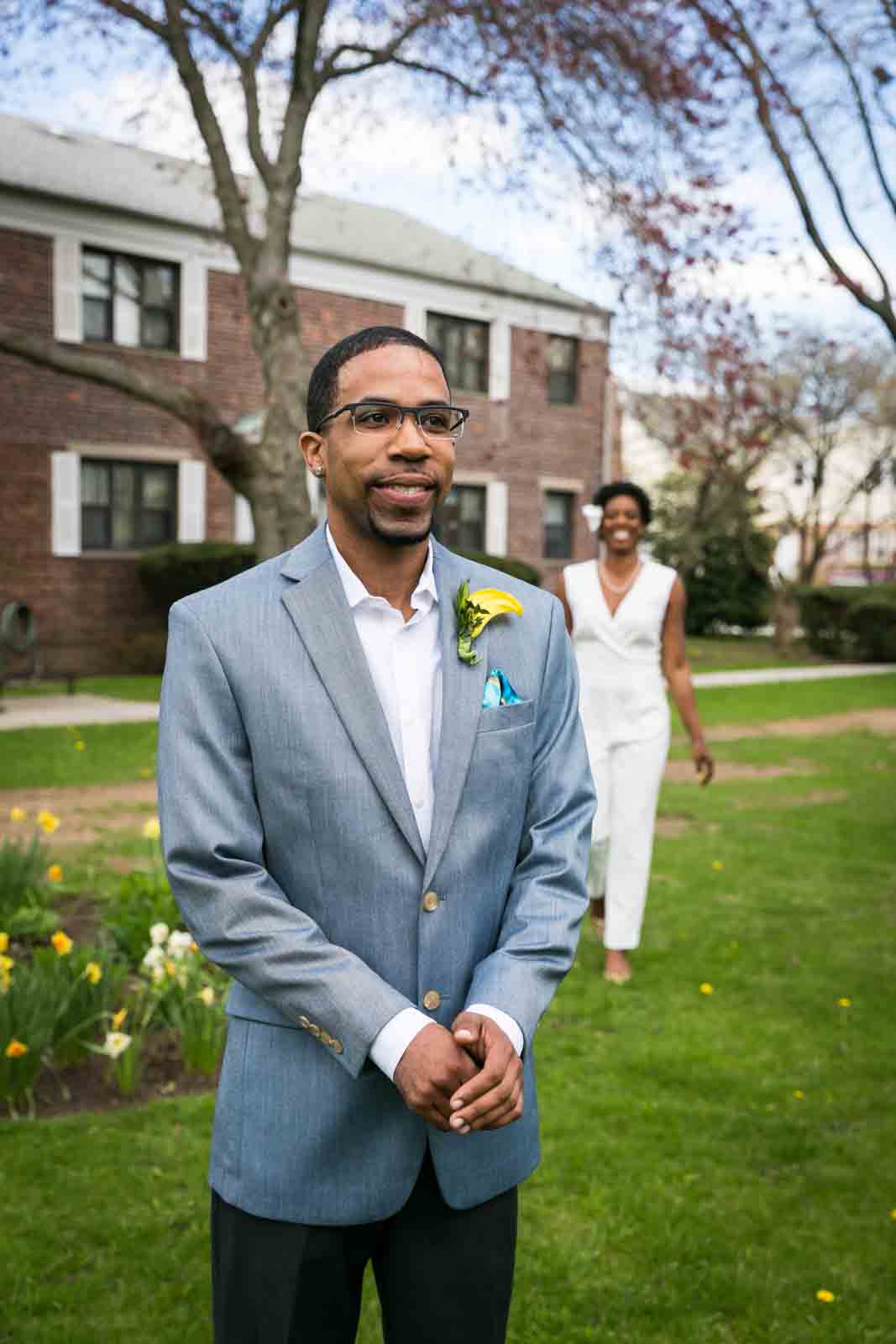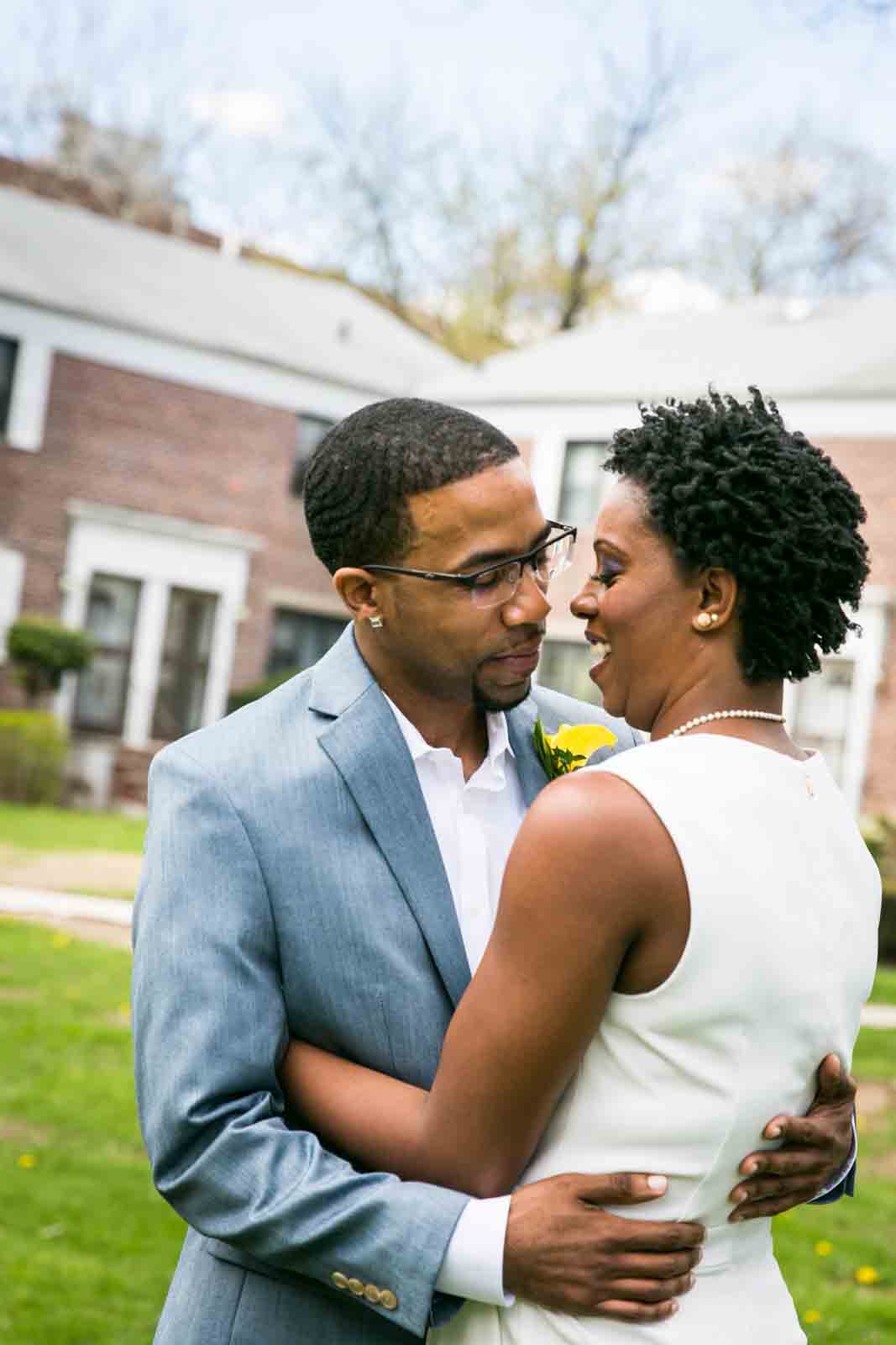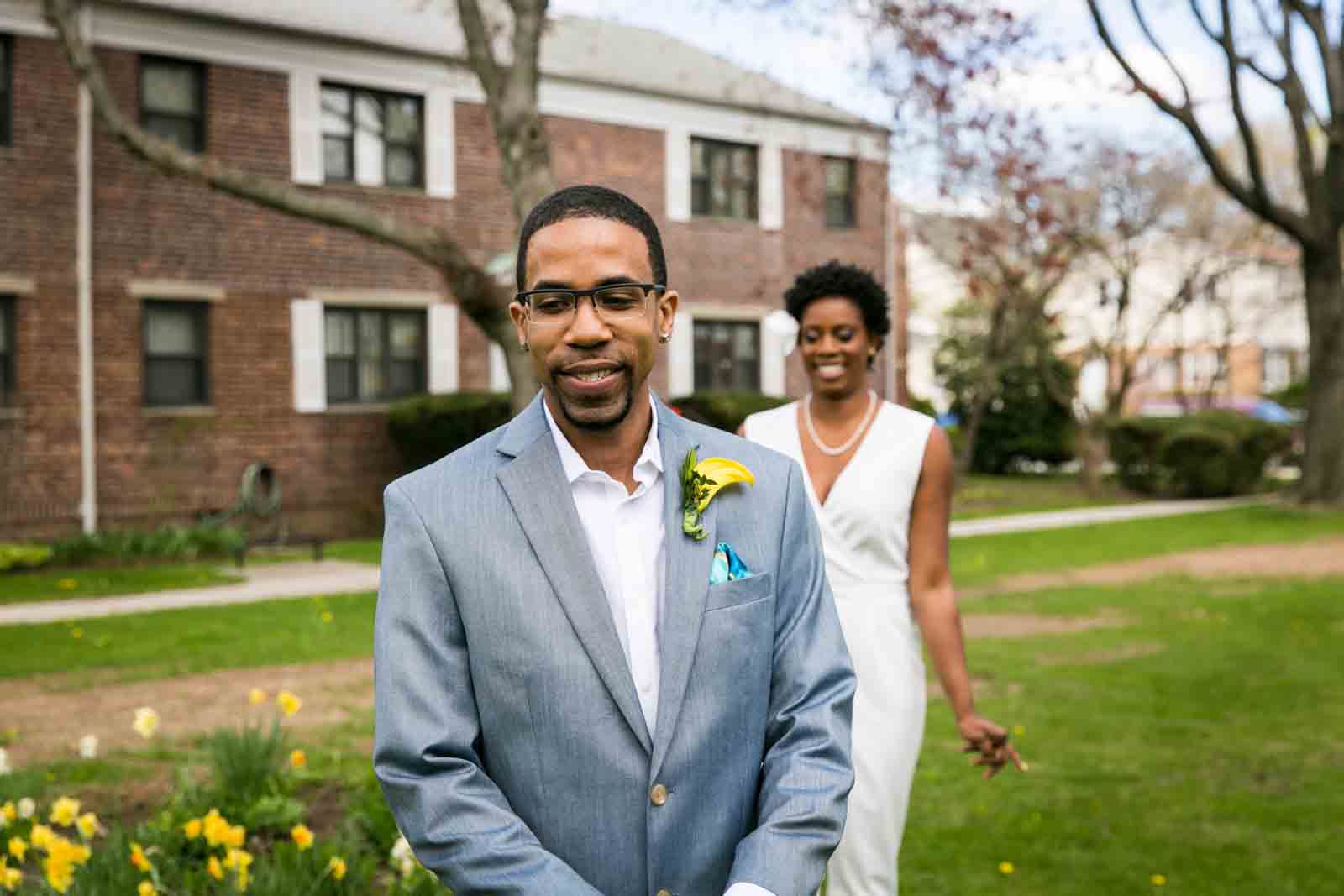 Enjoy the photos of Melanie and Jalani that are accompanying this article. I was thrilled to photograph these two in 2013, and they truly had the perfect first look in the front yard of their Jamaica, Queens apartment complex. By the way, Melanie’s chic jumpsuit was just profiled in an article in the New York Post. It’s a great piece on non-traditional wedding outfits – read all about it here.