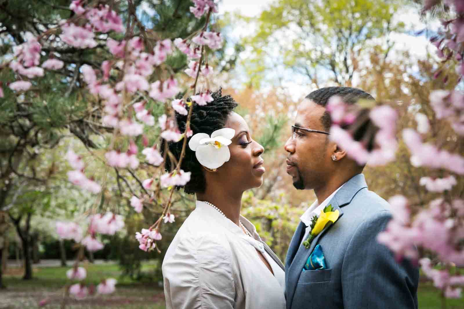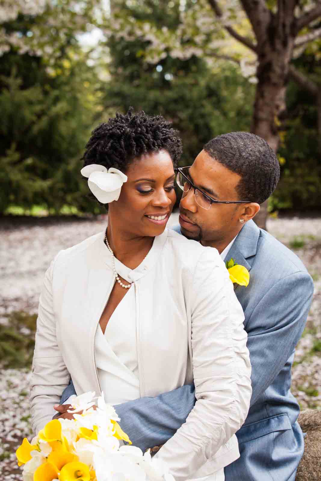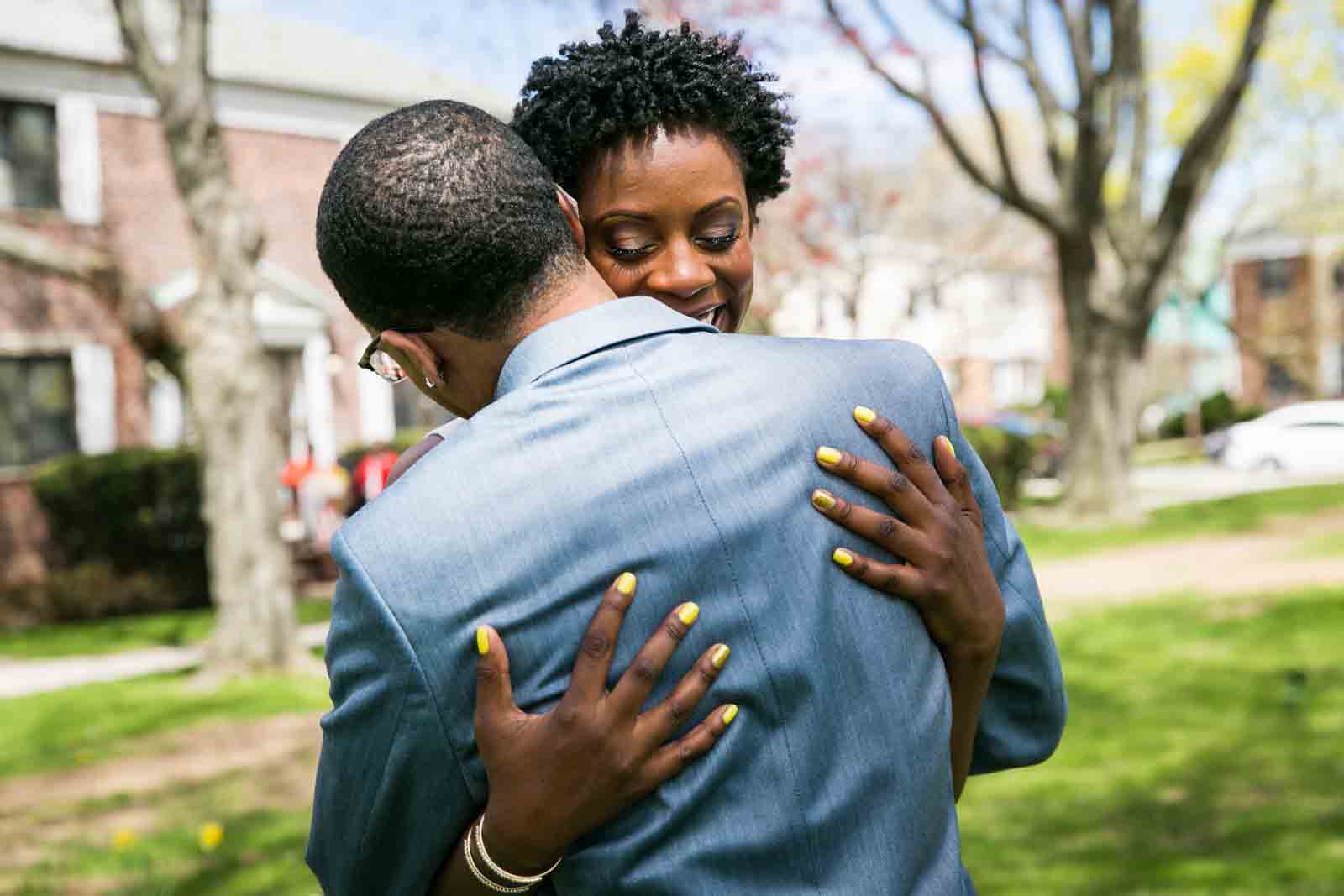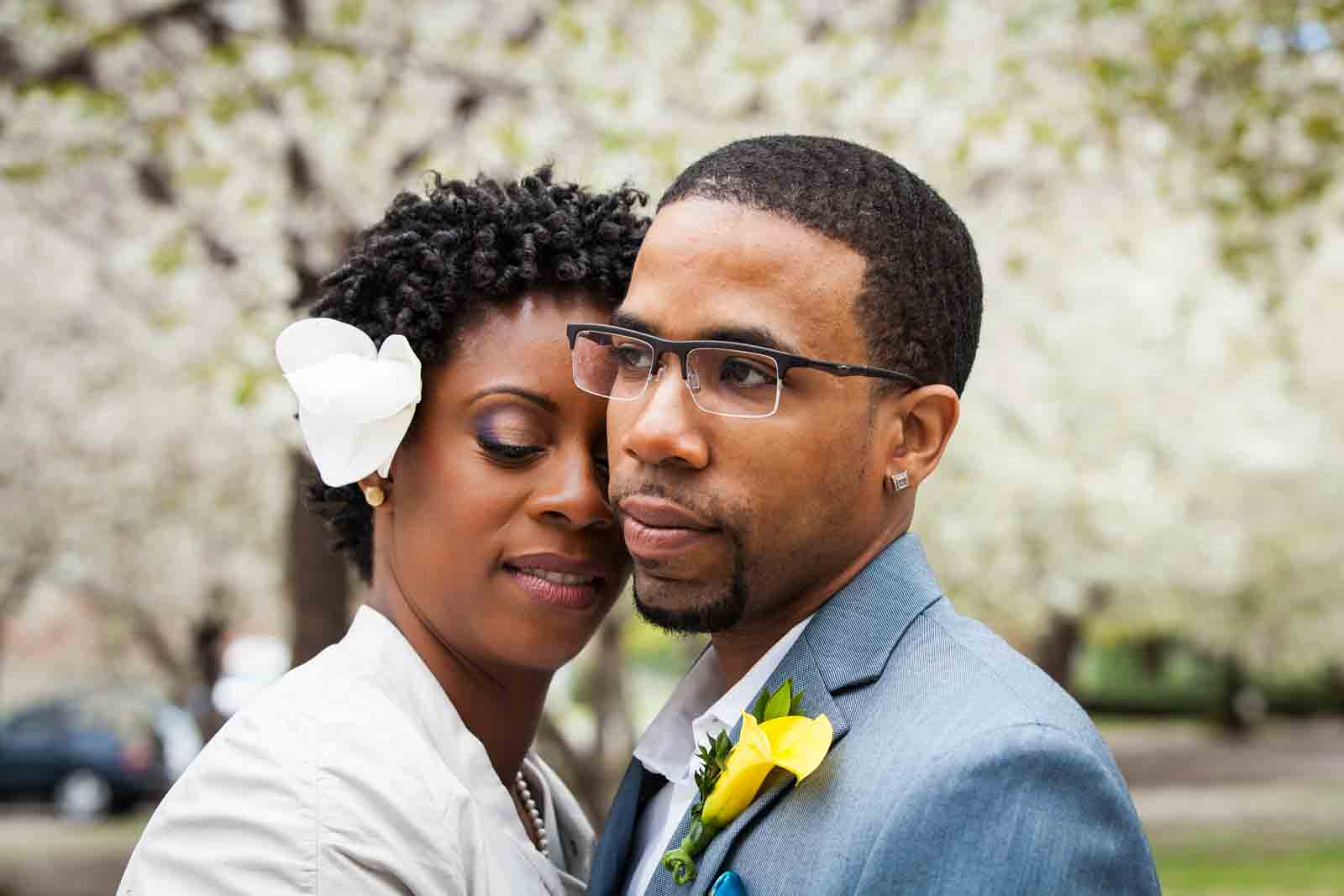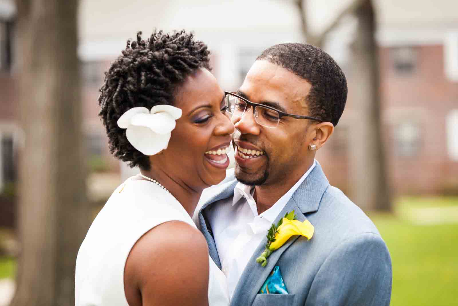 Enjoy the photos of Melanie and Jalani that are accompanying this article. I was thrilled to photograph these two in 2013, and they truly had the perfect first look in the front yard of their Jamaica, Queens apartment complex. By the way, Melanie’s chic jumpsuit was just profiled in an article in the New York Post. It’s a great piece on non-traditional wedding outfits – read all about it here.
