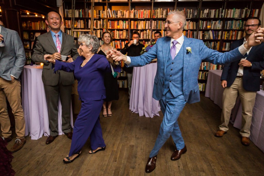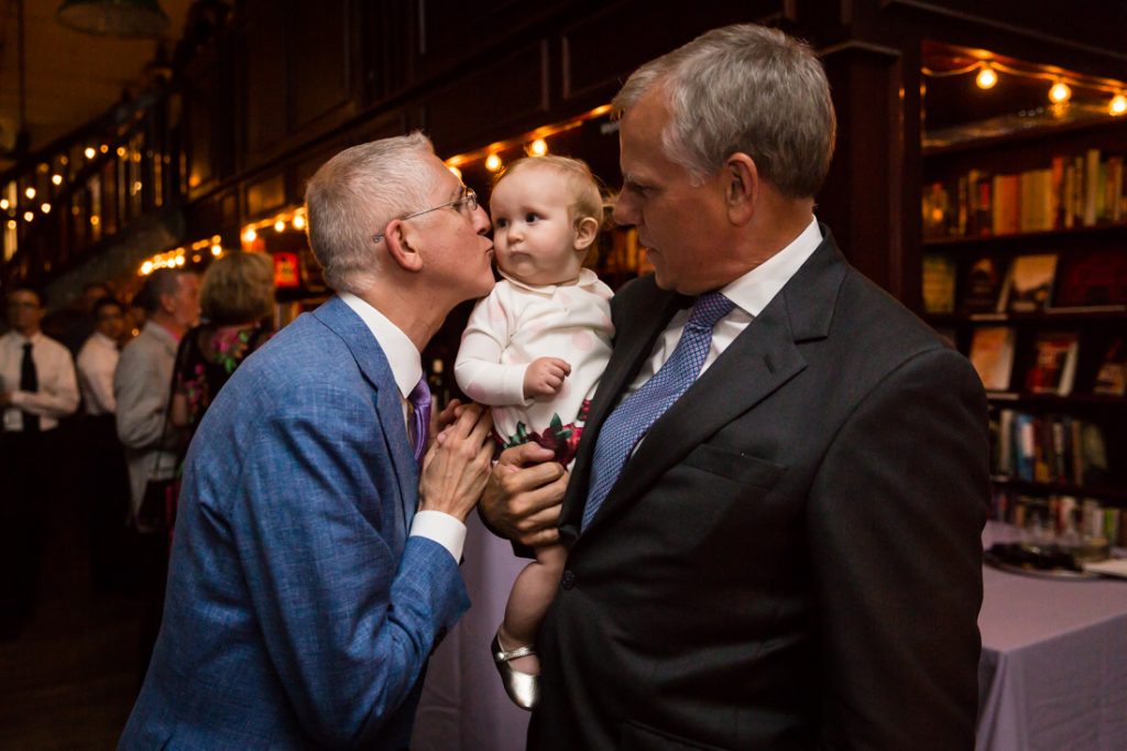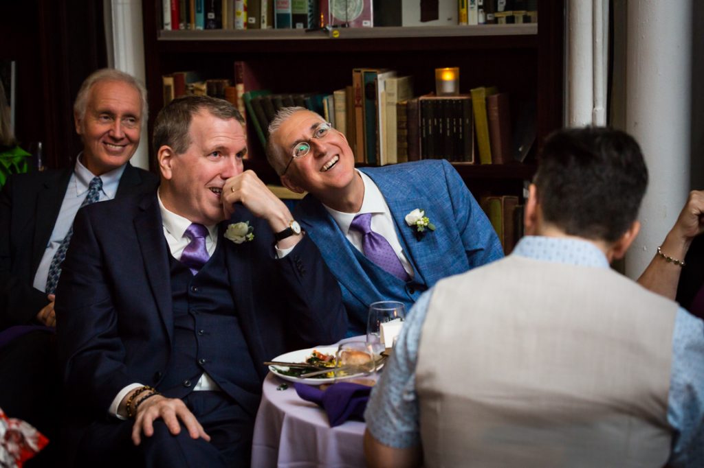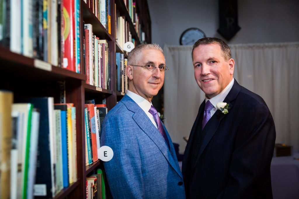 The couple’s flowers were beautiful, but low key. Chris and Rob used books (of course) to supplement the centerpieces on each table. This is a fantastic idea to split up your centerpieces and use non-flower materials to cut costs. Also, note that the flowers were low, and thus guests could talk to one another over the flowers. In terms of boutonnieres, each groom had a matching, simple flower on his lapel, while the mothers of the grooms had wrist corsages.