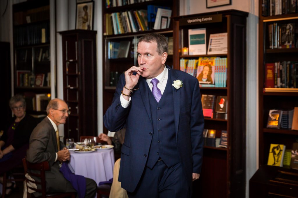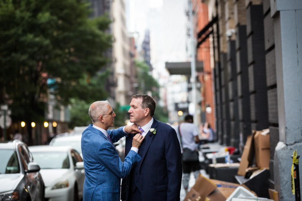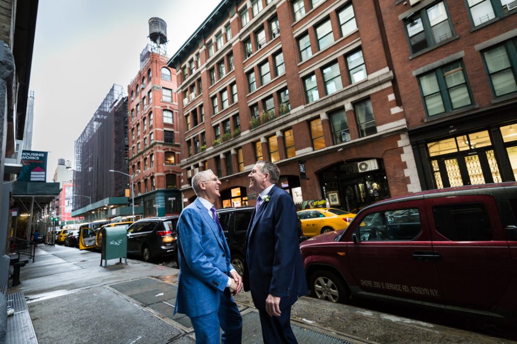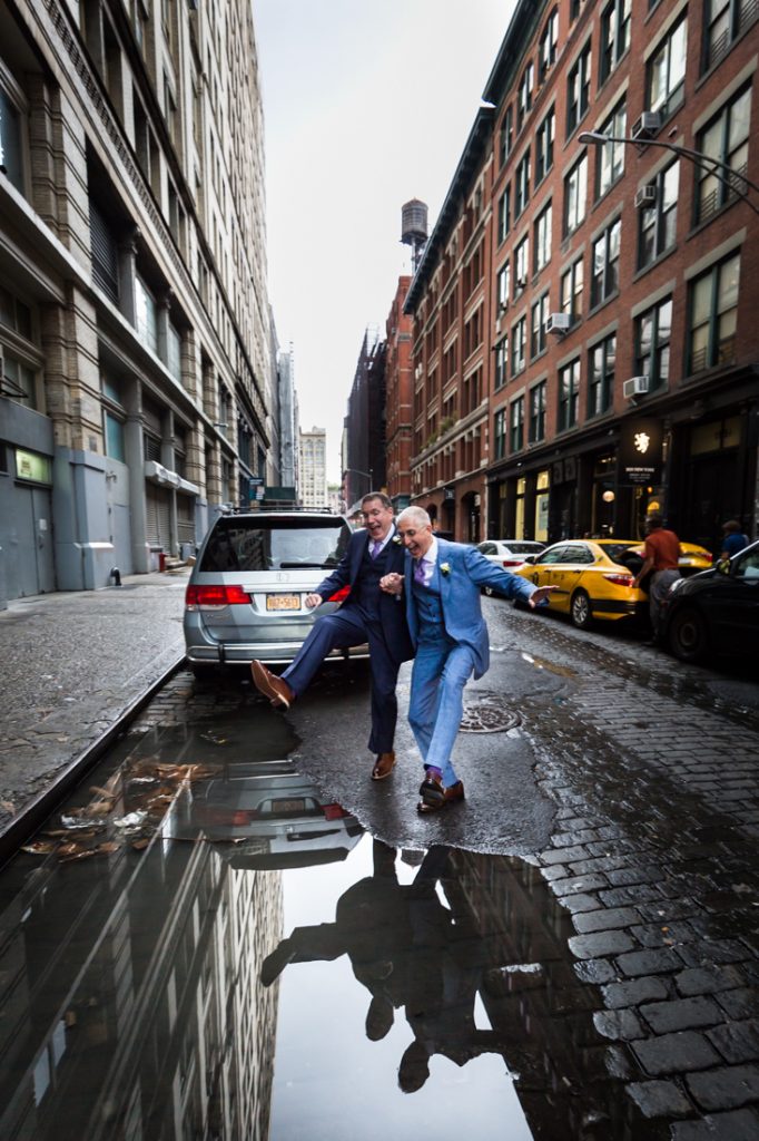 I was scheduled to photograph the wedding for four hours. This is not a lot of time when you factor in portraits, a ceremony, cocktail hour, and reception, so the key was to be organized ahead of time. I worked with Chris and Rob to create a timeline for their day, and the plan went off without a hitch. We started with portraits of Chris and Rob. As I mentioned, it had been raining all morning, so the bad weather plus the fact that the area is currently mired in construction meant that I concentrated our portrait session inside the bookstore. On my venue check the previous weekend, I found ugly scaffolding everywhere. That, plus the fact that the SoHo neighborhood has become such a mecca for tourists made me want to stay inside for the majority our shots. I made sure to work around the event staff who were assiduously putting together the wedding, and stayed mainly on the mezzanine level. One upside to the couple’s table configuration for 90 guests is that the moveable staircases were available to be used as props. In most of the other Housing Works Bookstore Café weddings I have photographed, there were long tables for guests to sit at thereby preventing access to the bookcases. The open seating plan for Chris and Rob allowed me to make full use of the bookstore, and the venue felt so much more accessible this time. We did end up taking a few photos outside, and the big puddles were a great photo opportunity. In comparison, check out the photos from another Housing Works Bookstore Café wedding I shot a few years ago where we did the majority of the photos in the neighborhood.