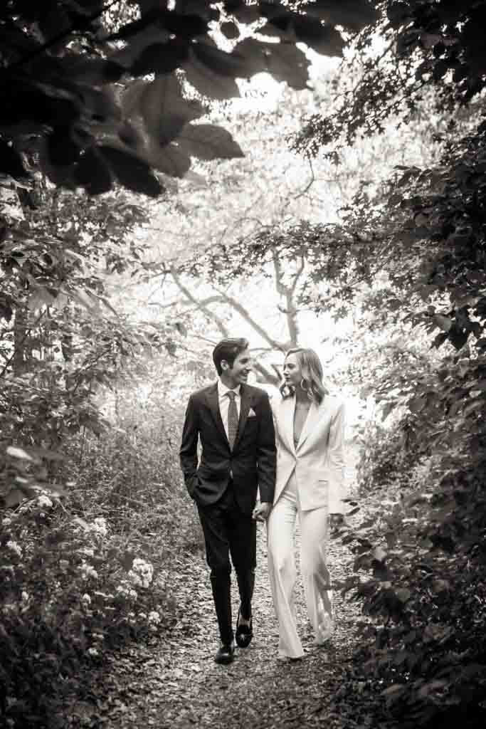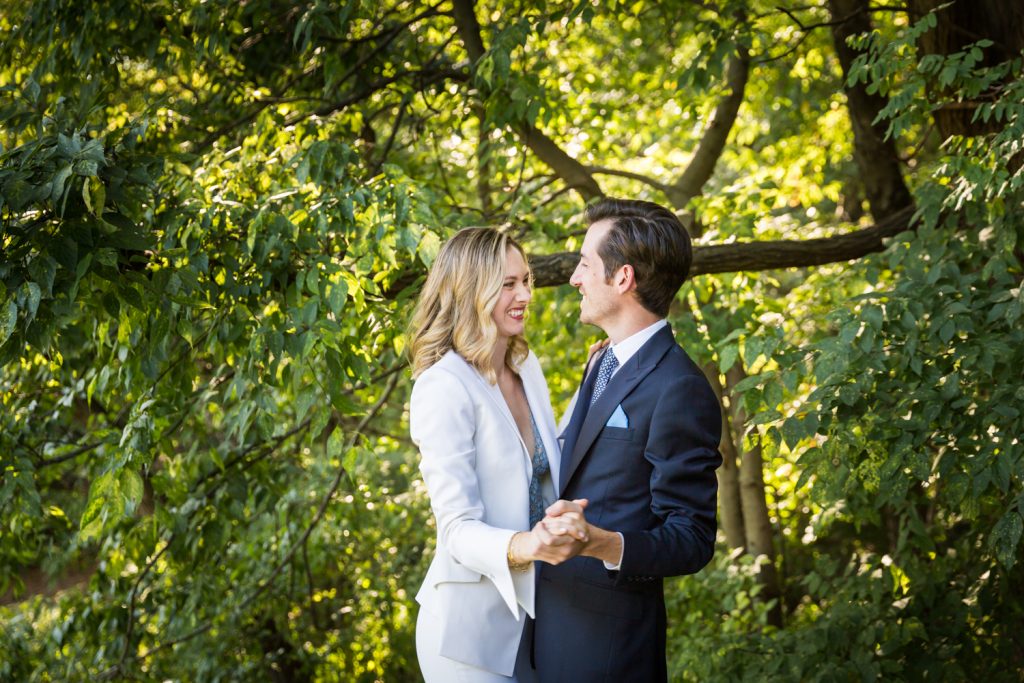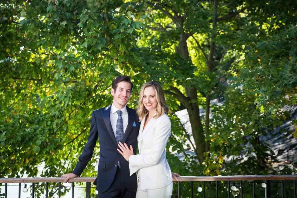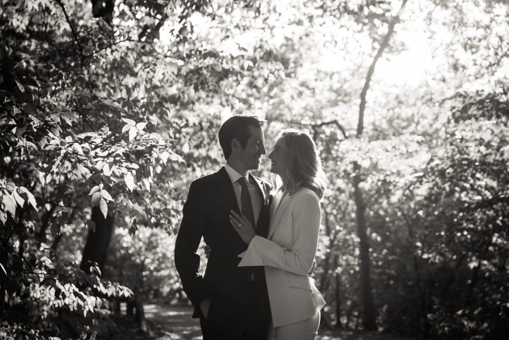 To begin, with, Hayden and Brett are not huge fans of crowds. It just so happens that on the day of their wedding, Central Park was hosting its annual Oktoberfest celebration. The park was teaming with drunk tourists trying to appear German. To avoid the crowds, I began the couple’s photos first on the private patio of the Loeb Boathouse, and then moved over to the Ramble. While this part of the park is normally sparsely trafficked by visitors, on that particular day we hardly had the place to ourselves. Still, we got some beautiful photos in the forest and it was far less crowded than in the Bethesda Fountain area.