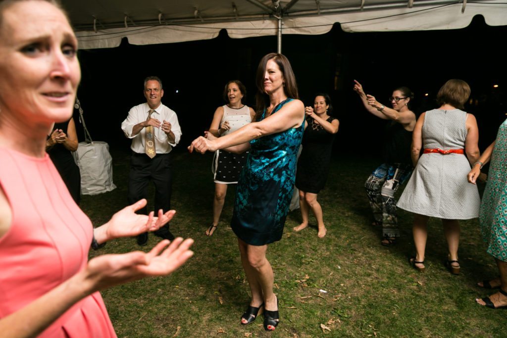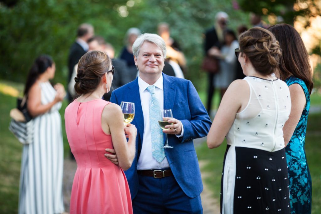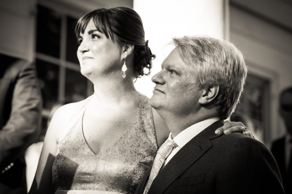 If you would like to include a shot of all of your guests first make sure you tell your photographer in the planning stages. This means well before your event is scheduled to take place. From a technical stand point, the main factor for making the photo a success is height. The photographer has to get up high enough to ensure that everyone is in the frame. I always carry a small step ladder with me to every shoot. It comes in handy for groups of up to 20 people, not to mention putting me at eye level with tall folks. But if the size of your group extends much beyond 20, then this requires a taller vantage point from say, a mezzanine level or a staircase. In the case of Denise and Tom’s wedding (with 150 guests attending), it required using a ladder provided by the venue. Not a problem at all, but definitely something you should not spring on your photographer.