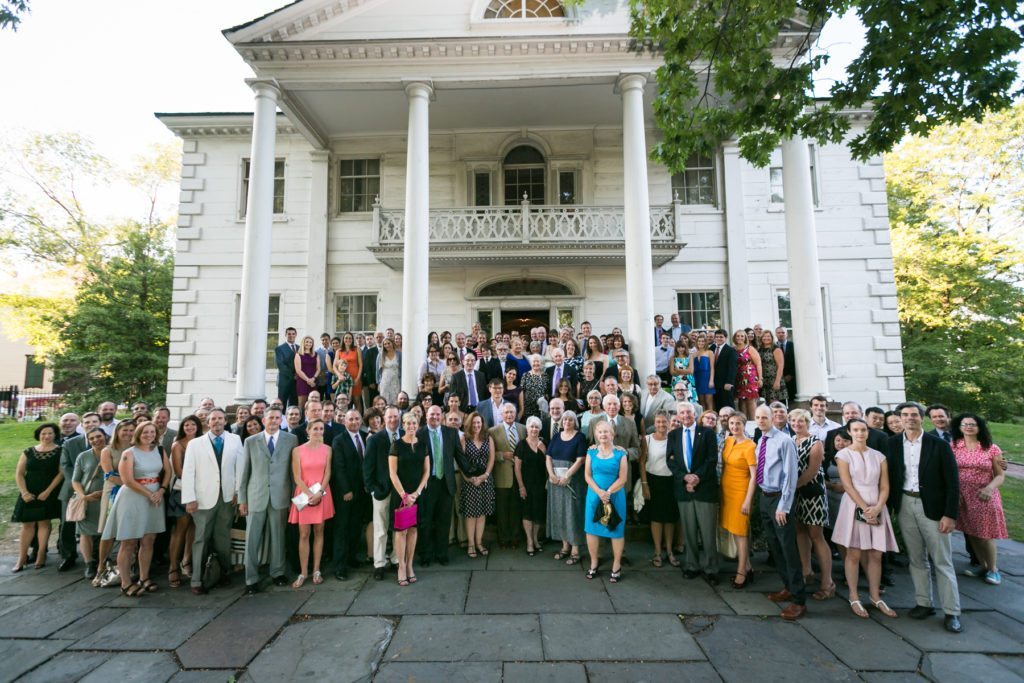 The other issue is timing. Photographing a large group is akin to herding cats. Every one wants to go off and do their own thing (or head straight to the bar). No one wants to assemble for the photographer. I suggest you time the shot directly following the ceremony. All the guests will be together, and dare I say, still sober. If you don’t have enough space – or light- at the ceremony venue, then schedule the shot as the first activity of your cocktail hour.