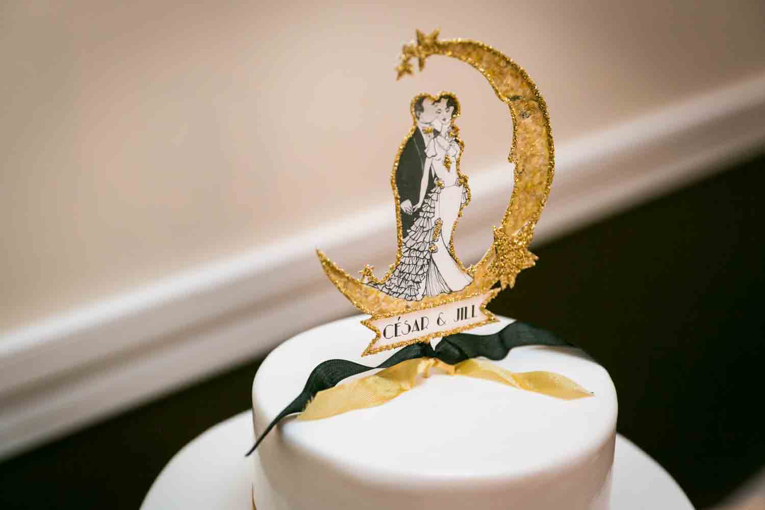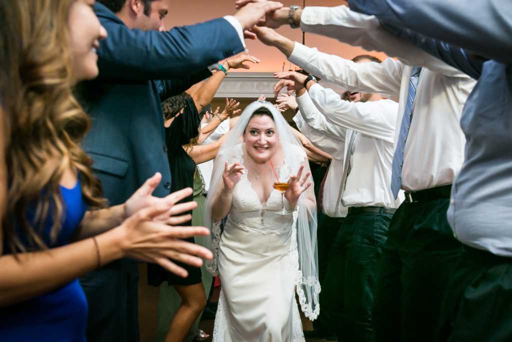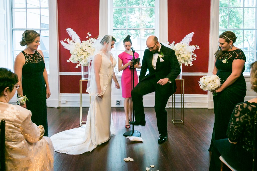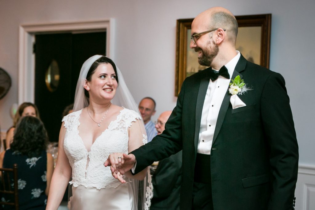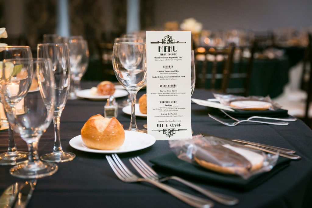 The ceremony was touching, and it was wonderful to see the look in Cesar’s eyes when he saw the doors open and Jill emerge in her beautiful dress. A few things to note: first, be sure to notice the delicate feathers that are part of the floral arrangements at the front of the room, in Jill’s bouquet, and throughout the wedding. Jill had a 1920s-theme as reflected in the art deco font style on the menu cards, the box used to collect cards from guests, and the whimsical cake topper. Second, the couple personalized their secular ceremony to reflect the Cesar’s heritage by including the traditional Jewish glass breaking. In addition, the ceremony was spoken in English and in Spanish in order to accommodate guests that had traveled from Cesar’s home town of Puerto Rico for the wedding. Finally, don’t miss the shy little flower girl, Anika, who moments earlier had been bouncing off the furniture while the bride was getting ready. She was precious, and regained her energy on dance floor.
