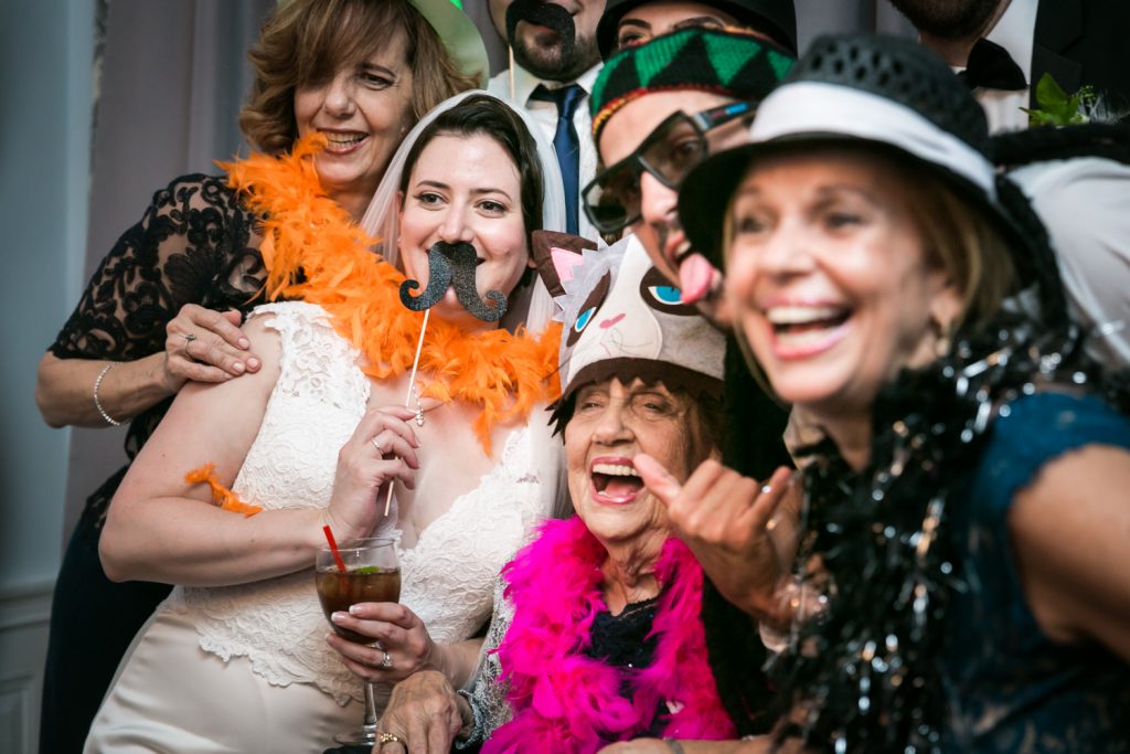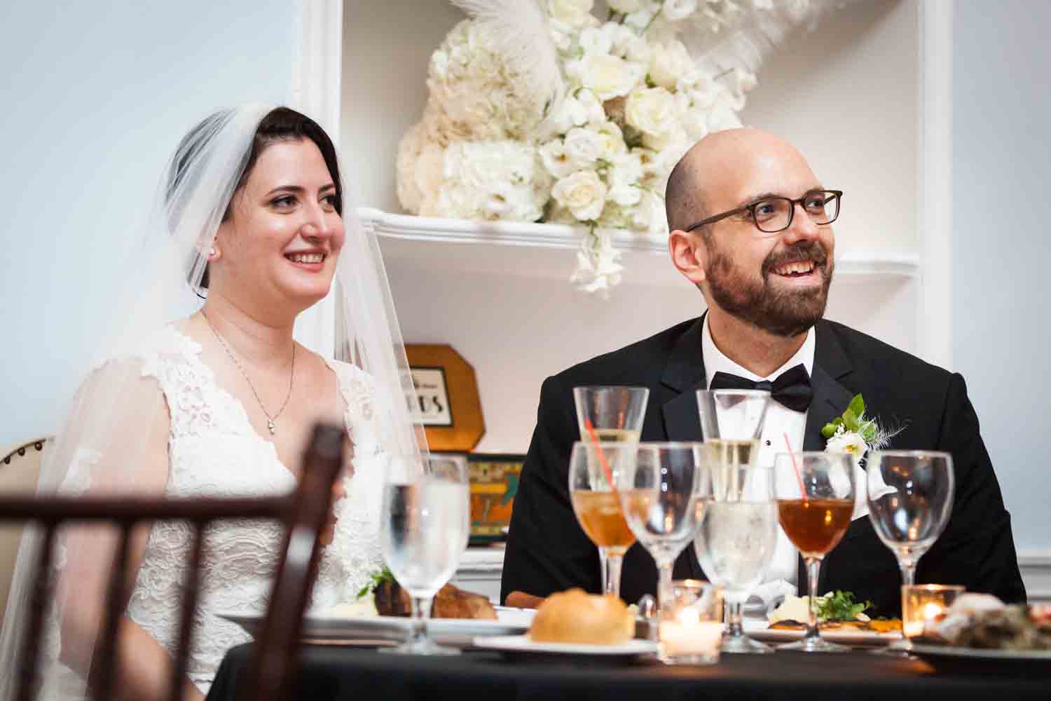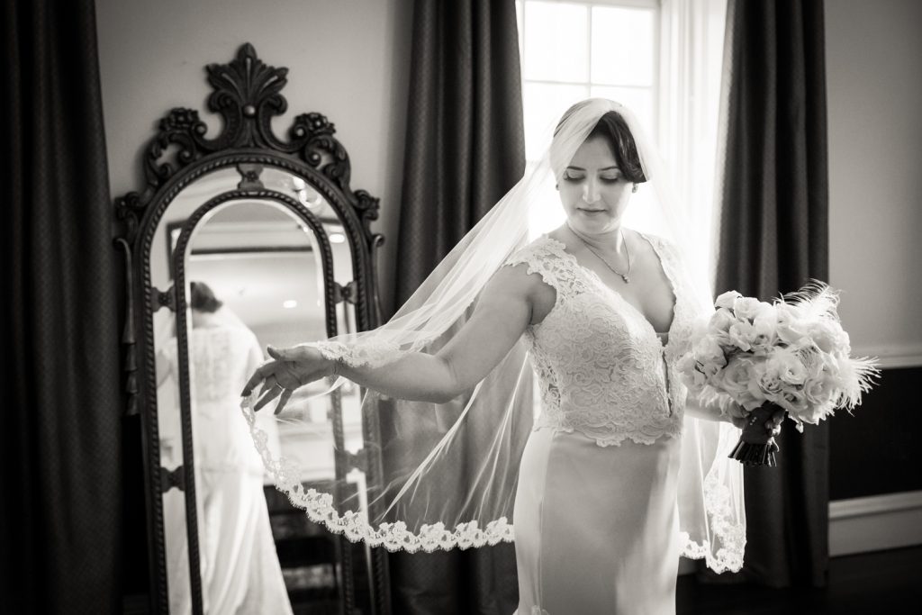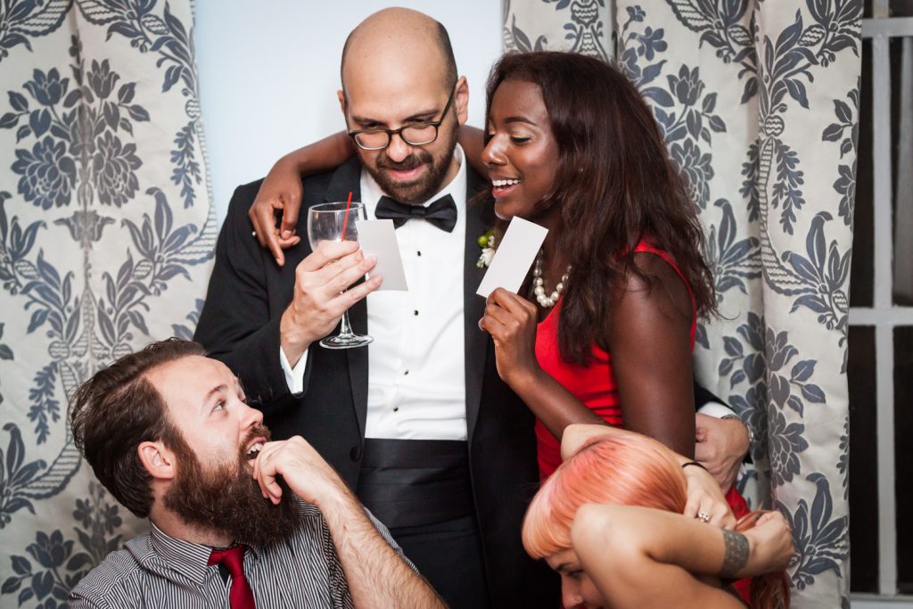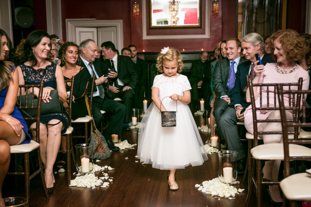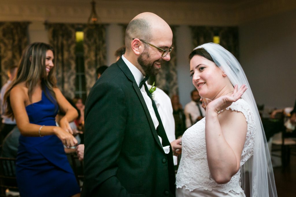 The ceremony was touching, and it was wonderful to see the look in Cesar’s eyes when he saw the doors open and Jill emerge in her beautiful dress. A few things to note: first, be sure to notice the delicate feathers that are part of the floral arrangements at the front of the room, in Jill’s bouquet, and throughout the wedding. Jill had a 1920s-theme as reflected in the art deco font style on the menu cards, the box used to collect cards from guests, and the whimsical cake topper. Second, the couple personalized their secular ceremony to reflect the Cesar’s heritage by including the traditional Jewish glass breaking. In addition, the ceremony was spoken in English and in Spanish in order to accommodate guests that had traveled from Cesar’s home town of Puerto Rico for the wedding. Finally, don’t miss the shy little flower girl, Anika, who moments earlier had been bouncing off the furniture while the bride was getting ready. She was precious, and regained her energy on dance floor.
