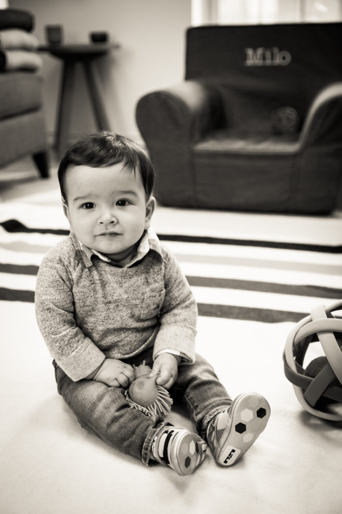 Concentrate on your most important photos first. As with my last round of baby portrait tips, know your child. Make a list of your priority photos so that we can ‘bank’ these images first while your little one is in a state of prime happiness. In the case of Amish and Megan, they really wanted photos of little Milo in his chair and with his blocks. We knocked these photos out first, and then every other image was a bonus. Who knows? If time and temperament permit, you may actually get a few shots outside. Seeing snow for the first time is always a great photo!