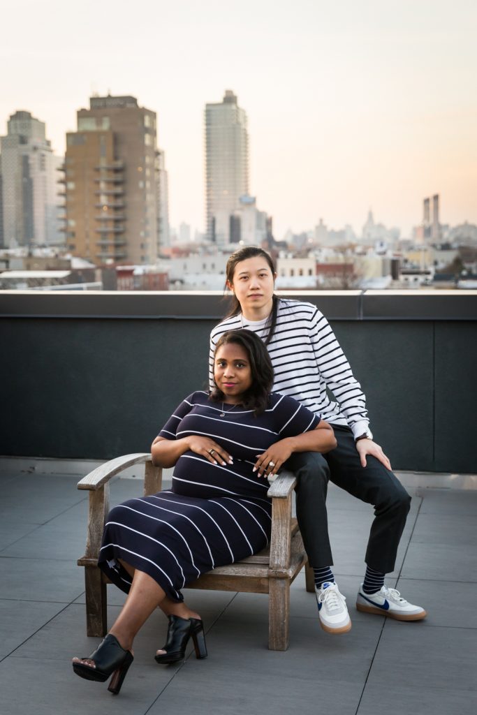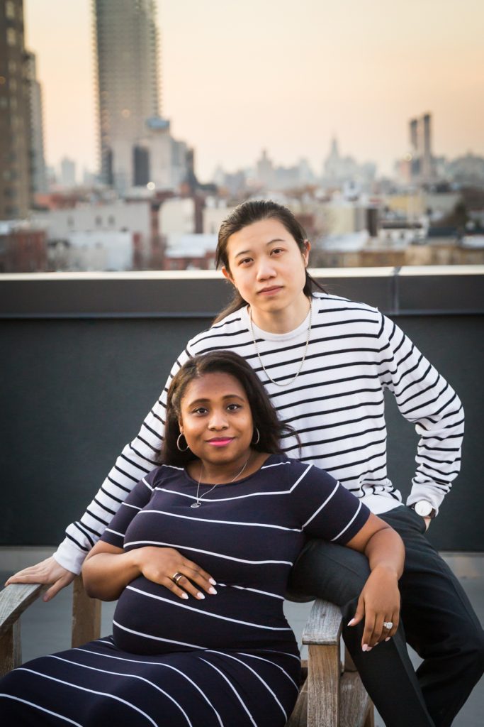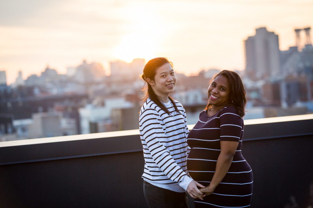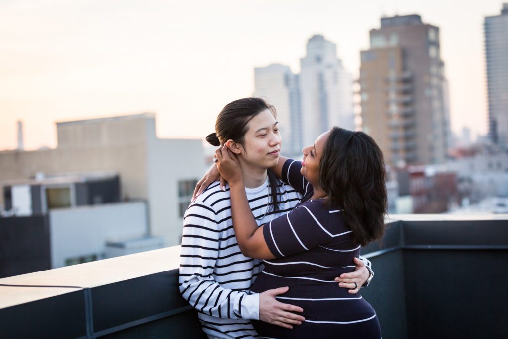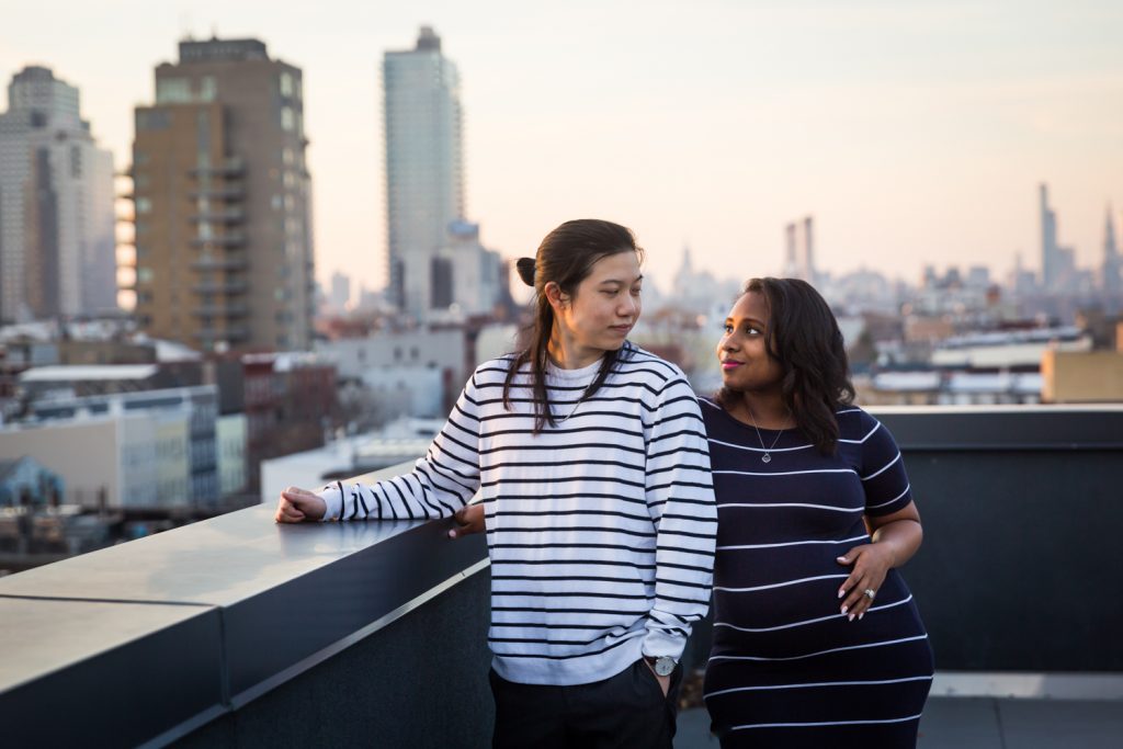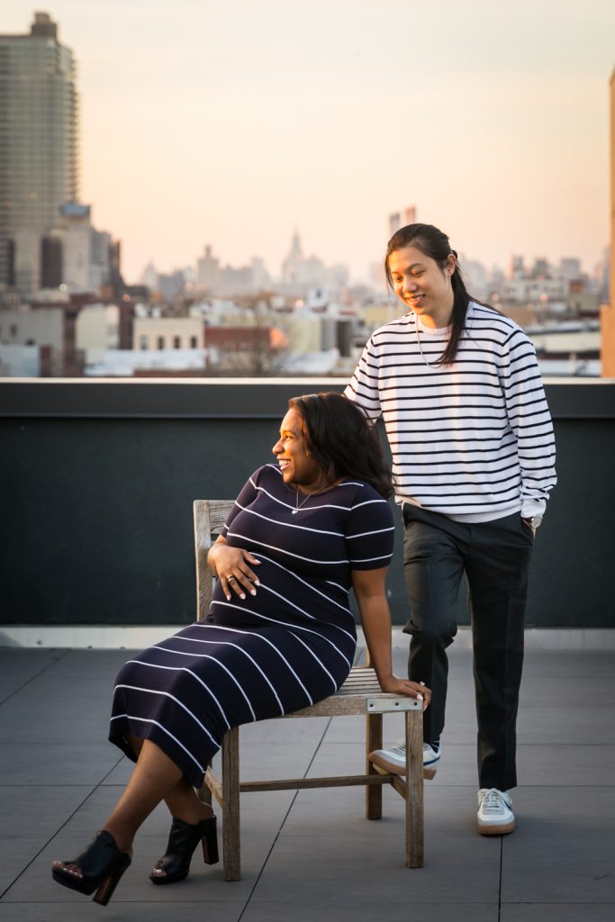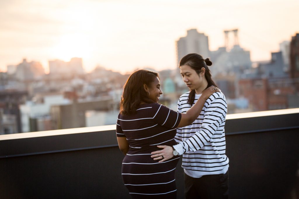 Use that roof! From the terrace, we next moved up to the roof. If you are lucky enough to have an apartment with any roof access, by all means take advantage of it for your photo shoot. You’ll need to check with your building management to make sure photos are allowed. Often there may be liability issues or the building management wants to restrict photo times to not inconvenience other residents. Elizabeth and Jeffrey’s roof space has a beautiful view overlooking the skyline of Manhattan and we hit the roof just as the sun was setting.