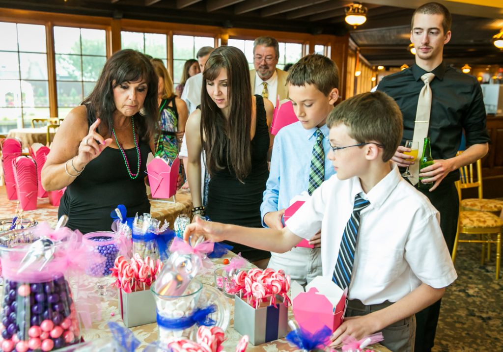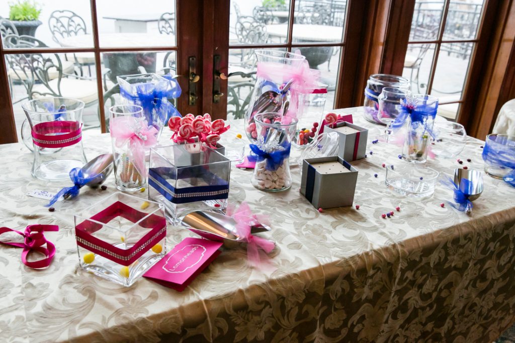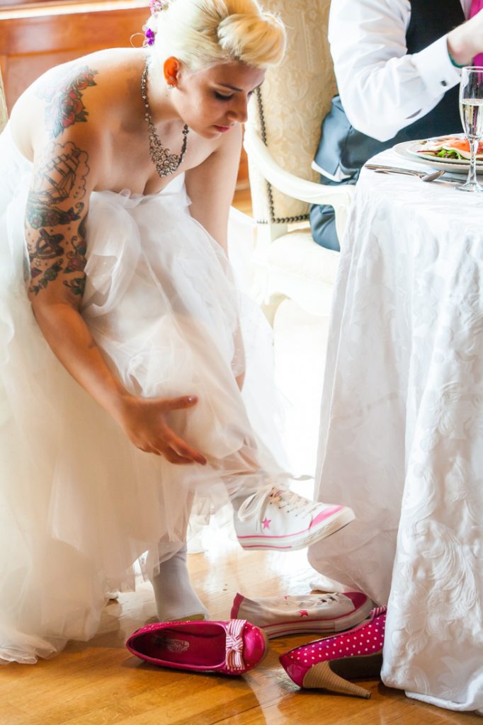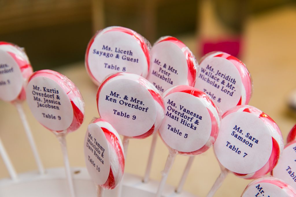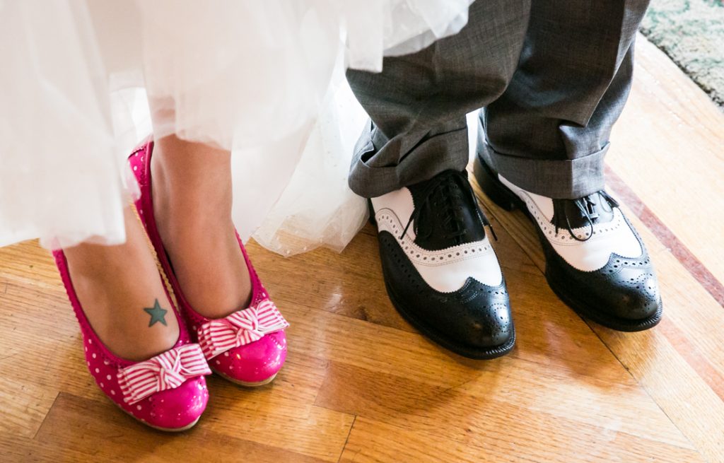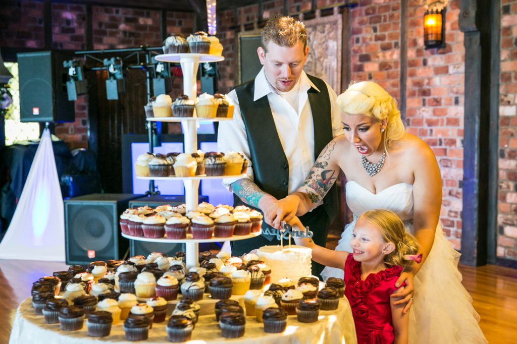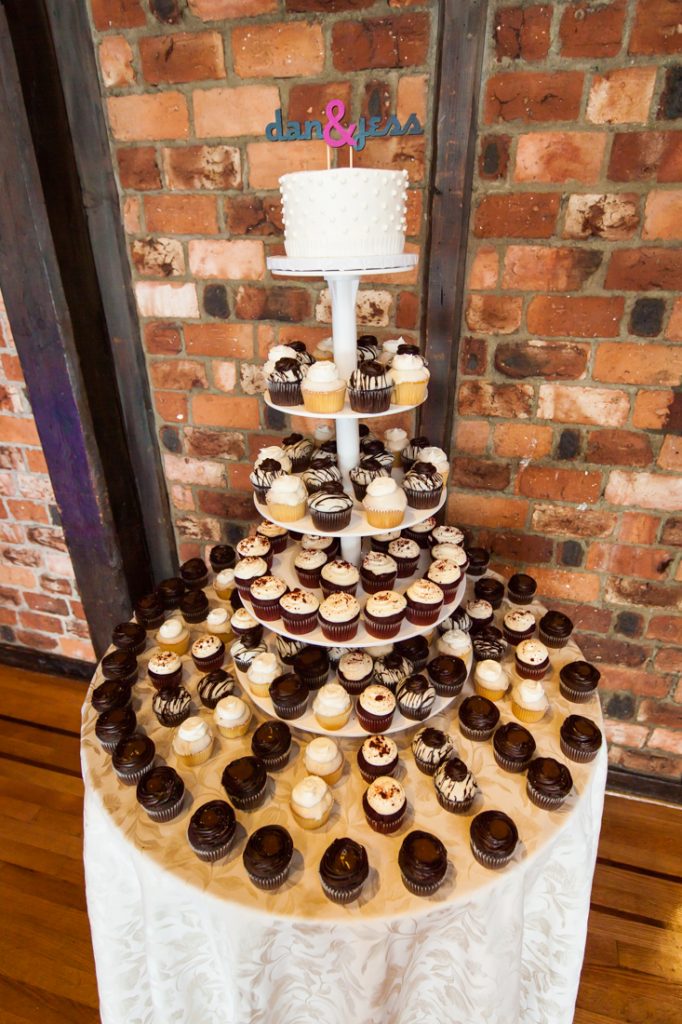 The reception itself focused on the dance floor action. Some notable aspects of the wedding include the bride’s love of pink shoes, from funky heels for the ceremony to the complimentary pink Converse tennis shoes for the reception. The couple chose a cupcake tower for their wedding cake, and guests were treated to a candy bar and dessert display at the end of the reception. And guests of all ages enjoyed the bubbles throughout the reception.