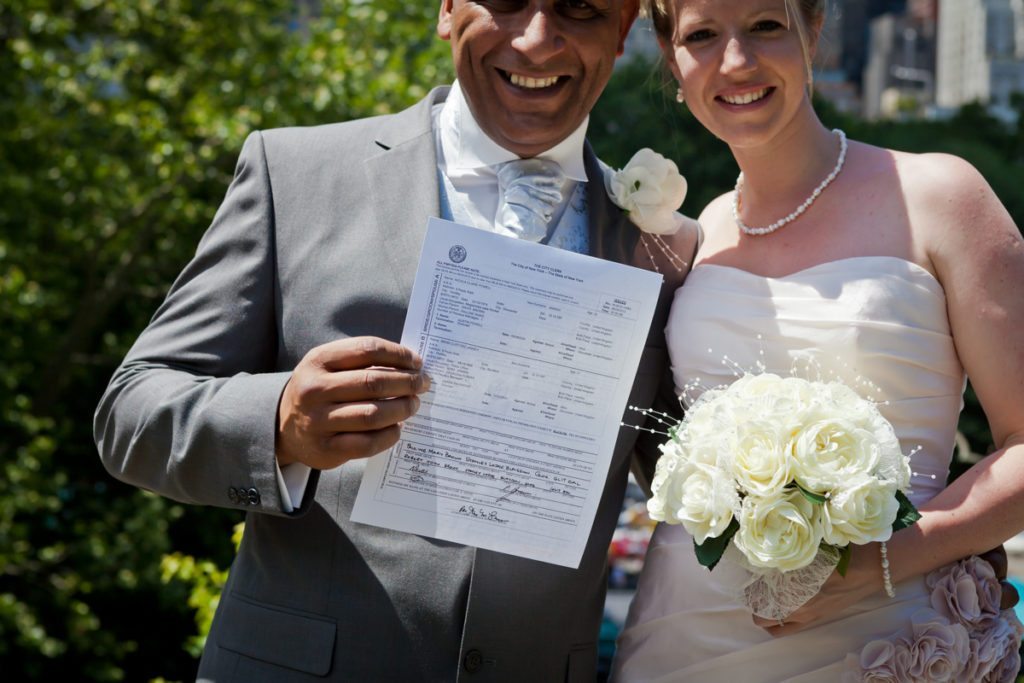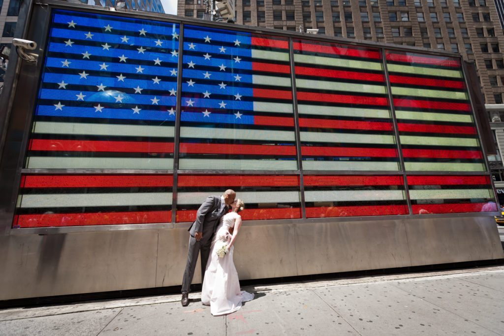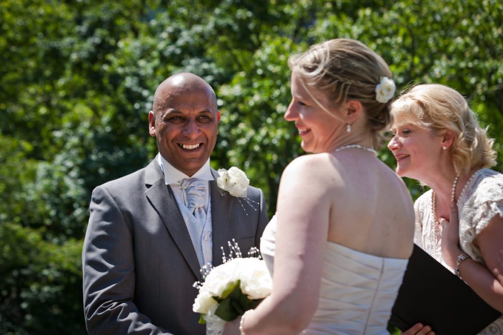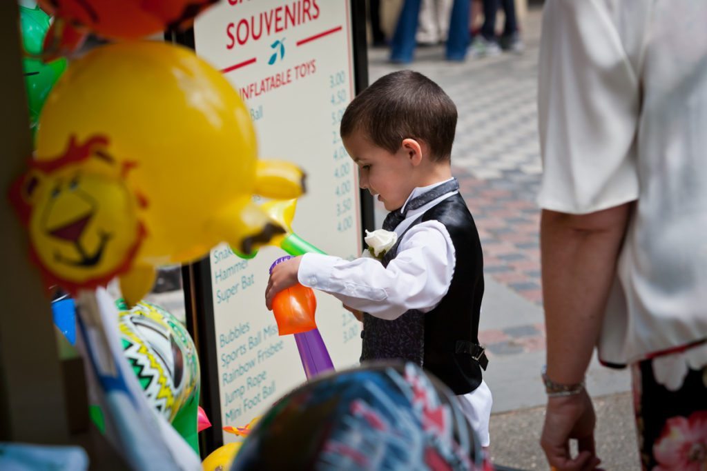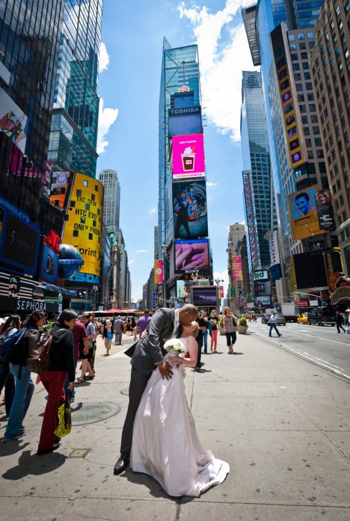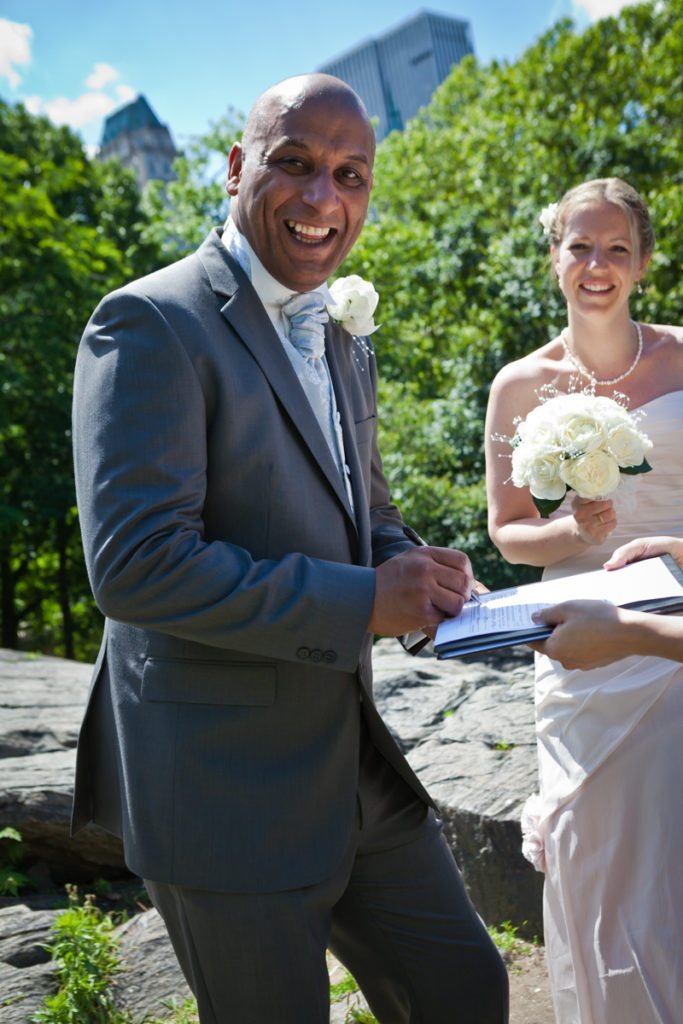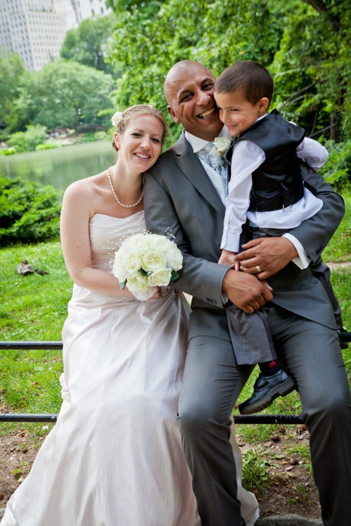 Congrats to Brian and Niki, who traveled all the way from the UK to get married in Central Park on June 6th! Their intimate wedding was a lovely testament to their beautiful relationship. The ceremony, conducted by Rev. Annie Lawrence, was held on Umpire Hill overlooking the amusement park area. Max, Brian and Niki’s son, was thrilled with the balloons and carousel which the whole family enjoyed immediately after the brief ‘I do’s.’ After the wedding, we stopped by Times Square for a few portraits of the bride and groom. Enjoy their lovely Central Park wedding photos!